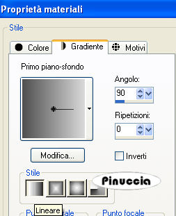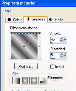 qui puoi trovare qualche risposta ai tuoi dubbi. Se l'argomento che ti interessa non è presente, ti prego di segnalarmelo. Questo tutorial è stato scritto con PSP X, ma può essere eseguito anche con le altre versioni di PSP. Il copyright del tutorial appartiene a Laguna Azul. Il copyright della traduzione è mio. Il copyright dei tubes e delle immagini è dei rispettivi artisti. Per favore, rispetta il lavoro degli autori. Occorrente: Materiale qui Filtro: Filters Unlimited 2.0 qui Toadies qui i filtri Toadies si possono anche usare importati in Filters Unlimited Xero qui Importa i pennelli in PSP (come fare vedi qui Malizia (facoltativa), applicare una tonalità grigia al tube della donna (Immagine>Scala di grigi), darà più risalto al fiore. 1. Apri una nuova immagine trasparente 650 x 550 pixels. Apri l'immagine di sfondo cs-seawaves, e vai a Modifica>Copia. Torna al tuo lavoro e vai a Modifica>Incolla come nuovo livello. Effetti>Plugins>Filters Unlimited 2.0 - Convolution Filters - Emboss(strong), con i settaggi standard. ![]() 2. Livelli>Nuovo livello raster. Scegli dal tube un colore scuro e impostalo come colore di primo piano (#4f4f4f) e un colore chiaro e impostalo come colore di sfondo (#d9d9d9). Passa il colore di primo piano a Gradiente di primo piano/sfondo con i seguenti settaggi: ![]() Riempi il livello con questo gradiente.Cambia la modalità di miscelatura di questo livello in Colore (L). 3. Apri il tube jet-woman21-november-2007, e vai a Modifica>Copia. Torna al tuo lavoro e vai a Modifica>Incolla come nuovo livello. Immagine>Ridimensiona, al 150%, tutti i livelli non selezionato. Sposta il tube a destra, come nell'esempio.![]() Cambia la modalità di miscelatura di questo livello in luce diffusa. 4. Modifica>Incolla come nuovo livello (il tube è ancora in memoria). Sposta il tube a destra, come nell'esempio.![]() Livelli>Duplica. Cambia la modalità di miscelatura di questo livello in Luce netta. Attiva il secondo livello dall'alto. Effetti>Effetti 3D>Sfalsa ombra, con i seguenti settaggi, colore nero: ![]() Attiva nuovamente il livello superiore. 5. Apri il tube V~CallaLiliesAtNoon, e vai a Modifica>Copia. Torna al tuo lavoro e vai a Modifica>Incolla come nuovo livello. Immagine>Ridimensiona, al 60%, tutti i livelli non selezionato. Sposta il tube a sinistra, contro il bordo.![]() Cambia la modalità di miscelatura di questo livello in Luce netta. Effetti>Effetti 3D>Sfalsa ombra, con i settaggi precedenti. 6. Livelli>Nuovo livello raster. Imposta il colore di primo piano con il bianco. Attiva lo strumento Pennello ![]() (per attivare lo strumento puoi usare anche il tasto B sulla tastiera). Cerca e seleziona il pennello la_fleurs, cambia la dimensione a 300 e applica il pennello con il colore di primo piano. Io l'ho applicato sul fiore. Effetti>Effetti 3D>Sfalsa ombra, con i seguenti settaggi, colore nero: ![]() 7. Livelli>Nuovo livello raster. Imposta il colore di primo piano con il nero. Seleziona il pennello la_linie, anche questo con dimensione 300, e applicalo in alto a sinistra, come nel mio esempio, con il colore di primo piano. Effetti>Effetti 3D>Sfalsa ombra, con i seguenti settaggi, colore bianco: ![]() Attiva lo strumento Testo , con i seguenti settaggi:![]() Imposta il colore di sfondo con il nero e scrivi il tuo nome sulle linee del pennello. Effetti>Effetti 3D>Sfalsa ombra, con i seguenti settaggi, colore nero: ![]() Livelli>Unisci>Unisci tutto. 8. Livelli>Nuovo livello raster. Selezione>Seleziona tutto. Effetti>Effetti 3D>Ritaglio, con i seguenti settaggi: ![]() Selezione>Deseleziona. Livelli>Unisci>Unisci tutto. 9. Immagine>Aggiungi bordatura, 1 pixel, simmetriche, con il colore nero. Immagine>Aggiungi bordatura, 5 pixels, simmetriche, con il colore #d9d9d9. Seleziona questo bordo con la bacchetta magica , sfumatura e tolleranza 0,![]() Effetti>Plugins>Graphics Plus - Cross Shadow, con i settaggi standard. ![]() Effetti>Effetti artistici>Mezzitoni, con i seguenti settaggi: ![]() Selezione>Deseleziona. Immagine>Aggiungi bordatura, 1 pixel, simmetriche, con il colore nero. 10. Immagine>Aggiungi bordatura, 5 pixels, simmetriche, con il colore #d9d9d9. Seleziona questo bordo con la bacchetta magica ![]() Effetti>Plugins>Toadies - What are You, con i seguenti settaggi: ![]() Selezione>Deseleziona. Ripeti il punto 9. 11. Immagine>Aggiungi bordatura, 12 pixels, simmetriche, con il colore #d9d9d9. Seleziona questo bordo con la bacchetta magica ![]() Imposta il colore di primo piano e il colore di sfondo con i colori del punto 2. Passa il colore di primo piano a Gradiente con i seguenti settaggi: ![]() Riempi la selezione con il gradiente.Effetti>Plugins>Xero - Fritillary, con i seguenti settaggi: Selezione>Deseleziona. 12. Ripeti ancora una volta il punto 9. Aggiungi, se vuoi, il tuo watermark, e salva in formato jpg. ![]() Se hai problemi o dubbi, o trovi un link non funzionante, o anche soltanto per un saluto, scrivimi. 12 Marzo 2008 |