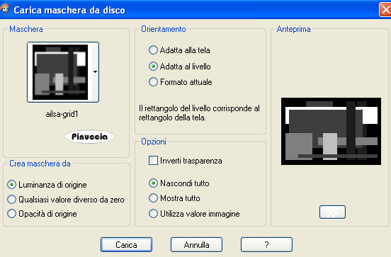qui puoi trovare qualche risposta ai tuoi dubbi. Se l'argomento che ti interessa non è presente, ti prego di segnalarmelo. Questo tutorial è stato scritto con PSP X, ma può essere eseguito anche con le altre versioni di PSP. Il copyright del tutorial appartiene a Laguna Azul. Il copyright della traduzione è mio. Il copyright dei tubes e delle immagini è dei rispettivi artisti. Per favore, rispetta il lavoro degli autori. Occorrente: Materiale qui Filtro: Graphics Plus qui Tramages qui Ti servirà anche Animation Shop qui 1. Apri una nuova immagine nera 680 x 460 pixels. Apri il tube RedPetals_MistedByGini_12_09_06, e vai a Modifica>Copia. Torna al tuo lavoro e vai a Modifica>Incolla come nuovo livello. Immagine>Ridimensiona, al 60%, tutti i livelli non selezionato. Sposta la rosa nell'angolo in basso a sinistra.Abbassa l'opacità di questo livello al 30%. 2. Apri il tube lanterne-tubed by dragonblu240507, e vai a Modifica>Copia. Torna al tuo lavoro e vai a Modifica>Incolla come nuovo livello. Spostalo a sinistra.Effetti>Effetti 3D>Sfalsa ombra, con i seguenti settaggi, colore #ffb46b. ![]() Abbassa l'opacità di questo livello al 60%. 3. Apri il tube mds7590 Cityscape, e vai a Modifica>Copia. Torna al tuo lavoro e vai a Modifica>Incolla come nuovo livello. Spostalo a destra.![]() Apri il tube la_moon, e vai a Modifica>Copia. Torna al tuo lavoro e vai a Modifica>Incolla come nuovo livello. Sposta la luna a sinistra del Big Ben, o dove preferisci.Apri il tube PatryMists_NewYear01, e vai a Modifica>Copia. Torna al tuo lavoro e vai a Modifica>Incolla come nuovo livello. Posizionalo come nell'esempio.![]() 4. Apri il tube la_sektkorken, e vai a Modifica>Copia. Torna al tuo lavoro e vai a Modifica>Incolla come nuovo livello. Spostalo nell'angolo in basso a sinistra.Cambia la modalità di miscelatura di questo livello in Filtra. Apri il tube la_misc-21, e vai a Modifica>Copia. Torna al tuo lavoro e vai a Modifica>incolla come nuovo livello. Immagine>Ridimensiona, al 45%, tutti i livelli non selezionato. Regola>Messa a fuoco>Metti a fuoco. Spostalo in basso a sinistra.![]() 5. Livelli>Nuovo livello raster. Riempi con il colore #b29731.Livelli>Carica/Salva maschera>Carica maschera da disco. Cerca e carica la maschera ailsa-grid1, con i seguenti settaggi. ![]() Livelli>Unisci>Unisci gruppo. Sposta la maschera come nell'esempio.![]() Effetti>Effetti di bordo>Aumenta. Cambia la modalità di miscelatura di questo livello in Sovrapponi. 6. Apri il tube IDIMistCouple18@251.8.61, e vai a Modifica>Copia. Torna al tuo lavoro e vai a Modifica>Incolla come nuovo livello. Spostalo nell'angolo in basso a destra.![]() Livelli>Unisci>Unisci tutto. 7. Immagine>Aggiungi bordatura, 1 pixel, simmetriche, con il colore nero. Immagine>Aggiungi bordatura, 10 pixels, simmetriche, con il colore #b29731. Seleziona il bordo con la bacchetta magica , sfumatura e tolleranza 0,![]() Effetti>Plugins>Graphics Plus - Cross Shadow, con i settaggi standard. ![]() Selezione>Deseleziona. 8. Immagine>Aggiungi bordatura, 1 pixel, simmetriche, con il colore nero. Immagine>Aggiungi bordatura, 20 pixels, simmetriche, con il colore #b29731. Seleziona questo bordo con la bacchetta magica ![]() Effetti>Plugins>Tramages - Cirquelate, con i settaggi standard: ![]() Mantieni selezionato. Livelli>Duplica. Immagine>Rifletti. Immagine>Capovolgi. Selezione>Deseleziona. Seleziona con la bacchetta magica la parte gialla della cornice.![]() Premi sulla tastiera il tasto CANC ![]() Selezione>Deseleziona. Livelli>Unisci>Unisci tutto. 9. Selezione>Seleziona tutto. Selezione>modifica>Contrai, di 20 pixels. Selezione>Inverti. Effetti>Plugins>Graphics Plus - Cross Shadow, con i settaggi standard. Effetti>Effetti 3D>Smusso a incasso, con i seguenti settaggi: ![]() Selezione>Deseleziona. Immagine>Aggiungi bordatura, 1 pixel, simmetriche, con il colore nero. Aggiungi il tuo watermark. Livelli>Unisci>Unisci tutto.