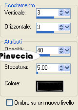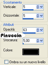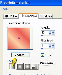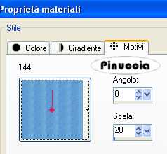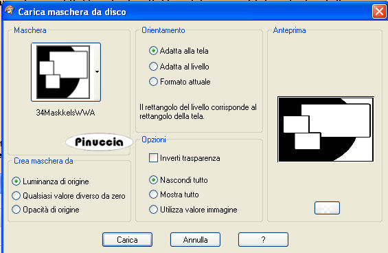 qui puoi trovare qualche risposta ai tuoi dubbi. Se l'argomento che ti interessa non è presente, ti prego di segnalarmelo. Questo tutorial è stato scritto con PSP 9, ma può essere eseguito anche con le altre versioni di PSP. Il copyright del tutorial appartiene a Laguna Azul. Il copyright della traduzione è mio. Il copyright dei tubes e delle immagini è dei rispettivi artisti. Per favore, rispetta il lavoro degli autori. Occorrente: Materiale qui Filtri: Graphics Plus qui Penta.com qui Metti le Maschere nella cartella Maschere. 1. Apri una nuova immagine trasparente 700 x 480 pixels. Imposta il colore di primo piano con #fbd0a5, e il colore di sfondo con #ea5b54. Passa il colore di primo piano a Gradiente di primo piano/sfondo, con i seguenti settaggi: ![]() Riempi l'immagine trasparente con questo gradiente.Regola>Sfocatura>Sfocatura gaussiana, raggio 30. ![]() 2. Effetti>Plugins>Penta.com - Jeans, con i settaggi standard. ![]() 3. Livelli>Nuovo livello raster. Selezione>Seleziona tutto. Apri l'immagine "171", e vai a Modifica>Copia. Torna al tuo lavoro e vai a Modifica>Incolla>Incolla nella selezione. Selezione>Nessuna selezione. Cambia la modalità di miscelatura di questo livello in Luce diffusa. 4. Apri il tube PatryMists_IceSully, e vai a Modifica>Copia. Torna al tuo lavoro e vai a Modifica>Incolla>Incolla come nuovo livello. Sposta il tube nell'angolo in basso a sinistra.Cambia la modalità di miscelatura di questo livello in Filtra. Livelli>Duplica. Cambia la modalità di miscelatura di questo livello in Sovrapponi. 5. Apri il tube ccrystal_Mlips177-1, e vai a Modifica>Copia. Torna al tuo lavoro e vai a Modifica>Incolla>Incolla come nuovo livello. Immagine>Ridimensiona, al 70%, tutti i livelli non selezionato. Sposta il tube nell'angolo in alto a sinistra.Livelli>Carica/Salva maschera>Carica maschera da disco. Cerca e carica la maschera 20-20: ![]() Livelli>Unisci>Unisci gruppo. 6. Apri il tube sil45, e vai a Modifica>copia. Torna al tuo lavoro e vai a Modifica>Incolla>Incolla come nuovo livello. Sposta il tube a destra come preferisci.![]() Apri il tube "cherry 1", e vai a Modifica>Copia. Torna al tuo lavoro e vai a Modifica>Incolla>Incolla come nuovo livello. Posiziona sopra la pallina nella bocca della donna.![]() Livelli>Unisci>Unisci giù. Livelli>Carica/Salva maschera>Carica maschera da disco. Cerca e carica la maschera 20-20, con i settaggi precedenti. Livelli>Unisci>Unisci gruppo. 7. Apri il tube cherryice_cc_04, e vai a Modifica>copia. Torna al tuo lavoro e vai a Modifica>Incolla>Incolla come nuovo livello. Immagine>Rifletti. Immagine>Ridimensiona, al 70%, tutti i livelli non selezionato. Cambia la modalità di miscelatura di questo livello in Moltiplica, e posiziona il tube come preferisci.8. Apri il tube MYB_Swankcherry_1, e vai a Modifica>Copia. Torna al tuo lavoro e vai a Modifica>Incolla>Incolla come nuovo livello. Immagine>Ridimensiona, all'80%, tutti i livelli non selezionato. Sposta il tube a sinistra, o come preferisci.Effetti>Effetti 3d>Sfalsa ombra, con i seguenti settaggi: ![]() 9. Livelli>Nuovo livello raster. Riempi il livello con il gradiente.Livelli>Carica/Salva maschera>Carica maschera da disco. Cerca e carica la maschera 34MaskkelsWWA: ![]() Livelli>Unisci>Unisci gruppo. Effetti>Effetti di trama>Veneziana, con i seguenti settaggi: ![]() Nella paletta dei livelli trascina questo livello sopra il quarto livello dal basso. ![]() Effetti>Effetti 3D>Sfalsa ombra, con i seguenti settaggi. ![]() 10. Controlla che tutto sia al posto giusto e vai a Livelli>Unisci>Unisci tutto. Immagine>Aggiungi bordatura, 1 pixel, simmetriche, con il colore #45201d. Immagine>Aggiungi bordatura, 10 pixels, simmetriche, con il colore bianco. Seleziona questo bordo con la bacchetta magica ![]() ![]() Riempi la selezione con il gradiente.Mantieni selezionato. 11. Livelli>Nuovo livello raster. Apri l'immagine "144" e minimizzala. Passa il colore di primo piano a Motivi e seleziona l'immagine, con i seguenti settaggi: ![]() Riempi la selezione con questo motivo.Cambia la modalità di miscelatura di questo livello in Luminanza (esistente). Selezione>inverti. Effetti>Effetti 3D>Sfalsa ombra, con i settaggi usati al punto 9. ![]() Ripeti l'Effetto Sfalsa ombra, ma cambiando verticale e orizzontale a -3. 12. Immagine>Aggiungi bordatura, 1 pixel, simmetriche, con il colore #45201d. Immagine>Aggiungi bordatura, 3 pixels, simmetriche, con il colore bianco. Seleziona il bordo con la bacchetta magica ![]() e riempilo con il gradiente. Immagine>Aggiungi bordatura, 1 pixel, simmetriche, con il colore #45201d. 13. Immagine>Aggiungi bordatura, 5 pixels, simmetriche, con il colore bianco. Seleziona il bordo con la bacchetta magica ![]() e riempilo con il gradiente.Effetti>Plugins>Graphics Plus - Cross Shadow, con i settaggi standard. ![]() Effetti>Plugins>Penta.com - Dot and Cross, con i settaggi standard. ![]() Immagine>Aggiungi bordatura, 10 pixels, simmetriche, con il colore bianco. Seleziona il bordo con la bacchetta magica ![]() e riempilo con il gradiente.Livelli>Nuovo livello raster. Riempi con il motivo "144".Cambia la modalità di miscelatura di questo livello in Luminanza (esistente). Selezione>inverti. Effetti>Effetti 3D>Sfalsa ombra, con i settaggi precedenti, e ripeti con il segno negativo. Selezione>Nessuna selezione. Immagine>Aggiungi bordatura, 1 pixel, simmetriche, con il colore #45201d. Aggiungi il tuo nome e/o il tuo watermark e salva in formato jpg. ![]() Se hai problemi o dubbi, o trovi un link non funzionante, o anche soltanto per un saluto, scrivimi. 3 Marzo 2008 |
