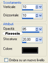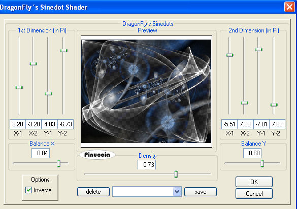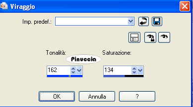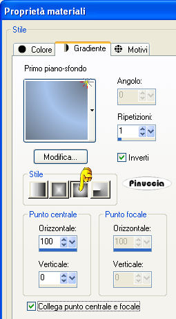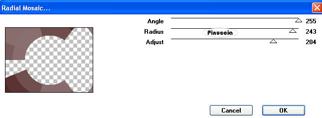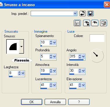 qui puoi trovare qualche risposta ai tuoi dubbi. Se l'argomento che ti interessa non è presente, ti prego di segnalarmelo. Questo tutorial è stato scritto con PSP 9, ma può essere eseguito anche con le altre versioni di PSP. Per tradurlo, l'ho eseguito con PSP X. Il copyright del tutorial appartiene a Laguna Azul. Il copyright della traduzione è mio. Il copyright dei tubes e delle immagini è dei rispettivi artisti. Per favore, rispetta il lavoro degli autori. Occorrente: Un frattale a scelta come immagine di sfondo. Il resto del materiale qui Filtro: Filters Unlimited 2.0 qui Sinedots 1 qui VM Toolbox qui Ti servirà anche Animation Shop qui Imposta il colore chiaro #a7c3eb come colore di primo piano, e il colore scuro #6b7786 come colore di sfondo. Passa il colore di primo piano a Gradiente di primo piano/sfondo, con i seguenti settaggi: ![]() 2. Apri il frattale di sfondo e vai a Modifica>Copia. Torna al tuo lavoro e vai a Modifica>Incolla come nuovo livello. Cambia la modalità di miscelatura di questo livello in Luminanza (esistente), e abbassa l'opacità al 60%. Effetti>Plugins>Filters Unlimited 2.0 - Convolution Filters - Emboss(strong), con i settaggi standard. ![]() Livelli>Duplica, e chiudi questo livello. Attiva il livello Raster 2. 3. Apri il tube PatryMists_06_Cityscape_071, e vai a Modifica>Copia. Torna al tuo lavoro e vai a Modifica>Incolla come nuovo livello. Sposta il tube un po' più a sinistra.Cambia la modalità di miscelatura di questo livello in Luce netta. ![]() 4. Rendi nuovamente visibile e attiva il livello superiore. Effetti>Plugins>Dragonfly - Sinedot, con i seguenti settaggi: ![]() Attendi, perchè l'applicazione del filtro impiegherà qualche secondo. ![]() Cambia la modalità di miscelatura di questo livello in Sovrapponi, e abbassa l'opacità al 34%. ![]() ![]() 5. Apri il tube fractal_art_la, e vai a Modifica>copia. Torna al tuo lavoro e vai a Modifica>Incolla come nuovo livello. Sposta il tube nell'angolo in alto a sinistra.Cambia la modalità di miscelatura di questo livello in Luminanza. 6. Cambia i colori del gradiente scegliendoli dal tube della donna (o dal tube che hai deciso di usare). Come colore di primo piano ho usato il colore chiaro #9f8989), e come colore di sfondo il colore scuro #390808. Apri l'immagine ART_LA. Seleziona le strisce con la bacchetta magica ![]() ![]() e riempi le strisce con il gradiente.Selezione>Deseleziona. Modifica>Copia. Torna al tuo lavoro e vai a Modifica>Incolla come nuovo livello. 7. Effetti>Plugins>VM Toolbox - Radial Mosaic, con i seguenti settaggi. ![]() Immagine>Rifletti. Attiva lo strumento Gomma ![]() e cancella gli angoli in alto a in basso a sinistra: ![]() ![]() 8. Selezione>Seleziona tutto. Selezione>Mobile. Selezione>Modifica>Contrai, di 20 pixels. Livelli>Nuovo livello raster. Riempi la selezione con il colore di sfondo.Selezione>Modifica>Contrai, di 3 pixels. Premi sulla tastiera il tasto CANC ![]() Selezione>Deseleziona. Cambia la modalità di miscelatura del livello superiore in Rafforza, e del livello sottostante in Indebolisci. ![]() 9. Apri il tube Mc2256, e vai a Modifica>copia. Torna al tuo lavoro e vai a Modifica>Incolla come nuovo livello. Sposta questo tube a destra.Livelli>Duplica, 2 volte. Livelli>Unisci>Unisci giù, e ripeti. Effetti>Effetti 3D>Sfalsa ombra, con i seguenti settaggi, colore nero: ![]() 10. Apri il tube Ala-creative1, e vai a Modifica>Copia. Torna al tuo lavoro e vai a Modifica>Incolla come nuovo livello. Spostalo a sinistra, come nell'esempio:![]() Cambia la modalità di miscelatura di questo livello in Sovrapponi. Livelli>Duplica. Livelli>Unisci>Unisci tutto. 11. Immagine>Aggiungi bordatura, 1 pixel, simmetriche, con il colore nero. Immagine>Aggiungi bordatura, 8 pixels, simmetriche, con il colore bianco. Seleziona questo bordo con la bacchetta magica .Effetti>Plugins>Simple - Diamonds. Regola>Saturazione e tonalità>Viraggio: ![]() Effetti>Plugins>Filters Unlimited 2.0 - Convolution Filters - Emboss(strong), con i settaggi standard, 2 volte. Selezione>Deseleziona. 12. Immagine>Aggiungi bordatura, 8 pixels, simmetriche, con un colore giallo. Seleziona il bordo con la bacchetta magica ![]() e riempilo con il gradiente del punto 1.Regola>Saturazione e tonalità>Viraggio, con i settaggi usati al punto 11. Effetti>Effetti di trama>Veneziana, con i seguenti settaggi: ![]() Selezione>Inverti. Effetti>Effetti 3D>Sfalsa ombra, con i seguenti settaggi, colore nero: ![]() Ripeti l'Effetto Sfalsa ombra cambiando verticale e orizzontale con -2. ![]() Selezione>Deseleziona. 13. Immagine>Aggiungi bordatura, 20 pixels, simmetriche, con il colore bianco. Seleziona questo bordo con la bacchetta magica .Effetti>Plugins>Simple - Diamonds. Regola>Saturazione e tonalità>Viraggio, con i settaggi precedenti. Effetti>Plugins>Filters Unlimited 2.0 - Convolution Filters - Emboss(strong), con i settaggi standard, 2 volte. Effetti>Effetti 3D>Smusso a incasso: ![]() Selezione>Deseleziona. Aggiungi il tuo nome e/o il tuo watermark. Livelli>Unisci>Unisci tutto. ![]() Per creare l'animazione, copia l'immagine: Modifica>Copia. 14. Apri Animation Shop e vai a Modifica>Incolla>Incolla come nuova animazione. Modifica>Duplica, e ripeti finchè non avrai ottenuto 13 fotogrammi. per fare questo, puoi anche usare la barra superiore degli strumenti. Clicca sull'icona Copia e quindi Incolla dopo le volte necessarie per ottenere i fotogrammi. ![]() Apri l'animazione "kugel". Clicca sul primo fotogramma per selezionarlo e vai a Modifica>Seleziona tutto, e poi Modifica>Copia. Torna al tuo lavoro e vai a Modifica>Incolla>Incolla nel fotogramma selezionato. Posiziona l'animazione e, quando sei certo di aver trovato la posizione corretta, rilascia il tasto del mouse. Controlla il risultato cliccando su Visualizza e salva in formato gif.![]() Se hai problemi o dubbi, o trovi un link non funzionante, o anche soltanto per un saluto, scrivimi. 18 Marzo 2008 |