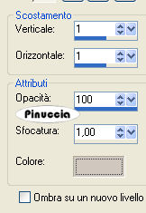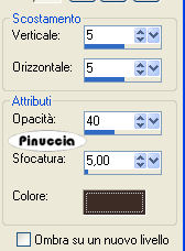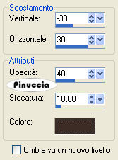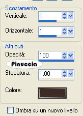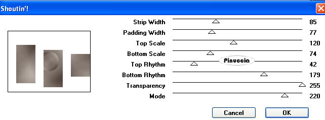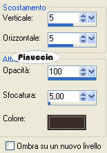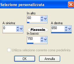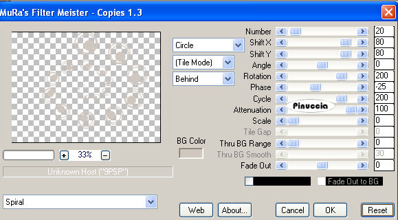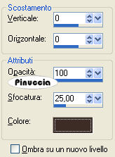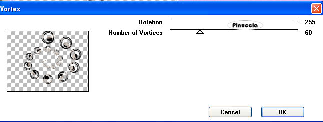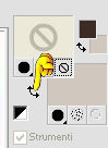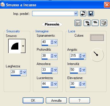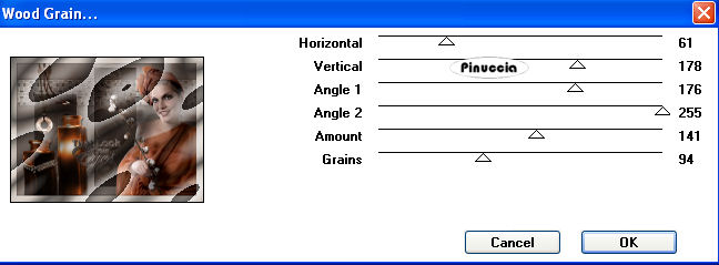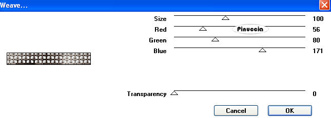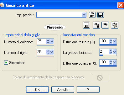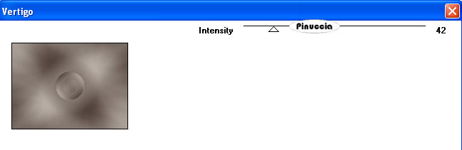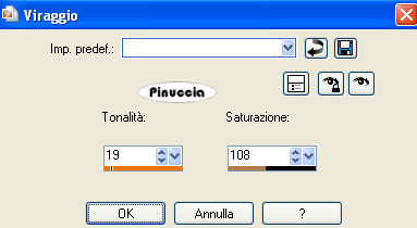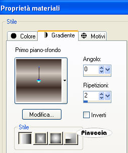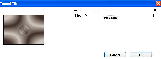 qui puoi trovare qualche risposta ai tuoi dubbi. Se l'argomento che ti interessa non è presente, ti prego di segnalarmelo. Questo tutorial è stato scritto con PSP X, ma può essere eseguito anche con le altre versioni di PSP. Il copyright del tutorial appartiene a Laguna Azul. Il copyright della traduzione è mio. Il copyright dei tubes e delle immagini è dei rispettivi artisti. Per favore, rispetta il lavoro degli autori. Occorrente: Materiale qui Filtri: Filter Factory Gallery A qui Filter Factory Gallery D qui Mura's Meister qui Xero qui i filtri Factory Gallery per essere usati devono prima essere convertiti. Come fare vedi qui I filtri Factory Gallery D forniti in questo tutorial sono già convertiti). 1. Apri una nuova immagine trasparente 650 x 480 pixels. Imposta il colore di primo piano con un colore chiaro scelto dal tuo tube (io ho usato #d0c7bf), e il colore di sfondo con un colore scuro (io ho usato #3d2d26). Passa il colore di primo piano a Gradiente di primo piano/sfondo, con i seguenti settaggi: ![]() Riempi l'immagine trasparente con il gradiente.2. Effetti>Plugins>Filter Factory Gallery D - Tunnel Tile, con i seguenti settaggi: ![]() 3. Effetti>Plugins>Filter Factory Gallery D - Vertigo, con i seguenti settaggi: ![]() Livelli>Duplica. 4. Effetti>Plugins>Filter Factory Gallery D - Shoutin'!, con i seguenti settaggi: ![]() Cambia la modalità di miscelatura di questo livello in Moltiplica. Effetti>Effetti di bordo>Aumenta. 5. Attiva lo strumento Forme - Ellisse ![]() (puoi attivarlo anche premendo sulla tastiera il tasto Q), chiudi il colore di sfondo e imposta i seguenti settaggi: ![]() Traccia un cerchio non troppo grande, circa come nell'esempio: ![]() Livelli>Converti in livello raster. Traccia un secondo cerchio, un po' più piccolo del primo. Livelli>Converti in livello raster. Inverti i colori nella paletta dei materiali, cliccando sulla freccia in mezzo alle palette. ![]() Traccia un altro cerchio ancora più piccolo dei precedenti. Livelli>Converti in livello raster. Cambia nuovamente il colore di sfondo con il colore di primo piano. Posiziona i cerchi come nell'esempio. ![]() 6. Chiudi i due livelli inferiori e attiva il livello superiore. ![]() Livelli>Unisci>Unisci visibile. Rendi nuovamente visibili i due livelli inferiori. Adesso gli anelli dovrebbero trovarsi al centro dell'immagine. 7. Effetti>Plugins>Mura's Meister - Copies, con i seguenti settaggi. ![]() Cambia la modalità di miscelatura di questo livello in Luce diffusa. Effetti>Effetti 3D>Sfalsa ombra, con i seguenti settaggi, con il colore di sfondo. ![]() 8. Effetti>Plugins>Filter Factory Gallery D - Vortex, con i seguenti settaggi: ![]() 9. Effetti>Plugins>Xero - Porcelain, con i seguenti settaggi: ![]() 10. Apri il tube SKF_Bottle259.07, e vai a Modifica>Copia. Torna al tuo lavoro e vai a Modifica>Incolla come nuovo livello. Seleziona le foglie:![]() e premi sulla tastiera il tasto CANC. Selezione>Deseleziona. Immagine>Ridimensiona, al 70%, tutti i livelli non selezionato. Regola>Messa a fuoco>Metti a fuoco. 11. Regola>Saturazione e tonalità>Viraggio: ![]() se stai usando altri colori, vedi qui le regole del Viraggio per cambiare i colori del tube. Sposta le bottiglie nell'angolo in basso a sinistra.Effetti>Effetti 3D>Sfalsa ombra, con i seguenti settaggi, con il colore di sfondo. ![]() Livelli>Duplica. Cambia la modalità di miscelatura di questo livello in Luce netta. Livelli>Unisci>Unisci tutto. Livelli>Duplica. 12. Attiva lo strumento Selezione (o premi sulla tastiera il tasto S),clicca sull'icona Selezione personalizzata ![]() e imposta i seguenti settaggi: ![]() Selezione>inverti. Premi sulla tastiera il tasto CANC ![]() Selezione>inverti. Effetti>Plugins>Filter Factory Gallery A - Weave, con i seguenti settaggi. ![]() Effetti>Effetti 3D>Sfalsa ombra, con i seguenti settaggi, con il colore di sfondo. ![]() Selezione>Deseleziona. Effetti>Effetti di bordo>Aumenta. 13. Apri il tube s233t2, e vai a Modifica>Copia. Torna al tuo lavoro e vai a Modifica>Incolla come nuovo livello. Immagine>Ridimensiona, al 50%, tutti i livelli non selezionato. Regola>Messa a fuoco>Metti a fuoco. Sposta il tube in alto, in modo che il nastro non sia visibile.14. Apri il tube jet-woman11-september-2007, e vai a Modifica>Copia. Torna al tuo lavoro e vai a Modifica>Incolla come nuovo livello. Immagine>Ridimensiona, al 72%, tutti i livelli non selezionato. Regola>Messa a fuoco>Metti a fuoco. Sposta il tube a destra.Effetti>effetti 3D>Sfalsa ombra, con i seguenti settaggi, con il colore di sfondo. ![]() 15. Apri il tube script-94, e vai a Modifica>Copia. Torna al tuo lavoro e vai a Modifica>Incolla come nuovo livello. Se necessario (nel caso abbia usato un tube con altri colori), usa il viraggio. Effetti>Effetti 3D>Sfalsa ombra, con i seguenti settaggi, con il colore di primo piano. ![]() Effetti>Effetti 3D>Sfalsa ombra, con i seguenti settaggi, con il colore di sfondo. ![]() Sposta il testo come preferisci.Livelli>Unisci>Unisci tutto. 16. Immagine>Aggiungi bordatura, 1 pixel, simmetriche, con il colore di sfondo. Immagine>Aggiungi bordatura, 20 pixels, simmetriche, con il colore di primo piano. Seleziona questo bordo con la bacchetta magica ![]() ![]() Effetti>Plugins>Filter Factory Gallery A - Wood Grain, con i seguenti settaggi: ![]() Selezione>Inverti. Effetti>Effetti 3D>sfalsa ombra, con i seguenti settatti, con il colore nero. ![]() Selezione>Deseleziona. 17. Immagine>Aggiungi bordatura, 1 pixel, simmetriche, con il colore di sfondo. Immagine>Aggiungi bordatura, 5 pixels, simmetriche, con il colore di primo piano. Seleziona questo bordo con la bacchetta magica ![]() Effetti>effetti di trama>Mosaico antico, con i seguenti settaggi: ![]() 18. Mantieni selezionato. Effetti>Effetti 3D>Smusso a incasso, con i seguenti settaggi, con il colore di primo piano: ![]() Selezione>Deseleziona. Immagine>Aggiungi bordatura, 1 pixel, simmetriche, con il colore di sfondo. Aggiungi il tuo nome e/o il tuo watermark e salva in for