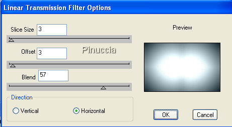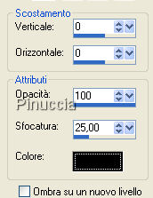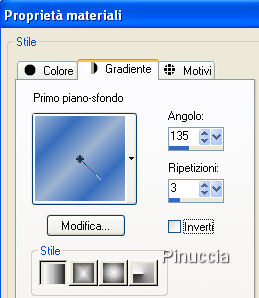 qui puoi trovare qualche risposta ai tuoi dubbi. Se l'argomento che ti interessa non è presente, ti prego di segnalarmelo. Il copyright del tutorial appartiene a Laguna Azul. Il copyright della traduzione è mio. Il copyright dei tubes e delle immagini è dei rispettivi artisti. Per favore, rispetta il lavoro degli autori. Occorrente: Materiale qui Filtri: Dsb Flux qui Harry's Filters qui vedi la scheda relativa a questo filtro qui Ti servirà anche Animation Shop qui 1. Apri una nuova immagine trasparente 750 x 480 pixels. Scegli dal tuo tube un colore chiaro come colore di primo piano (io ho usato #9eb3d1), e un colore scuro come colore di sfondo (io ho usato #386ebc). Riempi l'immagine trasparente con il colore di primo piano.2. Livelli>Nuovo livello raster. Riempi nuovamente con il colore di primo piano.Effetti>Plugins>Harry's Power Grads - Double Sphere Gradients, con i seguenti settaggi: ![]() Cambia la modalità di miscelatura di questo livello in Luminanza (esistente), e abbassa l'opacità al 50%. 3. Effetti>Plugins>Dsb Flux - Linear Transmission, con i seguenti settaggi: ![]() Apri l'immagine "Back" e vai a Modifica>copia. Torna al tuo lavoro e vai a Modifica>Incolla>Incolla come nuovo livello. Cambia la modalità di miscelatura di questo livello in Sovrapponi, e abbassa l'opacità all'80%. 4. Livelli>Nuovo livello raster. Selezione>Seleziona tutto. Selezione>Modifica>Contrai, 20 pixels. Passa il colore di primo piano a Gradiente di primo piano/sfondo, con i seguenti settaggi: ![]() Riempi la selezione con il gradiente.Selezione>Modifica>Contrai, 3 pixels. Premi sulla tastiera il tasto CANC ![]() 5. Effetti>Effetti 3D>Sfalsa ombra, con i seguenti settaggi: ![]() Livelli>Nuovo livello raster. Attiva lo strumento Selezione , rettangolo, con i seguenti settaggi.![]() e traccia un rettangolo come nell'esempio. ![]() 6. Riempi la selezione con il gradiente.Selezione>modifica>Contrai, 3 pixels. Premi sulla tastiera il tasto canc. Selezione>Nessuna selezione. Effetti>Effetti 3D>Sfalsa ombra, con i settaggi precedenti. 7. Sposta il rettangolo a un distanza di circa un centimento dal bordo superiore e da destra.Livelli>Duplica. Immagine>Rifletti. Immagine>Capovolgi. 8. Apri il tube "city", e vai a Modifica>Copia. Torna al tuo lavoro, attiva il secondo livello dall'alto e vai a Modifica>Incolla>Incolla come nuovo livello. Sposta il tube dentro il rettangolo inferiore, cancellando - se necessario - ciò che rimane fuori dal rettangolo.Cambia la modalità di miscelatura di questo livello in Luce Netta, e abbassa l'opacità al 50%. Livelli>Duplica. Cambia la modalità di miscelatura di questo livello in Sovrapponi. ![]() 9. Attiva il livello superiore. Apri il tube AH_anime_06_071, e vai a Modifica>Copia. Torna al tuo lavoro e vai a Modifica>Incolla>Incolla come nuovo livello. Spostalo nel rettangolo superiore, sopra l'intreccio delle due cornici.Effetti>Effetti 3D>Sfalsa ombra, con i seguenti settaggi, colore nero: ![]() 10. Apri il tube "0.12 FUT", e vai a Modifica>Copia. Torna al tuo lavoro e vai a Modifica>Incolla>Incolla come nuovo livello. se preferisci, puoi scrivere il tuo nome o un altro testo. Se usi questo tube, spostalo nell'angolo in basso a destra.Effetti>Effetti 3D>Sfalsa ombra, con i settaggi precedenti, ma colore dell'ombra bianco. Livelli>Duplica. Cambia la modalità di miscelatura di questo livello in Filtra. 11. Aggiungi il tuo nome e/il tuo watermark, controlla che tutto sia al posto giusto e vai a Livelli>Unisci>Unisci tutto. Immagine>Aggiungi bordatura, 3 pixels, simmetriche, con il colore bianco. Seleziona questo bordo con la bacchetta magica ![]() ![]() e riempilo con il gradiente del punto 4.Selezione>Nessuna selezione. Immagine>Aggiungi bordatura, 1 pixel, simmetriche, con il colore nero. Modifica>Copia. 12. Apri Animation Shop e vai a Modifica>Incolla>Incolla come nuova animazione. Modifica>Duplica, e ripeti finchè non avrai ottenuto 6 fotogrammi. Clicca sul primo fotogramma per selezionarlo e vai a Modifica>Seleziona tutto. Apri "Kugel". Clicca sul primo fotogramma per selezionarlo e vai a Modifica>Seleziona tutto, quindi Modifica>Copia. Torna al tuo lavoro e vai a Modifica>Incolla>Incolla nel fotogramma selezionato. Posiziona il globo in alto a sinistra e rilascia il tasto del mouse quando sei certo di aver trovato la posizione corretta. Animazione>Proprietà fotogramma, e imposta la velocità a 15. ![]() Controlla il risultato cliccando su Visualizza e salva in formato gif.![]() Se hai problemi o dubbi, o trovi un link non funzionante, o anche soltanto per un saluto, scrivimi. 24 Febbraio 2008 |