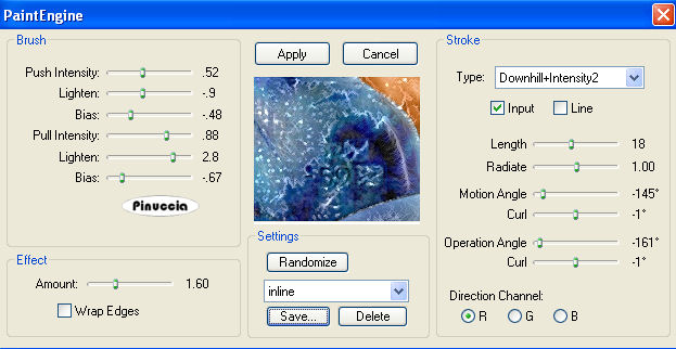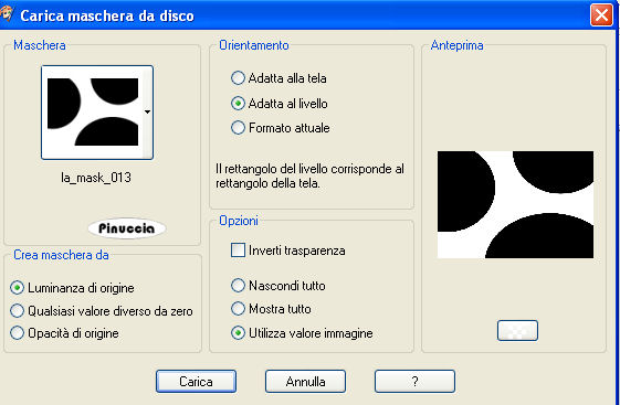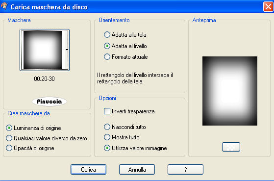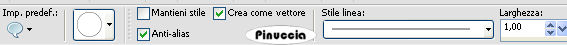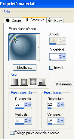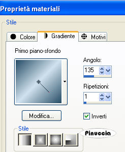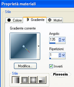 qui puoi trovare qualche risposta ai tuoi dubbi. Se l'argomento che ti interessa non è presente, ti prego di segnalarmelo. Questo tutorial è stato scritto con PSP 9, ma può essere eseguito anche con le altre versioni di PSP. Il copyright del tutorial appartiene a Laguna Azul. Il copyright della traduzione è mio. Il copyright dei tubes e delle immagini è dei rispettivi artisti. Per favore, rispetta il lavoro degli autori. Occorrente: Materiale qui Filtri: Graphics Plus qui Fantastic Machines - Paint engine qui Metti le Maschere nella cartella Maschere. 1. Apri una nuova immagine trasparente 650 x 450 pixels. Imposta il colore di primo piano con #d0e2ee, e il colore di sfondo con #274d66. Passa il colore di primo piano a Gradiente di primo piano/sfondo, con i seguenti settaggi: ![]() Riempi l'immagine trasparente con il gradiente.2. Livelli>Nuovo livello raster. Selezione>Seleziona tutto. Apri l'immagine di sfondo cs-cloudy, e vai a Modifica>Copia. Torna al tuo lavoro e vai a Modifica>Incolla>Incolla nella selezione. Selezione>Deseleziona. Cambia la modalità di miscelatura di questo livello in Moltiplica, e abbassa l'opacità all'80%. 3. Apri il tube my-colour_jet-man01-oktober-2007, e vai a Modifica>Copia. nello zip trovi questo tube in versione bianco-nero e a colori. Scegli quella che preferisci. Torna al tuo lavoro e vai a Modifica>Incolla>Incolla come nuovo livello. Sposta il tube come nel mio esempio.![]() Cambia la modalità di miscelatura di questo livello in Sovrapponi e abbassa l'opacità al 65%. 4. Livelli>Nuovo livello raster. Selezione>seleziona tutto. Apri il file di sfondo bg_typoGenerator_1195305424, e vai a Modifica>Copia. Torna al tuo lavoro e vai a Modifica>Incolla>Incolla nella selezione. Selezione>Deseleziona. 5. Livelli>Carica/Salva maschera>Carica maschera da disco. Cerca e carica la maschera la_mask_013, con i seguenti settaggi: ![]() Livelli>Unisci>Unisci gruppo. Cambia la modalità di miscelatura di questo livello in Sovrapponi, Livelli>Duplica. Cambia la modalità di miscelatura di questo livello in Rafforza, e abbassa l'opacità al 50%. Attiva il secondo livello dall'alto. Effetti>Effetti 3D>Sfalsa ombra, con i seguenti settaggi, colore nero: ![]() Ripeti l'Effetto Sfalsa ombra, ma cambiando verticale e orizzontale con -1. Ancora Effetti>Effetti 3D>Sfalsa ombra, con i seguenti settaggi, colore bianco: ![]() 6. Attiva il livello superiore. Apri il tube Tube PatryTubes_CalvinKleinModel, e vai a Modifica>copia. Torna al tuo lavoro e vai a Modifica>Incolla>Incolla come nuovo livello. Immagine>Ridimensiona, all'80%, tutti i livelli non selezionato. Regola>Messa a fuoco>Metti a fuoco. Livelli>Carica/salva maschera>Carica maschera da disco. Cerca e carica la maschera 00.20-30, con i seguenti settaggi: ![]() Livelli>Unisci>Unisci gruppo. Sposta il tube a sinistra:![]() Cambia la modalità di miscelatura di questo livello in Luminanza (esistente) e abbassa l'opacità al 65%. 7. Apri il tube jet-man01-oktober-2007, o se preferisci, la versione bianco-nero e vai a Modifica>Copia. Immagine>Ridimensiona, al 60%, tutti i livelli non selezionato. Regola>Messa a fuoco>Metti a fuoco. Sposta il tube a destra, come nel mio esempio.![]() Effetti>Effetti 3D>Sfalsa ombra, con i seguenti settaggi, colore bianco. ![]() 8. Imposta il colore di sfondo a Gradiente di primo piano/sfondo, con i seguenti settaggi: ![]() Chiudi il colore di primo piano. Attiva lo strumento Forme ellisse (o premi sulla tastiera il tasto Q),![]() Disegna un cerchio sull'immagine. se tieni premuto il tasto shift (maiuscola) mentre disegni il cerchio, questo sarà perfetto. ![]() Livelli>Converti in livello raster. Inverti i materiali cliccando sulla freccia al centro delle palette: ![]() Imposta la larghezza dello strumento tra 5 e 8 pixels, e disegna un cerchio a cornice del precedente. Tenendo premuto il tasto shift, il cerchio sarà perfetto. ![]() Livelli>Converti in livello raster. Livelli>Unisci>Unisci giù. Effetti>Effetti 3D>Sfalsa ombra, con i seguenti settaggi, colore nero: ![]() Effetti>Effetti 3D>Smusso a incasso, con i seguenti settaggi. ![]() Posiziona il cerchio come preferisci,e cambia la modalità di miscelatura di questo livello in Luce netta. 9. Apri il tube la_wordart_hot, che è composto da tre livelli (più il livello di sfondo). Copia, cominciando dal basso, uno alla volta i tre livelli di testi e incollali sul tuo lavoro. Posiziona i tre livelli come preferisci.Livelli>Unisci>Unisci tutto. 10. Immagine>Aggiungi bordatura, 1 pixel, simmetriche, con il colore nero. Immagine>Aggiungi bordatura, 5 pixels, simmetriche, con il colore bianco. Seleziona questo bordo con la bacchetta magica ![]() ![]() Riempi la selezione con il gradiente del punto 8.Effetti>Plugins>Graphics Plus - Cross Shadow, con i settaggi standard. ![]() Selezione>Deseleziona. 11. Immagine>Aggiungi bordatura, 1 pixel, simmetriche, con il colore nero. Immagine>Aggiungi bordatura, 15 pixels, simmetriche, con il colore bianco. Seleziona questo bordo con la bacchetta magica ![]() ![]() Riempi la selezione con il gradiente.Effetti>Plugins>Fantastic Machine, Paint Engine, con i seguenti settaggi. ![]() Selezione>Inverti. Effetti>Effetti 3D>Sfalsa ombra, con i seguenti settaggi, colore nero: ![]() Selezione>Deseleziona. 12. Immagine>Aggiungi bordatura, 1 pixel, simmetriche, con il colore nero. Immagine>Aggiungi bordatura, 3 pixels, simmetriche, con il colore bianco. Seleziona questo bordo con la bacchetta magica ![]() ![]() Riempi la selezione con il gradiente.Effetti>Effetti artistici>Mezzitoni, con i seguenti settaggi. ![]() Selezione>Deseleziona. Immagine>Aggiungi bordatura, 1 pixel, simmetriche, con il colore nero. Aggiungi il tuo watermark e salva in formato jpg. ![]() Se hai problemi o dubbi, o trovi un link non funzionante, o anche soltanto per un saluto, scrivimi. 3 Aprile 2008 |