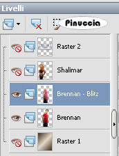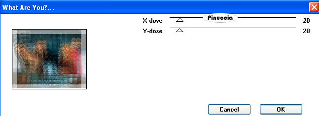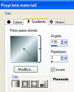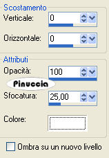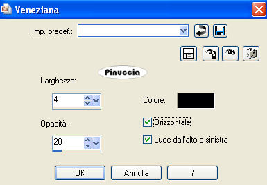 qui puoi trovare qualche risposta ai tuoi dubbi. Se l'argomento che ti interessa non è presente, ti prego di segnalarmelo. Questo tutorial è stato scritto con PSP X, ma può essere eseguito anche con le altre versioni di PSP. Il copyright del tutorial appartiene a Laguna Azul. Il copyright della traduzione è mio. Il copyright dei tubes e delle immagini è dei rispettivi artisti. Per favore, rispetta il lavoro degli autori. Occorrente: Materiale qui Filtri: Toadies qui Metti le Maschere nella cartella Maschere. 1. Apri una nuova immagine trasparente 700 x 550 pixels. Imposta il colore di primo piano con #e4f0f2, e il colore di sfondo con #28454b. Passa il colore di primo piano a Gradiente di primo piano/sfondo, con i seguenti settaggi: ![]() Riempi l'immagine trasparente con il gradiente.Effetti>Effetti di distorsione>Coordinate polari, con i seguenti settaggi, 2 volte. ![]() 2. Apri il tube la_Stasekapseln, e vai a Modifica>copia. Torna al tuo lavoro e vai a Modifica>Incolla come nuovo livello. Cambia la modalità di miscelatura di questo livello in Moltiplica. Effetti>Effetti di trama>Veneziana, con i seguenti settaggi: ![]() Effetti>Effetti di bordo>aumenta. 3. Apri il tube la_gen, e vai a Modifica>copia. Torna al tuo lavoro e vai a Modifica>Incolla come nuovo livello. Cambia la modalità di miscelatura di questo livello in Sovrapponi. Apri il tube la_UP, e vai a Modifica>Copia. Torna al tuo lavoro e vai a Modifica>Incolla come nuovo livello. Spostalo contro il bordo superiore.Effetti>Effetti 3D>Sfalsa ombra, con i seguenti settaggi, colore nero: ![]() 4. Apri il tube Brennan-Blitz. Lascia visibili soltanto i livelli Brennan: ![]() Modifica>Copia Unione. minimizza il tube perchè ti servirà ancora. Torna al tuo lavoro e vai a Modifica>Incolla come nuovo livello. Sposta il tube in basso a destra.![]() Apri il tube la_Lexa & Jesse und la_Shalimar & Brennan. Lascia visibili soltanto i livelli "Jesse" ![]() Modifica>copia unione. minimizza il tube perchè ti servirà ancora. Torna al tuo lavoro e vai a Modifica>Incolla come nuovo livello. Sposta il tube a sinistra.![]() 6. Apri il tube la_Eckhart, e vai a Modifica>copia. Torna al tuo lavoro e vai a Modifica>Incolla come nuovo livello. Immagine>Ridimensiona, al 35%, tutti i livelli non selezionato. Regola>Messa a fuoco>Metti a fuoco. Spostalo nell'angolo in alto a sinistra, più o meno come nell'esempio.![]() Attiva lo strumento Gomma ![]() e cancella cautamente la parte di tube che sporge: ![]() Cambia la modalità di miscelatura di questo livello in Luminanza (esistente). 7. Apri il tube la_Ashlocke, e vai a Modifica>copia. Torna al tuo lavoro e vai a Modifica>Incolla come nuovo livello. Immagine>Ridimensiona, al 45%, tutti i livelli non selezionato. Regola>Messa a fuoco>Metti a fuoco. Sposta il tube come nell'esempio.![]() Cambia la modalità di miscelatura di questo livello in Luminanza (esistente). 8. Attiva nuovamente il tube la_Lexa & Jesse. Lascia visibili soltanto i due livelli Lexa. Modifica>copia unione. Torna al tuo lavoro e vai a Modifica>Incolla come nuovo livello. Posiziona il tube come nell'esempio.![]() Effetti>Effetti 3D>Sfalsa ombra, con i seguenti settaggi, colore bianco. ![]() 9. Attiva nuovamente il tube la_Shalimar & Brennan. Posizionati sul livello Shalimar e vai a Modifica>Copia. Torna al tuo lavoro e vai a Modifica>Incolla come nuovo livello. Spostalo come nell'esempio.![]() 10. Apri il tube la_DOWN, e vai a Modifica>copia. Torna al tuo lavoro e vai a Modifica>Incolla come nuovo livello. Effetti>Effetti di immagine>Scostamento, con i seguenti settaggi. ![]() Effetti>Effetti 3D>Sfalsa ombra, con i seguenti settaggi, colore nero: ![]() 11. Apri il tube la_Emma, e vai a Modifica>copia. Torna al tuo lavoro e vai a Modifica>Incolla come nuovo livello. Immagine>Ridimensiona, al 40%, tutti i livelli non selezionato. Regola>Messa a fuoco>Metti a fuoco. Spostalo nell'angolo in basso a sinistra.Cancella la parte di tube che esce dal bordo.![]() Abbassa l'opacità al 70%. 12. Apri il tube la_Adam, e vai a Modifica>copia. Torna al tuo lavoro e vai a Modifica>Incolla come nuovo livello. Immagine>Ridimensiona, al 35%, tutti i livelli non selezionato. Regola>Messa a fuoco>Metti a fuoco. Sposta nell'angolo in basso a destra,e cancella la parte che esce dal bordo.![]() Abbassa l'opacità al 95%. 13. Apri il tube la_wordart_mutantx, e vai a Modifica>copia. Torna al tuo lavoro e vai a Modifica>Incolla come nuovo livello. Spostalo in basso tra i due piccoli tubes.![]() 14. Immagine>Aggiungi bordatura, 1 pixel, simmetriche, con il colore nero. Immagine>Aggiungi bordatura, 25 pixels, simmetriche, con il colore bianco. Seleziona questo bordo con la bacchetta magica ![]() ![]() Effetti>Plugins>Toadies - What are you?: ![]() Effetti>effetti di trama>Veneziana, con i settaggi usati al punto 2. ![]() Effetti>Effetti di bordo>Aumenta. Effetti>Effetti 3D>Ritaglio, con i seguenti settaggi: ![]() Regola>Luminosità e contrasto>Luminosità e contrasto, con i seguenti settaggi: ![]() Selezione>Nessuna selezione. Immagine>Aggiungi bordatura, 1 pixel, simmetriche, con il colore nero. Aggiungi il tuo nome e/o il tuo watermark e salva in formato jpg. ![]() Se hai problemi o dubbi, o trovi un link non funzionante, o anche soltanto per un saluto, scrivimi. 3 Aprile 2008 |