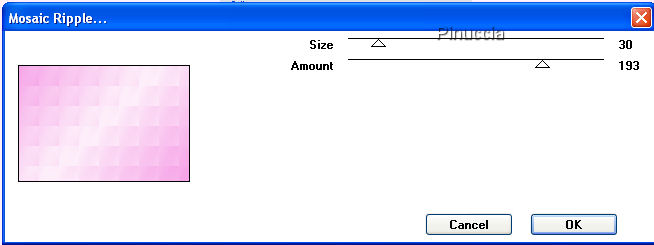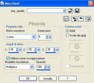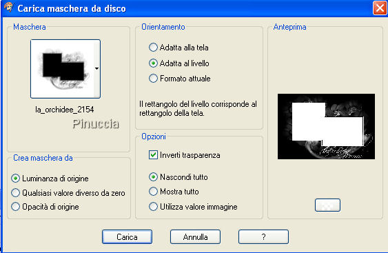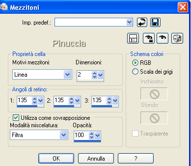 qui puoi trovare qualche risposta ai tuoi dubbi. Se l'argomento che ti interessa non è presente, ti prego di segnalarmelo. Questo tutorial è stato scritto con PSP 9, ma può essere eseguito anche con le altre versioni di PSP. Il copyright del tutorial appartiene a Laguna Azul. Il copyright della traduzione è mio. Il copyright dei tubes e delle immagini è dei rispettivi artisti. Per favore, rispetta il lavoro degli autori. Occorrente: Materiale qui Metti la maschera nella cartella Maschere. Filtro: VM Distortion qui 1. Apri una nuova immagine trasparente 680 x 460 pixels. Imposta il colore di primo piano con #f6a3e7, e il colore di sfondo con #fdf0fa. Passa il colore di primo piano a Gradiente di primo piano/sfondo, con i seguenti settaggi: ![]() Riempi l'immagine trasparente con il gradiente.Effetti>Plugins>VM Distortion - Mosaic Ripple, con i seguenti settaggi: ![]() Ripeti l'Effetto Mosaic Ripple. Effetti>Effetti di bordo>Aumenta. 2. Livelli>Nuovo livello raster. Riempi il livello con il colore di primo piano.Livelli>Carica/Salva maschera>Carica maschera da disco. Cerca e carica la maschera la_orchidee_2145, con i seguenti settaggi: ![]() Livelli>Unisci>Unisci gruppo. Effetti>Effetti 3D>Sfalsa ombra, con i seguenti settaggi, colore nero (#000000). ![]() 3. Apri il tube mds4062Natur e vai a Modifica>Copia. Torna al tuo lavoro e vai a Modifica>Incolla>Incolla come nuovo livello. Cambia la modalità di miscelatura di questo livello in Luminanza (esistente), e abbassa l'opacità al 48%. 4. Apri il tube la_flower-17_orchidee, e vai a Modifica>Copia. Torna al tuo lavoro e vai a Modifica>Incolla>Incolla come nuovo livello. Spostalo un po' più a destra in modo che rimangano visibili le due "E" del testo della maschera.Effetti>Effetti 3D>Sfalsa ombra, con i seguenti settaggi, colore nero (#000000). ![]() Abbassa l'opacità di questo livello all'80%. 5. Apri il tube la_flacon-13, e vai a Modifica>Copia. Torna al tuo lavoro e vai a Modifica>Incolla>Incolla come nuovo livello. Immagine>Ridimensiona, all'85%, tutti i livelli non selezionato. Regola>Messa a fuoco>Metti a fuoco. Sposta questo tube a destra sopra la scritta "orchidee dreams".Livelli>Duplica. Cambia la modalità di miscelatura di questo livello in Moltiplica. Attiva il secondo livello dall'alto (il livello originale del flacone di profumo). Effetti>Effetti 3D>Sfalsa ombra, con i settaggi usati al punto 4. ![]() 6. Attiva nuovamente il livello superiore. Apri il tube jet-woman17-september-2007, e vai a Modifica>Copia. Torna al tuo lavoro e vai a Modifica>Incolla>Incolla come nuovo livello. Sposta il tube a sinistra.Effetti>Effetti 3D>Sfalsa ombra, con i seguenti settaggi, colore nero. ![]() Livelli>Unisci>Unisci tutto. 7. Immagine>Aggiungi bordatura, 15 pixels, simmetriche, con il colore bianco. Seleziona questo bordo con la bacchetta magica ![]() ![]() Riempi la selezione con il colore di sfondo.ricorda che per riempire con il colore di sfondo devi cliccare con il tasto destro del mouse. Effetti>Effetti artistici>Mezzitoni, con i seguenti settaggi: ![]() Selezione>Inverti. Effetti>Effetti 3D>Sfalsa ombra, con i seguenti settaggi, colore nero. ![]() Selezione>Nessuna selezione. 8. Immagine>Aggiungi bordatura, 2 pixels, simmetriche, con il colore #853777. Immagine>Aggiungi bordatura, 2 pixels, simmetriche, con il colore di sfondo. Immagine>Aggiungi bordatura, 2 pixels, simmetriche, con il colore #853777. Immagine>Aggiungi bordatura, 15 pixels, simmetriche, con il colore bianco. Seleziona questo bordo con la bacchetta magica ![]() ![]() Riempi la selezione con il colore di sfondo.ricorda che per riempire con il colore di sfondo devi cliccare con il tasto destro del mouse. Effetti>Effetti artistici>Mezzitoni, con i seguenti settaggi: ![]() Selezione>Inverti. Effetti>Effetti 3D>Sfalsa ombra, con i seguenti settaggi, colore nero. ![]() Selezione>Nessuna selezione. 9. Apri il tube la_deko_bow. Chiudi i due livelli superiori e posizionati su uno degli altri livelli. Modifica>Copia Unione. non chiuderlo, perchè ti servirà ancora. Torna al tuo lavoro e vai a Modifica>Incolla>Incolla come nuovo livello. Immagine>Ridimensiona, all'80%, tutti i livelli non selezionato. Regola>Messa a fuoco>Metti a fuoco. Spostalo nell'angolo in alto a destra.Effetti>Effetti 3D>Sfalsa ombra, con i settaggi usati al punto 4. ![]() Attiva nuovamente il tube la_deko_bow, rendi visibile e attiva il secondo livello dall'alto (orchidee) e vai a Modifica>Copia. Torna al tuo lavoro e vai a Modifica>Incolla>Incolla come nuovo livello. Posizionalo in alto a destra, sul fiocco.Apri il tube SE_Charms_Heart_61, e vai a Modifica>Copia. Torna al tuo lavoro e vai a Modifica>Incolla>Incolla come nuovo livello. Immagine>Ridimensiona, al 50%, tutti i livelli non selezionato. Regola>Messa a fuoco>Accentua messa a fuoco. Posiziona anche questo tube in alto a destra, sul nastro, vedi il mio esempio.Livelli>Disponi>Sposta giù. Effetti>Effetti 3D>Sfalsa ombra, con i settaggi precedenti. Livelli>Unisci>Unisci tutto. 10. Immagine>Aggiungi bordatura, 3 pixels, simmetriche, con il colore #853777. Seleziona il bordo con la bacchetta magica ![]() Effetti>Effetti artistici>Mezzitoni, con i seguenti settaggi: ![]() Effetti>Effetti di bordo>Aumenta. Selezione>Inverti. Effetti>Effetti 3D>Sfalsa ombra, con i settaggi usati al punto 7. ![]() Selezione>Deseleziona. Aggiungi il tuo nome e/o il tuo watermark e salva in formato jpg. ![]() Se hai problemi o dubbi, o trovi un link non funzionante, o anche soltanto per un saluto, scrivimi. 24 Febbraio 2008 |
