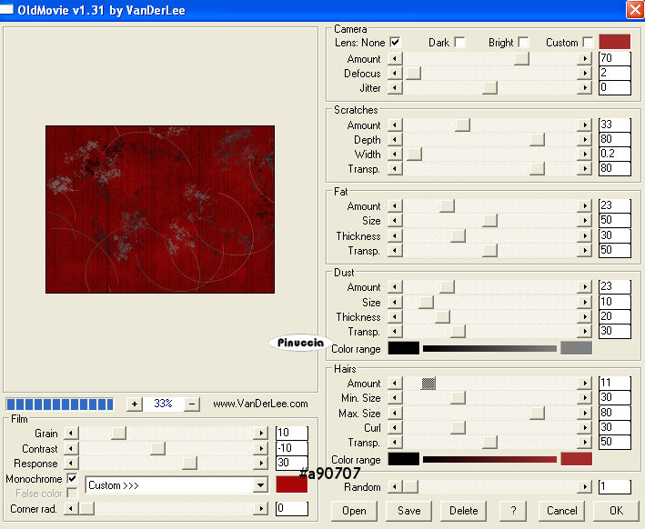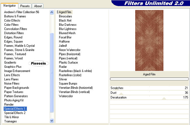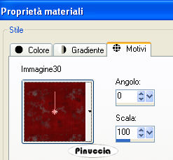qui puoi trovare qualche risposta ai tuoi dubbi. Se l'argomento che ti interessa non è presente, ti prego di segnalarmelo. Questo tutorial è stato scritto con PSP 9, ma può essere eseguito anche con le altre versioni di PSP. Il copyright del tutorial appartiene a Laguna Azul. Il copyright della traduzione è mio. Il copyright dei tubes e delle immagini è dei rispettivi artisti. Per favore, rispetta il lavoro degli autori. Occorrente: Materiale qui FiltrI: Filters Unlimited 2.0 qui FM Tile Tools qui VanDerLee - Old Movie qui 1. Apri l'immagine papel_love5, e vai a Modifica>copia. non chiuderla perchè ti servirà ancora. Apri una nuova immagine trasparente 750 x 550 pixels. Selezione>Seleziona tutto. Modifica>Incolla>Incolla nella selezione. Selezione>Nessuna selezione. 2. Effetti>Plugins>VanDerLee - Old Movie, con i seguenti settaggi: ![]() Effetti>Plugins>FM Tile Tools - Blend Emboss, con i settaggi standard, 2 volte. ![]() Apri il tube lace52-sandi1, e vai a Modifica>copia. Torna al tuo lavoro e vai a Modifica>Incolla>Incolla come nuovo livello. Sposta il tube, in modo che se ne veda soltanto una parte, come nel mio esempio.![]() Livelli>Duplica. Immagine>Capovolgi. . 3. Attiva lo strumento Selezione ![]() (lo strumento si attiva anche premendo sulla tastiera il tasto S) Clicca sull'icona Selezione personalizzata ![]() e imposta i seguenti settaggi: ![]() Livelli>Nuovo livello raster. Attiva nuovamente Papel_love5, e vai a Modifica>Copia. Torna al tuo lavoro e vai a Modifica>Incolla>Incolla nella selezione. Effetti>Plugins>Filters Unlimited 2.0 - Tile and Mirror - Kaleidoskope 2, con i settaggi standard. ![]() Effetti>Plugins>Filters Unlimited 2.0 - Special Effects 1 - Aged Film, con i settaggi standard. ![]() Selezione>Nessuna selezione. Effetti>Plugins>FM Tile Tools - Blend Emboss, con i settaggi standard, 2 volte: ![]() ![]() 4. Regola>Saturazione e tonalità>Viraggio, con i seguenti settaggi: ![]() Regola>Luminosità e contrasto>Luminosità e contrasto, con i seguenti settaggi: ![]() Effetti>Effetti 3D>Sfalsa ombra, con i seguenti settaggi, colore nero: ![]() 5. Apri il tube natalie stitch01, e vai a Modifica>copia. Torna al tuo lavoro e vai a Modifica>Incolla>Incolla come nuovo livello. Regola>Messa a fuoco>Metti a fuoco. Sposta la cucitura al centro tra le due immagini di sfondo rosse.Cambia la modalità di miscelatura di questo livello in Filtra. ![]() 6. Apri il tube back 1, e vai a Modifica>Copia. Torna al tuo lavoro e vai a Modifica>Incolla>Incolla come nuovo livello. Spostalo a destra, facendolo uscire un po' dal bordo.![]() Apri il tube stitch02, e vai a Modifica>Copia. Torna al tuo lavoro e vai a Modifica>Incolla>Incolla come nuovo livello. Spostalo a destra a metà dei due sfondi.![]() 7. Apri il tube art_l.a, e vai a Modifica>Copia. Torna al tuo lavoro e vai a Modifica>Incolla>Incolla come nuovo livello. Il tube è già correttamente posizionato. Non occorre spostarlo. Apri il tube back 2, e vai a Modifica>Copia. Torna al tuo lavoro e vai a Modifica>Incolla>Incolla come nuovo livello. Spostalo sullo sfondo chiaro a destra, in modo che rimanga visibile soltanto un centimetro.Apri il tube borte black, e vai a Modifica>Copia. Torna al tuo lavoro e vai a Modifica>Incolla>Incolla come nuovo livello. Spostalo a destra, come nel mio esempio.![]() 8. Apri il tube stitch03, e vai a Modifica>Copia. Torna al tuo lavoro e vai a Modifica>Incolla>Incolla come nuovo livello. Spostalo a destra, al centro dei due sfondi chiari.![]() 9. Apri il tube kette_la_01, e vai a Modifica>Copia. Torna al tuo lavoro e vai a Modifica>Incolla>Incolla come nuovo livello. Spostalo come nel mio esempio.![]() 10. Apri il tube ring_bi, e vai a Modifica>Copia. Torna al tuo lavoro e vai a Modifica>Incolla>Incolla come nuovo livello. Spostalo sulla stecca centrale, come nell'esempio.![]() Effetti>Effetti 3D>Sfalsa ombra, con i seguenti settaggi, colore nero: ![]() 11. Apri il tube kette_la_02. Rimani sul livello inferiore e vai a Modifica>Copia. Torna al tuo lavoro e vai a Modifica>Incolla>Incolla come nuovo livello. Sposta la catena a sinistra del medaglione, al centro dell'anello.Torna al tube kette_la_02, attiva il livello superiore e vai a Modifica>copia. Torna al tuo lavoro e vai a Modifica>Incolla>Incolla come nuovo livello. Sposta la catena a destra del medaglione.![]() Apri il tube nagel, e vai a Modifica>Copia. Torna al tuo lavoro e vai a Modifica>Incolla>Incolla come nuovo livello. Sistema il chiodo al centro dell'anello del medaglione.![]() Livelli>Duplica. Immagine>Rifletti. Sistema il secondo chiodo al centro dell'altro anello.![]() 12. Apri il tube dark rose_22, e vai a Modifica>Copia. Torna al tuo lavoro e vai a Modifica>Incolla>Incolla come nuovo livello. Spostalo a sinistra, come nel mio esempio.![]() 13. Apri il tube in+black2, e vai a Modifica>Copia. Torna al tuo lavoro e vai a Modifica>Incolla>Incolla come nuovo livello. Immagine>Ridimensiona, al 90%, tutti i livelli non selezionato. Effetti>Effetti 3D>Sfalsa ombra, con i seguenti settaggi, colore nero: ![]() Sposta il tube al centro dello sfondo scuro.15. Apri il tube tag black, e vai a Modifica>Copia. Torna al tuo lavoro e vai a Modifica>Incolla>Incolla come nuovo livello. Attiva lo strumento Testo ![]() seleziona il font Blackletter (lo trovi nello zip), crea come vettore, e scrivi il tuo nome. Usa i nodi vettori dello strumento per ruotare il testo e sistemarlo sull'etichetta. Attiva il livello inferiore dello sfondo e vai a Modifica>copia. Modifica>Incolla come nuova IMMAGINE. Minimizza l'immagine nella tua area di lavoro (ti servirà più tardi, per impostarlo come motivo). Torna al tuo scrap. Controlla che tutto sia al posto giusto e vai a Livelli>Unisci>Unisci tutto. 16. Apri l'immagine Silberbeads e minimizzala. Passa il colore di primo piano a Motivi. Apri il menu cliccando sulla freccia a fianco del box, cerca e seleziona silberbeads. ![]() Passa il colore di sfondo a Motivi. Cerca e seleziona l'immagine di sfondo che hai mi