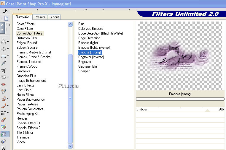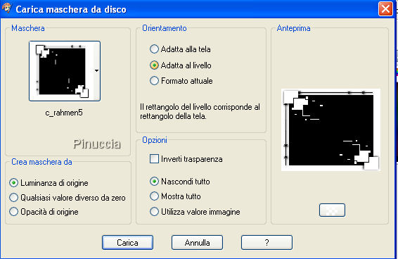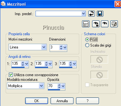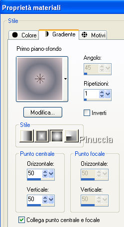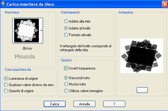 qui puoi trovare qualche risposta ai tuoi dubbi. Se l'argomento che ti interessa non è presente, ti prego di segnalarmelo. Questo tutorial è stato scritto con PSP X, ma può essere eseguito anche con le altre versioni di PSP. Il copyright del tutorial appartiene a Laguna Azul. Il copyright della traduzione è mio. Il copyright dei tubes e delle immagini è dei rispettivi artisti. Per favore, rispetta il lavoro degli autori. Occorrente: Materiale qui Filtro: Filters Unlimited 2.0 qui Ti servirà anche Animation Shop qui Scegli dal tube un colore chiaro come colore di primo piano (#dac7c9), e un colore scuro come colore di sfondo (#757784). Passa il colore di primo piano a Gradiente di primo piano/sfondo, con i seguenti settaggi: ![]() Riempi l'immagine trasparente con il gradiente.2. Apri il tube Misted_Roses_On_A_Page_Lavender_RM, e vai a Modifica>Copia. Torna al tuo lavoro e vai a Modifica>Incolla come nuovo livello. Effetti>Plugins>Filters Unlimited 2.0 - Convolutions Filters - Emboss(strong), con i settaggi standard ![]() 3. Livelli>Nuovo livello raster. Cambia i settaggi del gradiente togliendo la spunta a Inverti: ![]() Riempi il livello con il gradiente.4. Livelli>Carica/Salva maschera>Carica maschera da disco. Cerca e carica la maschera 86-kris, con i seguenti settaggi: ![]() Livelli>Unisci>Unisci gruppo. Effetti>Effetti 3D>Sfalsa ombra, con i seguenti settaggi, colore nero: ![]() 5. Apri il tube KaraT3624, e vai a Modifica>Copia. Torna al tuo lavoro e vai a Modifica>Incolla come nuovo livello. Sposta il tube a sinistra.![]() Abbassa l'opacità di questo livello al 67%. 6. Apri il tube mh_blueroses, e vai a Modifica>Copia. Torna al tuo lavoro e vai a Modifica>Incolla come nuovo livello. Immagine>Ridimensiona, al 50%, tutti i livelli non selezionato. Sposta la rosa nell'angolo in basso a sinistra.![]() Livelli>Duplica. Cambia la modalità di miscelatura di questo livello in Luce netta. 7. Apri il tube caro3198 e vai a Modifica>Copia. Torna al tuo lavoro e vai a Modifica>Incolla come nuovo livello. Sposta questo tube a destra.Livelli>Duplica. Cambia la modalità di miscelatura di questo livello in Luce Netta, e abbassa l'opacità al 65%. 8. Apri il tube pendentif5, e vai a Modifica>Copia. Torna al tuo lavoro e vai a Modifica>Incolla come nuovo livello. Sposta questo tube in alto, come nell'esempio.![]() 9. Apri il tube Parfum_Lolita_@el, e vai a Modifica>Copia. Torna al tuo lavoro e vai a Modifica>Incolla come nuovo livello. Immagine>Ridimensiona, al 50%, tutti i livelli non selezionato. Regola>Messa a fuoco>Metti a fuoco. Effetti>effetti 3D>sfalsa ombra, con i seguenti settaggi, colore nero: ![]() Sposta il tube nell'angolo in basso a destra.Livelli>Unisci>Unisci tutto. 10. Immagine>Aggiungi bordatura, 30 pixels, simmetriche, con il colore di sfondo. Livelli>Nuovo livello raster. Cambia i settaggi del Gradiente e rimetti la spunta a Inverti, come al punto 1, e riempi il livello con questo gradiente.Livelli>Carica/Salva maschera>Carica maschera da disco. Cerca e carica la maschera c_rahmen5, con i seguenti settaggi. ![]() Livelli>Unisci>Unisci gruppo. Effetti>effetti 3D>Sfalsa ombra, con i seguenti settaggi, colore nero. ![]() Cambia la modalità di miscelatura di questo livello in Luce netta. ![]() 11. Attiva nuovamente il tube Parfum_Lolita_@el e vai a Modifica>Copia. Torna al tuo lavoro e vai a Modifica>Incolla come nuovo livello. Immagine>Ridimensiona, al 50%, tutti i livelli non selezionato. Regola>Messa a fuoco>Metti a fuoco. Sposta il flacone esattamente sul flacone precedente.Cambia la modalità di miscelatura di questo livello in Moltiplica per posizionarlo più facilmente, poi riporta l'opacità a Normale. 12. Apri il tube pendentif5 e vai a Modifica>Copia. Torna al tuo lavoro e vai a Modifica>Incolla come nuovo livello. Cambia la modalità di miscelatura di questo livello in Moltiplica, e posizionalo , sulla catena.Attiva lo strumento Gomma , con i seguenti settaggi:![]() cancella la parte selezionata nell'esempio. ![]() Puoi anche selezionare con lo strumento Selezione e premere il tasto canc.Livelli>Unisci>Unisci tutto. 13. Immagine>Aggiungi bordatura, 3 pixels, simmetriche, con il colore di primo piano. Seleziona questo bordo con la bacchetta magica ![]() ![]() Effetti>Effetti artistici>Mezzitoni, con i seguenti settaggi: ![]() 14. Mantieni selezionato. Selezione>inverti. Livelli>Nuovo livello raster. Effetti>effetti 3D>Ritaglio, con i seguenti settaggi: ![]() Selezione>Deseleziona. Aggiungi il tuo nome e/o il tuo watermark. Livelli>Unisci>Unisci tutto. 15. Copia l'immagine: Modifica>Copia. Apri Animation Shop. Clicca con il tasto destro del mouse sullo spazio vuoto e Incolla come nuova animazione. ![]() Modifica>Duplica, e ripeti finchè non avrai ottenuto 8 fotogrammi. Clicca sul primo fotogramma per selezionarlo e vai a Modifica>Seleziona tutto (oppure usa sulla tastiera la combinazione di tasti ctrl+A). Apri silver_sparkle. Clicca sul primo fotogramma per selezionarlo e vai a Modifica>Seleziona tutto (ctrl+A), e quindi Modifica>Copia (ctrl+C). Torna al tuo lavoro e vai a Modifica>Incolla>Incolla nel fotogramma selezionato (ctrl+E). Cerca la posizione e, quando l'hai trovata, rilascia il tasto del mouse. Ripeti Ctrl+E tutte le volte che vuoi per aggiungere le stelline in altre posizioni. Quando hai finito, controlla il risultato cliccando su Visualizza e salva in formato gif.![]() Se hai problemi o dubbi, o trovi un link non funzionante, o anche soltanto per un saluto, scrivimi. 25 Febbraio 2008 |