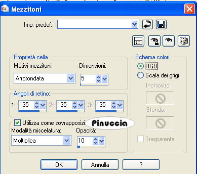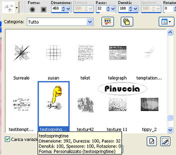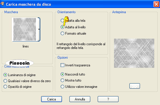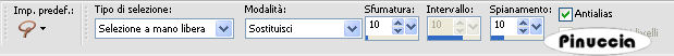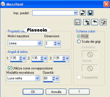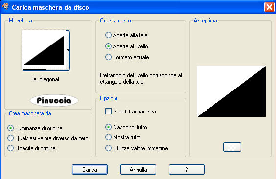 qui puoi trovare qualche risposta ai tuoi dubbi. Se l'argomento che ti interessa non è presente, ti prego di segnalarmelo. Questo tutorial è stato scritto con PSP 9, ma può essere eseguito anche con le altre versioni di PSP. Il copyright del tutorial appartiene a Laguna Azul. Il copyright della traduzione è mio. Il copyright dei tubes e delle immagini è dei rispettivi artisti. Per favore, rispetta il lavoro degli autori. Occorrente: Materiale qui Metti le Maschere nella cartella Maschere. Filtro Filters Unlimited 2.0 qui 1. Apri una nuova immagine trasparente 700 x 510 pixels. Scegli dal tube un colore chiaro come colore di primo piano (io ho usato #f2dede), e un colore medio come colore di sfondo (io ho usato #ca97a0). Crea un gradiente di primo piano/sfondo con i seguenti settaggi: ![]() e riempi l'immagine trasparente con il gradiente.2. Livelli>Nuovo livello raster. Riempi questo livello con il colore di primo piano.per riportare il colore di primo piano da gradiente a colore senza aprire la paletta dei materiali, clicca sul triangolino del gradiente per aprire il menu: ![]() clicca sull'icona del colore ![]() e avrai impostato il colore ![]() Livelli>Carica/Salva maschera>Carica maschera da disco. Cerca e carica la maschera "lines", con i seguenti settaggi: ![]() Livelli>Unisci>Unisci gruppo. Cambia la modalità di miscelatura di questo livello in Luce diffusa. Effetti>Plugins>Filters Unlimited 2.0 - Convolution Filters - Emboss(strong), con i settaggi standard, 2 volte: ![]() 3. Apri il tube "back to the light", e vai a Modifica>Copia. Torna al tuo lavoro e vai a Modifica>Incolla>Incolla come nuovo livello. Sposta il tube nell'angolo in basso a sinistra.Cambia la modalità di miscelatura di questo livello in Luce diffusa. Se il tuo tube è più chiaro, puoi semplicemente abbassare l'opacità del livello. 4. Apri il tube flowers145[1] e vai a Modifica>Copia. non chiuderlo perchè ti servirà ancora. Torna al tuo lavoro e vai a Modifica>Incolla>Incolla come nuovo livello. Sposta il tube nell'angolo in alto a sinistra, come nell'esempio.![]() Cambia la modalità di miscelatura di questo livello in Luce diffusa, o abbassa l'opacità del livello. 5. Apri il tube "Tube&Mist WomanFace with flower_@el", attiva il livello mist e vai a Modifica>Copia. Torna al tuo lavoro e vai a Modifica>Incolla>Incolla come nuovo livello. Spostalo a destra.Il tube si adatta perfettamente tra i bordi superiore e inferiore. 6. Livelli>Nuovo livello raster. Riempi questo livello con il gradiente.Livelli>Carica/Salva maschera>Carica maschera da disco: Cerca e carica la maschera lensflare, con i settaggi precedenti. ![]() Livelli>Unisci>Unisci gruppo. Cambia la modalità di miscelatura di questo livello in Luce diffusa, e abbassa l'opacità al 91%. 7. Apri il tube "Tube&Mist WomanFace with madonna lily _@el_2". Posizionati sul livello Tube e vai a Modifica>Copia. Torna al tuo lavoro e vai a Modifica>Incolla>Incolla come nuovo livello. Sposta il tube a sinistra.8. Livelli>Nuovo livello raster. Riempi con il colore di sfondo.Livelli>Carica/salva maschera>Carica maschera da disco. Cerca e carica la maschera LD05zw, con i settaggi precedenti. ![]() Livelli>Unisci>Unisci gruppo. 9. Attiva il secondo livello dall'alto (il tube della donna a sinistra). Livelli>Duplica. Livelli>Disponi>Sposta su. Attiva lo strumento Selezione a mano libera con i seguenti settaggi:![]() Tenendo premuto il tasto sinistro del mouse traccia una selezione intorno alla testa della donna a sinistra. Non è necessario che sia precisa (vedi l'esempio). Dopo aver chiuso la selezione questa si allargherà per effetto della sfumatura. ![]() Selezione>Inverti. Premi sulla tastiera il tasto CANC ![]() Selezione>Nessuna selezione. 10. Attiva il terzo livello dall'alto (il tube originale della donna a sinistra). Effetti>Effetti 3D>Sfalsa ombra, con i seguenti settaggi, colore nero: ![]() 11. Attiva il livello superiore. Livelli>Nuovo livello raster. Apri l'immagine la_brush_spring. File>Esporta - come pennello personalizzato. Assegna un nome al pennello e clicca ok. ![]() Imposta il colore di primo piano con #a14f5e (un colore scuro dal tuo tube) Attiva lo strumento Pennello ![]() cerca e seleziona il pennello che hai appena esportato: ![]() applica il pennello cliccando con il tasto sinistro del mouse per usare il colore di primo piano. Effetti>Effetti 3D>Sfalsa ombra, con i seguenti settaggi, colore bianco. ![]() Livelli>Unisci>Unisci tutto. 12. Attiva nuovamente il tube flowers145[1]. Chiudi i livelli inferiori del tube: ![]() e minizzalo nella tua area di lavoro. Imposta il colore di primo piano a Motivi, e troverai il tube nella lista dei motivi disponibili. Clicca sul tube per selezionarlo. ![]() Immagine>Aggiungi bordatura, 25 pixels, simmetriche, con il colore #f2dede (colore chiaro). Attiva questo bordo con la bacchetta magica , sfumatura e tolleranza 0,![]() Riempi la selezione con il Motivo.Effetti>Plugins>Filters Unlimited 2.0 - Convolution Filters - Emboss(strong), con i settaggi standard, 2 volte: ![]() 13. Mantieni selezionato. Livelli>Nuovo livello raster. Riempi con il colore #f2dede.Livelli>Carica/Salva maschera>Carica maschera da disco. Cerca e carica la maschera la_diagonal. ![]() Livelli>Unisci>Unisci gruppo. Effetti>Effetti artistici>Mezzitoni: ![]() Selezione>Nessuna selezione. 14. Livelli>Nuovo livello raster. Selezione>Seleziona tutto. Selezione>modifica>Contrai di 23 pixels. Riempi la selezione con il colore scuro di sfondo.Selezione>Modifica>Contrai, di 2 pixels. Premi sulla tastiera il tasto CANC. Selezione>Nessuna selezione. 15. Selezione>Seleziona tutto. Selezione>Modifica>contrai di 23 pixels. Effetti>Effetti 3D>Sfalsa ombra, con i seguenti settaggi, colore nero: ![]() Selezione>Nessuna selezione. Selezione>Unisci>Unisci tutto. 16. Immagine>Aggiungi bordatura, 3 pixels, simmetriche, con il colore di sfondo. Seleziona questo bordo con la bacchetta magica ![]() Effetti>Effetti artistici>Mezzitoni. ![]() Selezione>Nessu