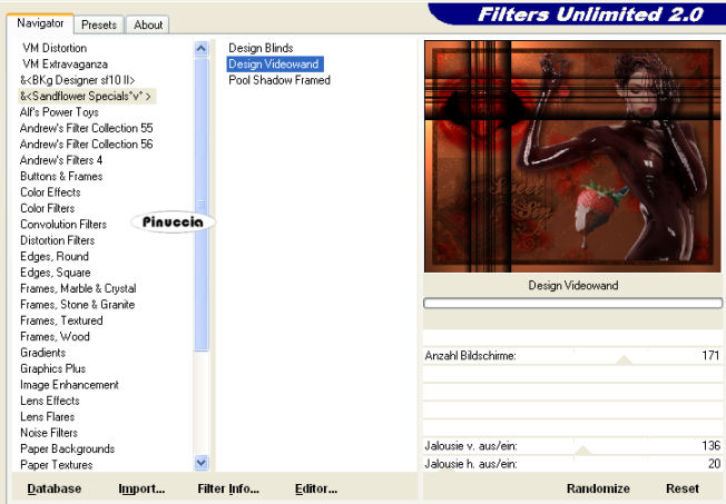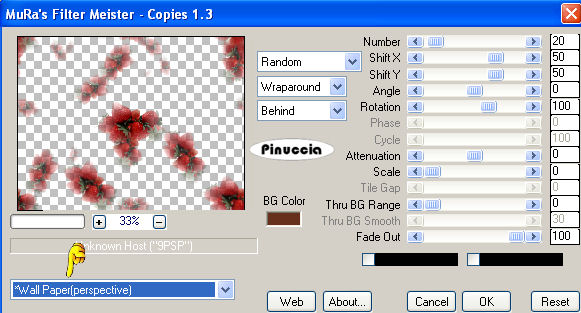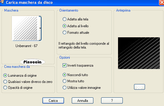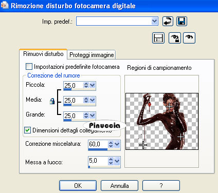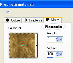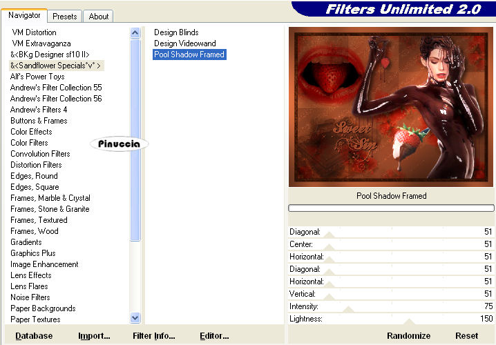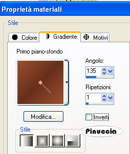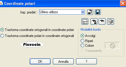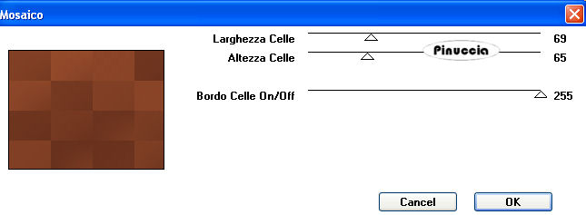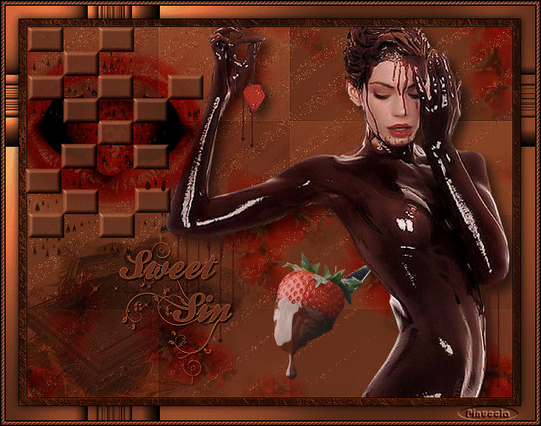 qui puoi trovare qualche risposta ai tuoi dubbi. Se l'argomento che ti interessa non è presente, ti prego di segnalarmelo. Questo tutorial è stato scritto con PSP X2, ma può essere eseguito anche con le altre versioni di PSP. Il copyright del tutorial appartiene a Laguna Azul. Il copyright della traduzione è mio. Il copyright dei tubes e delle immagini è dei rispettivi artisti. Per favore, rispetta il lavoro degli autori. Occorrente: Materiale qui I tubes delle fragole sono di Suzi Sgai Filtri: FM Tile Tools qui Mura's Meister - Copies qui Filters Unlimited 2.0 qui Eye Candy 5 Nature qui Italian Editors qui Sandflower qui Per usare i Filtri Sandflower bisogna importarli in Filters Unlimited 2.0. Come fare vedi qui Ti servirà anche Animation Shop qui Importa il pennello in PSP: come fare vedi qui 1. Apri l'immagine di sfondo "Textures-diverses-43". Immagine>Ridimensiona, con i seguenti settaggi: ![]() Modifica>Copia. Apri una nuova immagine trasparente 680 x 520 pixels e vai a Modifica>Incolla come nuovo livello. Effetti>Plugins>FM Tile Tools - Blend Emboss, con i settaggi standard, 2 volte. ![]() Abbassa l'opacità di questo livello al 30%. 2. Livelli>Nuovo livello raster. Imposta il colore di primo piano con un colore medio (#9d4f2d), e il colore di sfondo con un colore scuro (#66301c). Passa il colore di primo piano a Gradiente di primo piano/sfondo, con i seguenti settaggi: ![]() e riempi il livello con questo gradiente.Effetti>Effetti di distorsione>Coordinate polari, con i seguenti settaggi. ![]() 3. Effetti>Plugins>Italian Editors - Mosaico, con i seguenti settaggi: ![]() Effetti>Effetti di bordo>Aumenta. Cambia la modalità di miscelatura di questo livello in Moltiplica. 4. Apri il tube mds8007 Strawberries, e vai a Modifica>copia. Torna al tuo lavoro e vai a Modifica>Incolla come nuovo livello. Livelli>Carica/Salva maschera>Carica maschera da disco. Cerca e carica la maschera 00.20-20, con i seguenti settaggi. ![]() Livelli>Unisci>Unisci gruppo. Immagine>Ridimensiona, al 50%, tutti i livelli non selezionato. Effetti>Plugins>Mura's Meister - Copies, con i seguenti settaggi: ![]() Cambia la modalità di miscelatura di questo livello in Luce diffusa. 5. Livelli>Nuovo livello raster. Riempi con il colore di primo piano.Livelli>Carica/Salva maschera>Carica maschera da disco. Cerca e carica la maschera Unbenannt - 67, con i seguenti settaggi. ![]() Livelli>Unisci>Unisci gruppo. Immagine>Rifletti. Immagine>Capovolgi. Regola>Aggiungi/rimuovi disturbo>Aggiungi disturbo, con i seguenti settaggi. ![]() Cambia la modalità di miscelatura di questo livello in Dissolvi, e abbassa l'opacità al 40%. 6. Apri il tube SS_607_Tube, e vai a Modifica>Copia. Torna al tuo lavoro e vai a Modifica>Incolla come nuovo livello. Immagine>Ridimensiona, al 50%, tutti i livelli non selezionato. Spostalo pressappoco come nell'esempio.![]() 7. Apri il tube Leny-vrouw108, e vai a Modifica>copia. Torna al tuo lavoro e vai a Modifica>Incolla come nuovo livello. Spostalo a destra.Regola>Rimozione disturbo fotocamera digitale, con i seguenti settaggi. ![]() Effetti>Effetti 3D>Sfalsa ombra, con i seguenti settaggi colore nero: ![]() 8. Apri il tube sil13, e vai a Modifica>copia. Torna al tuo lavoro e vai a Modifica>Incolla come nuovo livello. Immagine>Ridimensiona, al 60%, tutti i livelli non selezionato. Sposta il tube nell'angolo in alto a sinistra,in modo che rimanga dal bordo superiore almeno un centimetro. Vedi l'esempio: ![]() Cambia la modalità di miscelatura di questo livello in Moltiplica. 9. Apri il tube la_misc-19, e vai a Modifica>Copia. Torna al tuo lavoro e vai a Modifica>Incolla come nuovo livello. Immagine>Ridimensiona, al 60%, tutti i livelli non selezionato. Spostalo nell'angolo in basso a sinistra.Effetti>Plugins>FM Tile Tools - Blend Emboss, con i settaggi standard, 2 volte. Cambia la modalità di miscelatura di questo livello in Moltiplica, e abbassa l'opacità al 60%. 10. Livelli>Nuovo livello raster. Attiva lo strumento Pennello (tasto B sulla tastiera),cerca e seleziona il pennello la_sweet_sin, cambia la dimensione a 270. ![]() e applicalo sull'immagine cliccando con il tasto destro del mouse per usare il colore di sfondo. Sposta il pennello sopra la cioccolata a sinistra (vedi l'esempio finale).Effetti>Effetti di bordo>aumenta. Effetti>Effetti 3D>Sfalsa ombra, con i seguenti settaggi, colore nero: ![]() Livelli>Unisci>Unisci tutto. 11. Immagine>Aggiungi bordatura, 1 pixel, simmetriche, con il colore nero. Immagine>Aggiungi bordatura, 10 pixels, simmetriche, con il colore di sfondo. Seleziona questo bordo con la bacchetta magica ![]() ![]() Apri il file di sfondo 040 metal, e minimizzalo. Passa il colore di primo piano a Motivi, cerca il file nella lista e selezionalo. ![]() Livelli>Nuovo livello raster. Riempi la selezione con il motivo di primo piano.Cambia la modalità di miscelatura di questo livello in Moltiplica. Effetti>Effetti di bordo>Aumenta. Selezione>Deseleziona. Livelli>Unisci>Unisci tutto. 12. Immagine>Aggiungi bordatura, 1 pixel, simmetriche, con il colore nero. Immagine>Aggiungi bordatura, 20 pixels, simmetriche, con il colore di primo piano. Seleziona questo bordo con la bacchetta magica ![]() Effetti>Plugins>Filters Unlimited - Sandflower - Pool Shadow Frame: ![]() Mantieni selezionato. Effetti>Plugins>Filters Unlimited - Sandflower - Design Videowand: ![]() Selezione>Inverti. Effetti>Effetti 3D>Sfalsa ombra, con i seguenti settaggi, colore nero: ![]() Selezione>Deseleziona. 13. Immagine>Aggiungi bordatura, simmetriche non selezionato, colore nero, con i seguenti settaggi. ![]() Immagine>Aggiungi bordatura, 4 pixels, simmetriche selezionato, con il colore di sfondo. Seleziona questo bordo con la bacchetta magica ![]() Effetti>Effetti artistici>Mezzitoni, con i seguenti settaggi. ![]() Effetti>Effetti di bordo>aumenta. Selezione>Deseleziona. Immagine>Aggiungi bordatura, 2 pixels, simmetriche, con il colore nero. Aggiungi il tuo nome e/o il tuo watermark. Livelli>Unisci>U