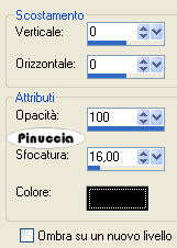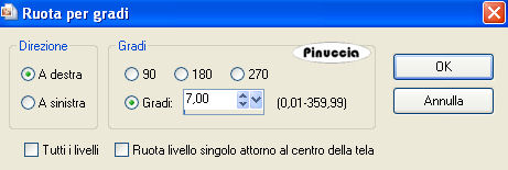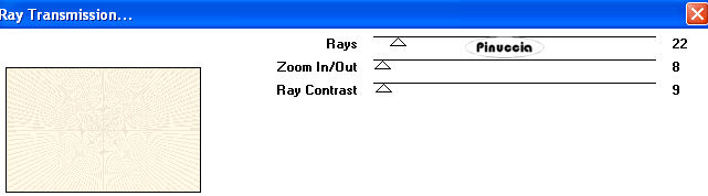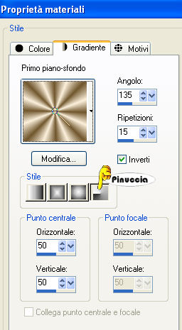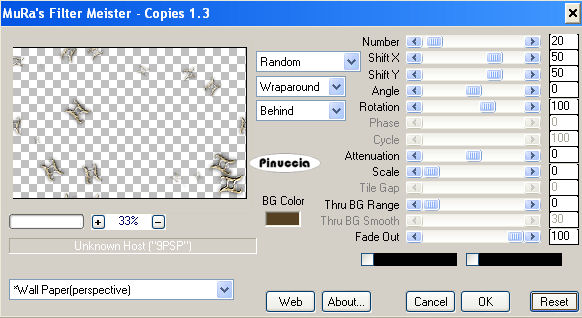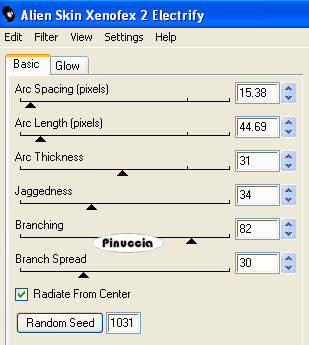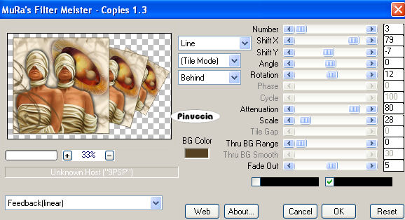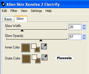 qui puoi trovare qualche risposta ai tuoi dubbi. Se l'argomento che ti interessa non è presente, ti prego di segnalarmelo. Questo tutorial è stato scritto con PSP 9, ma può essere eseguito anche con le altre versioni di PSP. Il copyright del tutorial appartiene a Laguna Azul. Il copyright della traduzione è mio. Il copyright dei tubes e delle immagini è dei rispettivi artisti. Per favore, rispetta il lavoro degli autori. Occorrente: Materiale qui Per identificare i vostri segni zodiacali, ecco la traduzione dei files forniti con il materiale: Widder, Ariete Stier, Toro Zwillinge, Gemelli Krebs, Cancro Lowe, Leone Jungfrau, Vergine Waage, Bilancia Skorpion, Scorpione Schutze, Sagittario Steinbock, Capricorno Wassermann, Acquario Fische, Pesci Filtri: Mura's Meister qui Screenworks qui VM Extravaganza qui Xenofex 2 qui Apri i pennelli in PSP e vai a File>Esporta>Pennello personalizzato, assegna un nome al pennello e clicca ok. 1. Apri una nuova immagine trasparente 410 x 410 pixels. Imposta il colore di primo piano con #fbf0dc, e il colore di sfondo con #70562d. Riempi l'immagine trasparente con il colore di primo piano.2. Livelli>Nuovo livello raster. Passa il colore di primo piano a Gradiente di primo piano/sfondo, con i seguenti settaggi: ![]() Attiva lo strumento Pennello ![]() cerca e seleziona il pennello @cb-swirl2, imposta l'opacità a 80: ![]() applica il pennello a destra, cliccando con il tasto sinistro del mouse per usare il gradiente di primo piano. Livelli>Duplica. Immagine>Rifletti. Livelli>Unisci>Unisci giù. 3. Effetti>Plugins>Alien Skin Xenofex 2 - Electrify, con i seguenti settaggi: ![]() Prima di premere ok, clicca sulla linguetta Glow, e imposta i seguenti settaggi: ![]() 4. Apri il tube "universum" e vai a Modifica>Copia. Torna al tuo lavoro e vai a Modifica>Incolla>Incolla come nuovo livello. Sposta il tube nell'angolo in alto a destra.Apri il tuo segno zodiacale (per il mio esempio ho usato i gemelli: Swillinge), e vai a Modifica>Copia. Torna al tuo lavoro e vai a Modifica>Incolla>Incolla come nuovo livello. Se necessario, ridimensiona il tube (Immagine>Ridimensiona, al 90 o all'80%, tutti i livelli non selezionato). Regola>Messa a fuoco>Metti a fuoco. 5. Apri il tuo segno zodiacale con la lettera B, e vai a Modifica>Copia. Torna al tuo lavoro e vai a Modifica>Incolla>Incolla come nuovo livello. Posizionalo a sinistra o a destra.Effetti>Effetti 3D>Sfalsa ombra, con i seguenti settaggi, colore nero, 2 volte: ![]() 6. Livelli>Nuovo livello raster. Imposta il colore di sfondo con #564222. Attiva lo strumento Pennello ![]() cerca e seleziona il pennello Swirls7, e applicalo cliccando con il tasto destro del mouse per usare il colore di sfondo. Posiziona il pennello nell'angolo in basso a destra.Se vuoi posizionarlo nell'angolo sinistro, riflettilo (Immagine>Rifletti). Livelli>Unisci>Unisci tutto. ![]() Immagine>Aggiungi bordatura, 2 pixels, simmetriche, con il colore di sfondo (#564222). Minimizza l'immagine per il momento. 7. Apri una nuova immagine trasparente 700 x 450 pixels, e riempila con il colore di primo piano.Effetti>Plugins>VM Extravaganza - Ray Transmission, con i seguenti settaggi: ![]() Livelli>Nuovo livello raster. Imposta il colore di sfondo con il gradiente. Attiva lo strumento Pennello ![]() cerca e seleziona il pennello @cb-swirl2, imposta l'opacità al 50% e applicalo nell'angolo in alto a sinistra, cliccando con il tasto destro del mouse per usare il gradiente impostato come colore di sfondo. 8. Apri il tube "universum", e vai a Modifica>Copia. Torna al tuo lavoro e vai a Modifica>Incolla>Incolla come nuovo livello. Lascialo al centro dell'immagine. Livelli>Duplica. Immagine>Rifletti. Livelli>Unisci>Unisci giù. Effetti>Effetti di immagine>Motivo unico, con i settaggi standard: ![]() Abbassa l'opacità di questo livello al 50%. 9. Attiva l'immagine che hai minimizzato prima e vai a Modifica>Copia. Torna al tuo lavoro e vai a Modifica>Incolla>Incolla come nuovo livello. Spostala a sinistra , mantenendo per tutti i tre lati la stessa distanza dai bordi di circa 1 cm.Effetti>Plugins>Mura's Meister - Copies, con i seguenti settaggi: ![]() Effetti>effetti 3D>Sfalsa ombra, con i seguenti settaggi: ![]() 10. Apri il segno zodiacale con la lettera A, e vai a Modifica>Copia. Torna al tuo lavoro e vai a Modifica>Incolla>Incolla come nuovo livello. Immagine>Ridimensiona, all'80%, tutti i livelli non selezionato. Regola>Messa a fuoco>Metti a fuoco. Spostalo nell'angolo in basso a destra,lasciando dal bordo circa 3-4 cm di spazio. Effetti>Effetti 3D>Sfalsa ombra, con i settaggi precedenti. Apri il segno zodiacale con la lettera C, e vai a Modifica>Copia. Torna al tuo lavoro e vai a Modifica>Incolla>Incolla come nuovo livello. Spostalo sullo spazio libero nell'angolo in basso a destra.Effetti>effetti 3D>Sfalsa ombra, con i settaggi precedenti. 11. Immagine>Ruota>Ruota per gradi - 7 gradi a destra: ![]() Livelli>Duplica. Effetti>Plugins>Mura's Meister - Copies, con i seguenti settaggi: ![]() Abbassa l'opacità di questo livello all'80%. Se dopo l'applicazione del filtro, qualche segno è rimasto sul viso del tube, attiva la gomma e cancellalo.![]() 12. Attiva lo strumento Testo ![]() seleziona il font Alex Brush, dimensione 72, e scrivi il nome del segno zodiacale con il gradiente impostato come colore di sfondo. Livelli>Converti in livello raster. Effetti>Effetti 3D>Sfalsa ombra, con i seguenti settaggi: ![]() Ripeti l'Effetto Sfalsa ombra, ma cambiando verticale e orizzontale con -1. Di nuovo Effetti>Effetti 3D>Sfalsa ombra, ma con questi settaggi. ![]() Premi sulla tastiera il tasto D per attivare lo strumento Deformazione ![]() puntatore se stai usando PSP X (vedi le funzioni di questo strumento quie ruota e ingrandisci il testo a tuo piacimento. ![]() 13. Immagine>Aggiungi bordatura, 2 pixels, simmetriche, con il colore di sfondo. Immagine>Aggiungi bordatura, 3 pixels, simmetriche, con il colore di primo piano. Immagine>Aggiungi bordatura, 2 pixels, simm