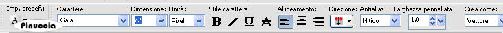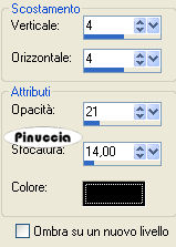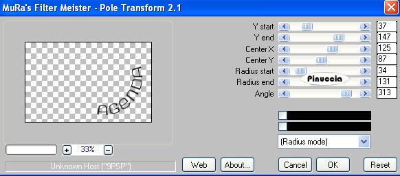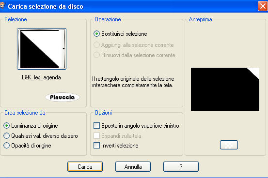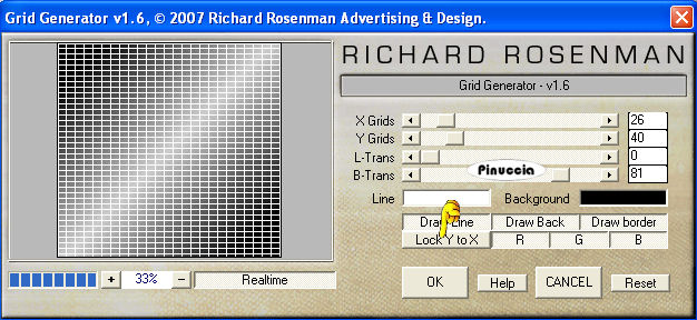 qui puoi trovare qualche risposta ai tuoi dubbi. Se l'argomento che ti interessa non è presente, ti prego di segnalarmelo. Questo tutorial è stato scritto e tradotto con PSP X. Occorrente: Materiale qui Apri il font Gala e minimizzalo nella tua area di lavoro. Lo troverai nella lista dei font disponibili quando ti servirà. L&K Selezione qui da mettere nella cartella Selezioni Filtri: Richard Rosenman - Grid generators qui Mura's Meister - Copies qui Mura's Meister - Pole Transform qui FM Tile Tools qui Per lo script grazie Joke (il suo sito non è più in rete). Per visualizzare lo script qui ![]() Preparazione Imposta il colore di primo piano con il nero (o con un colore scuro del tuo tube). Imposta il colore di sfondo con il bianco. ![]() 1. Apri una nuova immagine BIANCA 550 x 350 pixels. 2. Effetti>Plugins>Richard Rosenman - Grid Generator con i seguenti settaggi: ![]() 3. Se stai usando altri colori: Regola>Tonalità e Saturazione>Viraggio - e scegli un colore chiaro. 4. Livelli>Nuovo livello raster. 5. Attiva lo strumento Forme predefinite - rettangolo ![]() niente selezionato. ![]() 6. eventualmente ingrandisci l'immagine nell'angolo in alto a sinistra, attivando lo zoom o usando la rotellina del mouse.7. traccia un rettangolo che comprenda 2 blocchi orizzontali e 5 verticali. ![]() 8. Attiva lo strumento Bacchetta magica : Esterno:![]() 9. Clicca all'interno del blocco bianco. ![]() 10. Effetti>Effetti 3D>Pulsante: ![]() 11. Selezione>Deseleziona. 12. Livelli>Duplica. 13. Sposta i blocchi come nell'esempio.sempre un blocco di distanza dai bordi. ![]() 14. Livelli>Unisci>Unisci giù. 15. Attiva nuovamente lo strumento Forme rettangolo ![]() e traccia un rettangolo - conservando sempre un blocco di distanza. ![]() ![]() 16. Selezione>Carica/Salva selezione>Carica selezione da disco. Cerca e carica la selezione L&K_les agenda: ![]() 17. Premi sulla tastiera il tasto CANC .18. Selezione>Deseleziona. 19. Attiva lo strumento Penna antialias selezionato,attenzione larghezza 1,50 se stai usando PSP X, se stai usando PSP 9, dimensione 1.00. ![]() 20. Ingrandisci l'immagine nell'angolo in alto a destra, attivando lo zoom o usando la rotellina del mouse. Traccia una linea come nell'esempio. ![]() 21. Effetti>Plugins>Mura's Meister - Copies, con i seguenti settaggi: ![]() 22. Apri il tube L&K_les Agenda gezicht. (se usi un tuo tube: altezza massima 320 pixels). 23. Modifica>Copia. 24. Torna al tuo lavoro e vai a modifica>Incolla come nuovo livello. 25. Sposta il tube nella parte bianca.![]() 26. Livelli>Nuovo livello raster. 27. Attiva nuovamente Forme predefinite rettangolo ![]() eventualmente ingrandisci l'immagine (zoom/mouse). Traccia un rettangolo come nell'esempio. ![]() 28. Livelli>Duplica. 29. Immagine>Capovolgi. 30. Livelli>Unisci>Unisci tutto (attenzione: unisci tutto, NO unisci visibile). 31. Seleziona i due blocchi con la bacchetta magica ![]() ![]() 32. Effetti>Effetti di bordo>Traccia contorno. 33. Mantieni selezionato. 34. Effetti>Effetti di distorsione>Vento: ![]() 35. Selezione>Deseleziona. 36. Apri il tube L&K_lesAgenda_schroef. (Se stai usando altri colori: Regola>Tonalità e saturazione>Viraggio - scegli un colore). 37. Modifica>Copia. 38. Torna al tuo lavoro e vai a Modifica>Incolla come nuovo livello. 39. Posiziona le due viti come nell'esempio.![]() 40. Inverti i colori nella paletta dei materiali in modo che il nero passi a colore di sfondo. Chiudi il colore di primo piano. ![]() 41. Attiva lo strumento Testo , font Gala, dimensione 72 (per PSP 9>48), crea come vettore.![]() 42. Scrivi "Agenda". 43. Oggetti>Allinea>Centra nella tela. 44. Livelli>Converti in livello raster. 45. Effetti>Plugins>Mura's Meister - Pole Transform, con i seguenti settaggi: a seconda del tube che stai usando, gioca con il settaggio "Angle" tra 280-313: ![]() 46. Effetti>Effetti 3D>sfalsa ombra, con i seguenti settaggi: ![]() 47. Immagine>Aggiungi bordatura, 2 pixels, simmetriche, con il colore nero (o un altro colore scuro). 48. Modifica>Copia. 49. Riapri il colore di primo piano e passalo a Gradiente di primo piano/sfondo, con i seguenti settaggi: ![]() ![]() 50. Apri una nuova immagine BIANCA 600 x 580 pixels. 51. Livelli>Nuovo livello raster. 52. Riempi il livello con il gradiente.53. Effetti>Plugins>Richard Rosenman - Grid Generator. clicca su Lock Y to X e imposta i seguenti settaggi: ![]() se stai usando altri colori: Regola>Tonalità e saturazione>Viraggio e scegli un colore chiaro 54. Nella paletta dei livelli abbassa l'opacità di questo livello intorno al 20%. (dipende dai colori che stai usando. 55. Modifica>Incolla come nuovo livello (è in memoria l'immagine copiata al punto 48). 56. Posiziona l'immagine in alto, come nel mio esempio.![]() 57. Effetti>Effetti 3D>Sfalsa ombra, con i seguenti settaggi. ![]() 58. Apri il tube L&K_les_Agenda_Klok, 59. Regola>Tonalità e saturazione>Viraggio, con un colore chiaro: questi i miei settaggi: ![]() 60. Modifica>Copia. 61. Torna al tuo lavoro (600x580) e vai a Modifica>Incolla come nuovo livello. 62. Posiziona l'orologio come nel mio esempio.![]() 63. Apri l'immagine L&K_les_Agenda_Plaatje (se stai usando un altro tube, unisci prima i livelli). 64. Modifica>Copia. 65. Apri L&K_les Agenda_boek. Se stai usando altri colori, eventualmente: Regola>Tonalità e Saturazione>Viraggio, e scegli un colore chiaro 66. Seleziona con la bacchetta magica ![]() le due sezioni trasparenti. ![]() 67. Selezione>Modifica>Espandi - 5 pixels. 68. Livelli>Nuovo livello raster. 69. Modifica>Incolla nella selezione. 70. Livelli>Disponi>Porta sotto. 71. Livelli>Unisci>Unisci visibile. 72. Selezione>Deseleziona. 73. Modifica>Copia. 74. Torna al tuo lavoro 600x580 e vai a Modifica>Incolla come nuovo livello. 75. Posiziona il libro in basso a sinistra.![]() 76. Chiudi il colore di primo piano e imposta il nero come colore di sfondo. ![]() 77. Attiva nuovamente lo strumento Testo ,font Gala, dimensione 36 (dovrai regolare la dimensione a seconda del testo e della ver