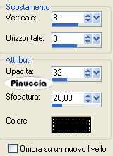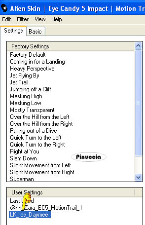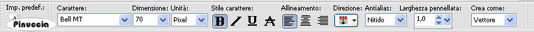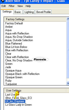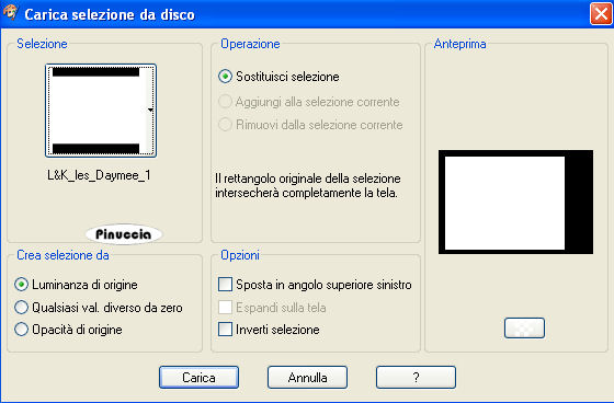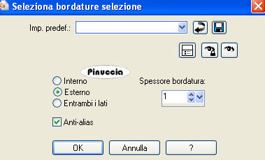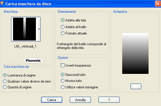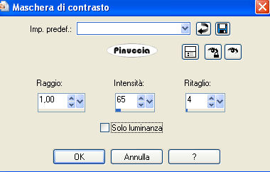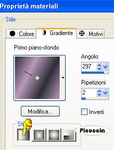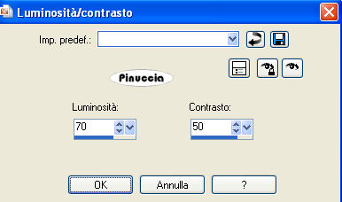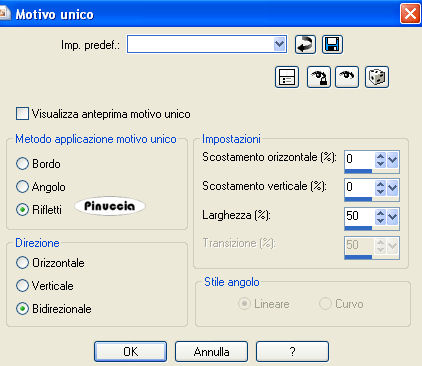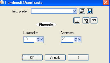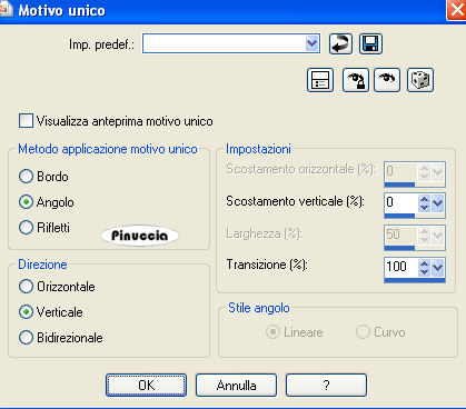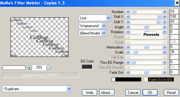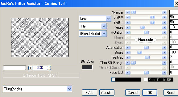 qui puoi trovare qualche risposta ai tuoi dubbi. Se l'argomento che ti interessa non è presente, ti prego di segnalarmelo. Questo tutorial è stato scritto e tradotto con PSP X. Occorrente: Materiale qui Selezioni L&K selecties _les_ Daymee qui da mettere nella cartella Selezioni Maschera L&K masker verticaal: qui da mettere nella cartella Maschere 2 immagini verticali qui font Bell MT qui aprilo e minimizzalo nella tua area di lavoro. Lo troverai nella lista dei font disponibili quando ti servirà. Filtri: Penta.com - Jeans qui Mura's Meister - Copies qui Greg's Factory Output vol. II qui Alien Skin - Eye Candy Impact 5 qui Preset eye candy impact 5 - Glass qui da mettere nella cartella Eye Candy Impact 5>Settigs>Glass. Preset Eye Candy Impact 5 - Motion Trail qui da mettere nella cartella Eye Candy Impact 5>Settings>Motion Trail Per lo script grazie Jetty (il suo sito non è più in rete). Script qui Per visualizzare lo script qui Preparazione: Scegli un colore chiaro e impostalo come colore di primo piano; il mio #b998ba, scegli un colore scuro e impostalo come colore di sfondo; il mio #2e2e37. ![]() Passa il colore di primo piano a Gradiente di primo piano/sfondo con i seguenti settaggi: ![]() La base: 1. Apri una nuova immagine trasparente 740 x 500 pixels, e riempila con il gradiente.2. Regola>Sfocatura>Sfocatura gaussiana - raggio 50. ![]() 3. Effetti>Plugins>Greg's Factory Output vol. II - Poolshadow, con i seguenti settaggi: ![]() 4. Effetti>Effetti di immagine>Motivo unico: ![]() 5. Chiudi il colore di primo piano. ![]() 6. Attiva lo strumento Testo , font Bell MT, dimensione 70,crea come Vettore, e scrivi: Coiffeur ![]() 7. Oggetti>Allinea>Centra nella tela. 8. Livelli>Converti in livello raster. Fai una copia di questa immagine, usando sulla tastiera la combinazione di tasti shift(maiuscola)+D; metti da parte la copia che ti servirà più tardi per lo sfondo, e continua a lavorare sull'originale: 9. Effetti>Plugins>Mura's Meister - Copies, con i seguenti settaggi: ![]() 10. Effetti>Plugins>Alien Skin Eye Candy 5 Impact - Glass, seleziona le impostazioni predefinite L&K_les_Daymee: ![]() e prima di cliccare ok, assicurati sotto la linguetta Basic che sia impostato il colore di sfondo. Per fare questo clicca sul triangolino dei colori (1) per aprire il menu, e seleziona Background Color (2): ![]() 11. Nella paletta dei livelli cambia la modalità di miscelatura di questo livello in Luce diffusa. 12. Livelli>Unisci>Unisci tutto. 13. Selezione>Carica/Salva selezione>Salva selezione da disco. Cerca e carica la selezione L&K les Daymee 1: ![]() 14. Regola>Sfocatura>Sfocatura gaussiana - raggio 50. Mantieni selezionato. 15. Effetti>Effetti 3D>sfalsa ombra: ![]() 16. Selezione>Modifica>Seleziona bordature selezione: ![]() 17. Inverti i colori nella paletta dei materiali per avere il colore scuro come colore di primo piano. ![]() ingrandisci l'immagine per vedere meglio, usando la rotellina del mouse o attivando lo strumento Zoom ![]() 18. Assicurati che la modalità di corrispondenza dello strumento Riempimento sia impostata su Nessuno: ![]() Riempi il bordo selezionato con il colore scuro.![]() 19. Selezione>Deseleziona. 20. Effetti>Plugins>Penta.com - Jeans, con i settaggi standard. ![]() 21. Selezione>Carica/Salva selezione>Carica selezione da disco. Cerca e carica la selezione L&K les Daymee 2: ![]() 22. Regola>Sfocatura>Sfocatura gaussiana, con i settaggi precedenti. Mantieni selezionato. 23. Effetti>Effetti 3D>Sfalsa ombra, con i settaggi precedenti. 24. Regola>Luminosità e contrasto>Luminosità e contrasto: ![]() questi sono i settaggi per i colori usati nel tutorial. Dovrai regolare il settaggio se stai usando altri colori. ![]() 25. Selezione>Carica/Salva selezione>Carica selezione da disco. Cerca e carica la selezione L&K les Daymee 3: ![]() 26. Ingrandisci l'immagine e riempi la selezione con il colore scuro.27. Selezione>Deseleziona. ![]() Le piccole immagini: Apri le due immagini verticali fornite con il tutorial. Le due immagini hanno la dimenzione corretta di 163 x 253 pixels di altezza. ![]() Se vuoi usare le tue immagini verticali, segui questo procedimento (per entrambe le immagini). Prima ridimensiona (Immagine>Ridimensiona...) a 253 pixels di altezza. Quindi (sempre per entrambe le immagini): Regola>Messa a fuoco>Maschera di contrasto. ![]() Per assicurarti che entrambe le immagini abbiano la stessa larghezza, attiva lo strumento Ritaglio ![]() e nella barra di applicazione controlla le dimensioni, regolandole se necessario: ![]() Per entrambe le immagini: 30. Immagine>Aggiungi bordatura, 2 pixels, simmetriche, con il colore scuro. Per entrambe le immagini: 31. Livelli>Carica/Salva maschera>Carica maschera da disco. Cerca e carica la maschera L&K_verticaal_1: ![]() 32. Livelli>Unisci>Unisci gruppo. per entrambe le immagini, poichè sono un po' troppo trasparenti: Livelli>Duplica. ![]() Livelli>Unisci>Unisci giù. E adesso hai le immagini su un solo livello. 33. Attiva la prima immagine e vai a Modifica>Copia. 34. Torna al tuo lavoro e vai a Modifica>Incolla come nuovo livello. 35. Immagine>Ruota per gradi - 20 gradi a destra: ![]() 36. Effetti>Effetti 3D>Sfalsa ombra: ![]() 37. Sposta l'immagine come nell'esempio.![]() 38. Livelli>Duplica. 39. Immagine>Rifletti. 40. Sposta l'immagine come nell'esempio:![]() 41. Attiva la seconda immagine e vai a Modifica>copia. 42. Torna al tuo lavoro e vai a Modifica>Incolla come nuovo livello. 43. Immagine>ruota per gradi - 20 gradi a sinistra: ![]() 44. Effetti>Effetti 3D>Sfalsa ombra, con i settaggi precedenti. 45. Livelli>Disponi>Sposta giù. ![]() 46. Sposta l'immagine come nell'esempio.![]() 47. Livelli>Duplica. 48. Immagine>Rifletti. 49. Sposta il duplicato come nell'esempio.![]() 50. Livelli>Unisci>Unisci tutto. 51. Immagine>Ruota a sinistra. se stai usando PSP 9 - Immagine>Ruota - Ruota 90 gradi in senso antiorario 52. Inverti i colori nella paletta dei materiali. ![]() 53. Attiva lo strumento Testo con i settaggi prec