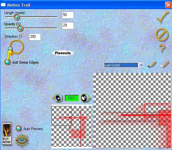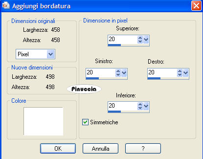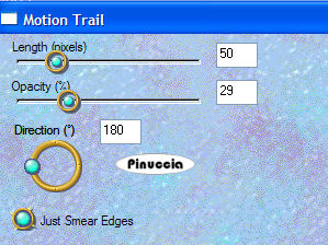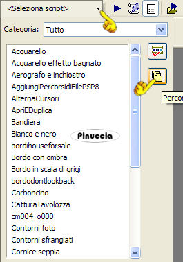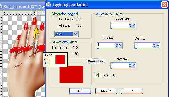 qui puoi trovare qualche risposta ai tuoi dubbi. Se l'argomento che ti interessa non è presente, ti prego di segnalarmelo. Questo tutorial è stato scritto con i settaggi standard di PSP 8. Per tradurlo l'ho eseguito con PSP X. Occorrente: L&Kscript_les farah qui Estrai lo script nella cartella Script sicuri di PSP. Filtri: Simple qui Graphics Plus qui Eye Candy 3.1 qui Tube Suz oops qui Preparazione. Lo script è stato creato con il colore rosso, ma il colore può essere cambiato, per adattarlo ai colori del tuo tube. Nel corso del tutorial, ti indicherò quando questo sarà necessario. 1. Apri una nuova immagine BIANCA 456 x 456 pixels. Queste dimensioni (456x456) sono necessarie per il corretto funzionamento dello script. 2. Immagine>Aggiungi bordatura, 1 pixel, simmetriche, con un colore preso dal tube. Io ho scelto un colore rosso. ![]() passando il mouse sull'immagine, appare l'icona del contagocce, quando scegli il colore, è sufficiente cliccare su quel punto per impostare il colore della bordatura. 3. Immagine>Aggiungi bordatura, 20 pixels, simmetriche, con il colore bianco. ![]() 4. Immagine>Aggiungi bordatura, 1 pixel, simmetriche, nuovamente con il colore rosso. 5. Livelli>Nuovo livello raster. 6. Apri il menu degli Script, cliccando sulla piccola freccia a fianco della finestra. ![]() Se non lo vedi nella tua area di lavoro, vai Visualizza>Barre degli strumenti>Script: ![]() Clicca poi sull'icona della cartella per cercare lo script nella cartella dove lo hai salvato. Seleziona lo script e clicca sul triangolo grande per farlo partire. ![]() Premi ok a tutte le finestre che appariranno nel corso dell'esecuzione. Tuttavia, se clicchi sull'icona indicata dalla manina, lo script non si fermerà mai per farti domande. ![]() Quando lo script avrà finito di lavorare, ti troverai il livello di sfondo bianco chiuso. Lascia tutto come sta. 7. Livelli>Unisci>Unisci visibile, e avrai questo: ![]() Se hai usato un altro tube e un altro colore: Regola>Saturazione e tonalità>Viraggio, con i valori del colore scelto. come usare il Viraggio vedi qui 8. Effetti>Plugins>Eye Candy 3.1 - Motion Trail, con i seguenti settaggi: ![]() 9. Adesso puoi rendere nuovamente visibile il livello di sfondo, cliccando sull'occhio del livello, per togliere la x rossa. ![]() 10. Immagine>Ridimensiona, all'80%, tutti i livelli selezionato. ![]() 11. Apri il tube Suze_oops. 12. Immagine>Ridimensiona, all'80%, tutti i livelli selezionato). 13. Modifica>Copia. 14. Torna al tuo lavoro e vai a Modifica>Incolla>Incolla cme nuovo livello. 15. Posiziona il tube adeguatamente.16. Livelli>Unisci>Unisci tutto. 17. Metti da parte l'immagine per il momento. Per lo sfondo 18. Apri una nuova immagine bianca 1024x450 pixels. 19. Livelli>Nuovo livello raster. 20. Seleziona nuovamente lo script L&Kscript_les Farah, e clicca sul triangolo grande per far partire l'esecuzione. 21. Livelli>Unisci>Unisci visibile. (se hai usato un altro tube: Regola>Saturazione e tonalità>Viraggio, con i valori usati in precedenza). 22. Effetti>Plugins>Eye Candy 3.1 - Motion Trail, con i seguenti settaggi: attenzione: la direzione è variata a 180, il resto rimane come impostato in precedenza. ![]() 23. Effetti>Plugins>Simple - Centre Tile: 24. Effetti>Plugins>Graphics plus - Horizontal Mirror, con i seguenti settaggi: ![]() 25. Livelli>Unisci>Unisci tutto. 26. Torna alla piccola immagine che hai messo da parte prima. 27. Modifica>Copia. 28. Ritorna al tuo lavoro (1024x450) e vai a Modifica>Incolla>Incolla come nuovo livello. 29. Posiziona l'immagine come preferisci.30. Livelli>Unisci>Unisci tutto. ![]() ![]() Se hai problemi o dubbi, o trovi un link non funzionante, o anche soltanto per dirmi che ti è piaciuto, scrivimi. 22 Giugno 2007 |