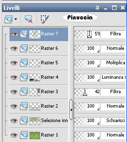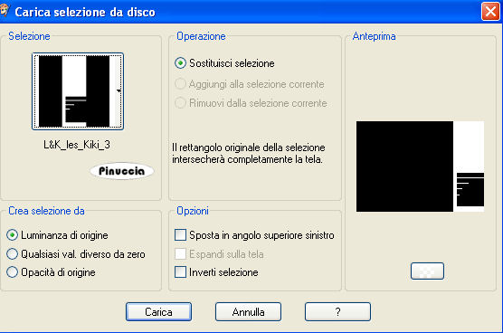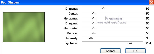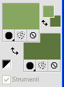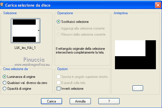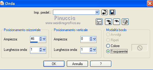 qui puoi trovare qualche risposta ai tuoi dubbi. Se l'argomento che ti interessa non è presente, ti prego di segnalarmelo. Per tradurre questo tutorial ho usato PSP X. Occorrente: Pennelli qui Selezioni qui Font ChaseCallasSh qui Immagine qui Tube Yoka qui Metti i pennelli nella cartella Pennelli. Metti le selezioni nella cartella Selezioni. Apri il font e minimizzalo. Lo troverai nella lista dei font disponibili quando ti servirà. Filtri: Simple qui VanderLee Unplugged X qui AP 01 (innovation) - Lines-Silver Lining qui Greg's Factory Output II qui Xero - Porcelain qui Grazie a Jetty M per lo script speciale creato per questo tutorial. Lo script qui. Preparazione: Imposta il colore di primo piano con un colore scuro scelto dal tuo tube. Per il mio esempio ho usato #5d763e. Imposta il colore di sfondo con un colore più chiaro di quello scelto per il colore di primo piano. Io ho usato #87A660. ![]() 1. Apri una nuova immagine trasparente 700 x 500 pixels. 2. Riempi l'immagine trasparente con il colore scuro di primo piano.3. Effetti>Plugins>Greg's Factory Output vol. II - Pool Shadow: ![]() Sullo stesso livello. 4. Selezione>Carica/Salva selezione>Carica selezione da disco. Cerca e carica la selezione L&K _les _Kiki _1 ![]() 5. Effetti>Effetti di distorsione>Onda, con i seguenti settaggi: ![]() 6. Livelli>Innalza selezione a livello. 7. Selezione>Deseleziona. 8. Nella paletta dei livelli cambia la modalità di miscelatura di questo livello in Schiarisci. ![]() ![]() Duplica questa immagine usando sulla tastiera la combinazione di tasti shift(maiuscola)+D, e metti da parte la copia, che potrà servirti se vorrai realizzare lo script. Continua a lavorare sull'originale. 9. Inverti i colori nella paletta dei materiali. ![]() 10. Livelli>Nuovo livello raster. 11. Selezione>Carica/Salva selezione>Carica selezione da disco. Cerca e carica la selezione L&K _les _Kiki _2: ![]() 12. Riempi la selezione con il colore chiaro di primo piano.13. Selezione>Deseleziona. 14. Effetti>Plugins>Simple - Zoom out and flip. 15. Effetti>Plugins>VanderLee - Unplugged X: seleziona Defocus, e clicca ok. ![]() 16. Effetti>Effetti 3D>Sfalsa ombra, con i seguenti settaggi: ![]() 17. Livelli>Nuovo livello raster. 18. Selezione>Carica/Salva selezione>Carica selezione da disco. Cerca e carica la selezione L&K _les _Kiki _3: ![]() 19. Riempi la selezione con il colore chiaro di primo piano.20. Effetti>Plugins>AP 01 (innovation)>Lines-Silver Lining: seleziona Arrow e imposta Overlay, con i seguenti settaggi: ![]() 21. Selezione>Deseleziona. 22. Nella paletta dei livelli cambia la modalità di miscelatura di questo livello in Filtra, e abbassa l'opacità al 42%. ![]() 23. Effetti>Effetti di bordo>Aumenta. 24. Apri l'immagine L&Kplatje (707x134 pixels) e vai a Modifica>copia. 25. Torna al tuo lavoro e vai a Modifica>Incolla come nuovo livello (non la spostare). 26. Effetti>Effetti di immagine>Scostamento. ![]() 27. Nella paletta dei livelli cambia la modalità di miscelatura di questo livello in Luminanza (esistente). 28. Inverti nuovamente i colori nella paletta dei materiali. ![]() 29. Livelli>Nuovo livello raster. 30. Attiva lo strumento Pennello ![]() cerca e seleziona il pennello L&K les_Kiki_1: ![]() e clicca due volte come nell'esempio: ![]() 31. Nella paletta dei livelli cambia la modalità di miscelatura di questo livello in Moltiplica. ![]() 32. Di nuovo strumento Pennello ![]() cerca e seleziona il pennello L&K les_Kiki_2: ![]() e applica il testo come nell'esempio. ![]() 33. Di nuovo strumento Pennello ![]() cerca e seleziona il pennello L&K les_Kiki_3: ![]() e applicalo due volte come nell'esempio: ![]() ![]() 34. Livelli>Nuovo livello raster. 35. Di nuovo strumento Pennello ![]() cerca e seleziona il pennello L&K les_Kiki_4: ![]() e applicalo come nell'esempio: ![]() 36. Di nuovo strumento pennello ![]() cerca e seleziona il pennello L&K les_Kiki_5: ![]() e applicalo come nell'esempio: ![]() 37. Attiva lo strumento Testo ![]() seleziona il font ChaseCallaSH, dimensione 600, crea come vettore: ![]() 38. Scrivi la maiuscola C. 39. Oggetti>Allinea>Centra nella tela. 40. Livelli>Converti in livello raster. 41. Cambia la modalità di miscelatura di questo livello in Filtra (o Moltiplica, o come ti sembra più adatta ai tuoi colori), e abbassa l'opacità al 59%.