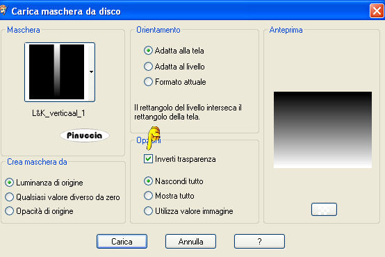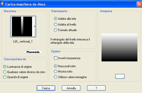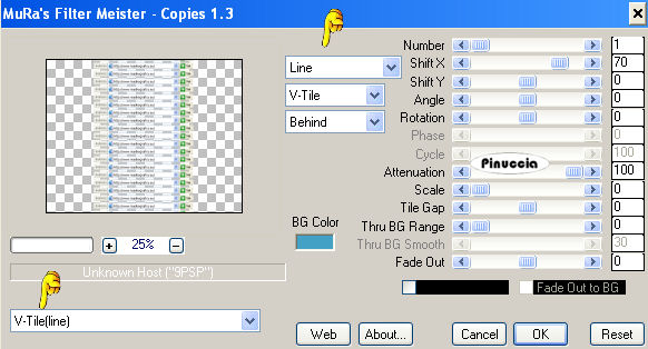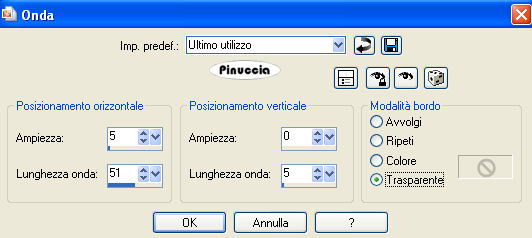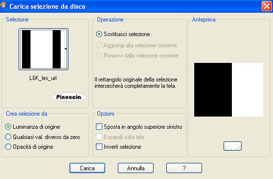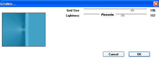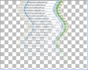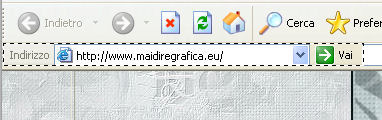 qui puoi trovare qualche risposta ai tuoi dubbi. Se l'argomento che ti interessa non è presente, ti prego di segnalarmelo. Questo tutorial è stato scritto e tradotto con PSP X. Occorrente: Materiale qui Preset Deformazione qui Metti la selezione nella cartella Selezioni. Metti la maschera nella cartella Maschere. Metti il preset "Preset RasterDeform L&K les url" nella cartella Impostazioni Predefinite di PSP. Apri il font e minimizzalo. Lo troverai nella lista dei font disponibili quando ti servirà. Il tube è di Brigitte Filtri: Mura's Meister - Copies qui Balder Olrik qui Tymoes grid 2 qui Xero - Porcelain qui Filter Factory Gallery H qui I filtri Factory Gallery per essere usati devono prima essere convertiti. Quello fornito con il tutorial è già stato convertito. E' sufficiente scompattare il file in una cartella e inserirla nel percorso file di PSP. Jetty ha scritto per questo tutorial uno speciale script Per visitare il suo sito qui Preparazione: Imposta il colore di primo piano con un colore scuro scelto dal tube. Per il mio esempio ho usato #056b93. Imposta il colore di sfondo con un colore chiaro: #43a1c5. ![]() Passa il colore di primo piano a Gradiente di primo piano/sfondo, stile radiale, con i seguenti settaggi. ![]() 1. Prima di tutto dovrai creare un'immagine di un indirizzo internet. Se hai un sito, aprilo su Internet. ![]() 3. Clicca sul tasto Stamp per catturare l'immagine che vedi sullo schermo. ![]() In PSP: Modifica>Incolla come nuova immagine. 4. Adesso dovrai accorciare questo indirizzo. Ingrandisci l'immagine (attivando lo zoom o ruotando la rotellina del mouse). 5. Attiva lo strumento Selezione rettangolo,![]() e ritaglia l'ultimo pezzo della striscia dell'indirizzo, come nell'esempio. ![]() Se le tue impostazioni non prevedono l'utilizzo dell'icona "Vai a", come in questo caso: ![]() ritaglia le icone finali dell'indirizzo. ![]() 6. Attiva lo strumento Deformazione - premendo sulla tastiera il tasto D - e vedrai la selezione circondata da una griglia: ![]() e nella paletta dei livelli la selezione in un livello separato. ![]() 7. Premi sulla griglia con il tasto sinistro del mouse e quando vedrai apparire l'icona dello strumento Spostamento. ![]() trascina la selezione verso sinistra. ![]() 8. Ingrandisci ancora l'immagine e unisci le due parti. ![]() 9. Livelli>Unisci>Unisci tutto. 10. Elimina lo spazio intorno all'indirizzo. Puoi usare lo strumento Ritaglio e cliccare sull'icona per applicare il ritaglio,oppure lo strumento Selezione e poi andare a Immagine>Ritaglia la selezione.Dovresti avere questo. ![]() o questo, se non hai l'icona Vai: ![]() 11. Modifica>Copia. ***** 12. Apri una nuova immagine trasparente 700 x 550 pixels. 13. Modifica>Incolla come nuovo livello. 14. Effetti>Plugins>Mura's Meister - Copies: ![]() 15. Effetti>Effetti di distorsione>Onda: ![]() 16. Livelli>Carica/Salva maschera>Carica maschera da disco. Cerca e carica la maschera L&K verticiaal_1: ![]() 17. Livelli>Unisci>Unisci gruppo. Metti da parte l'immagine per il momento. ***** 18. Apri una nuova immagine trasparente 700 x 550 pixels. 19. Riempi l'immagine trasparente con il gradiente.20. Duplica questo sfondo usando sulla tastiera la combinazione di tasti shift(maiuscola)+D e metti da parte la copia. Continua sull'originale. 21. Effetti>Plugins>Balder Olrik - Select Sharp, con i seguenti settaggi. ![]() 22. Inverti i colori nella paletta dei materiali. ![]() 23. Selezione>Carica/Salva selezione>Carica selezione da disco. Cerca e carica la selezione L&K_les_url: ![]() 24. Riempi la selezione con il colore chiaro.25. Selezione>Inverti. 26. Livelli>Nuovo livello raster. 27. Effetti>Plugins>Tymoes - Gridmaker 2, con i seguenti settaggi: ![]() 28. Selezione>Deseleziona. 29. Premi sulla tastiera il tasto D per attivare lo strumento Deformazione. Apri il menu delle impostazioni e seleziona il preset L&K les url: ![]() E avrai questo: ![]() 30. Livelli>Unisci>Unisci tutto. Clicca sulla manina per liberarti della griglia di deformazione.31. Effetti>Plugins>Filter Factory Gallery H - GridMin: ![]() 32. Imposta il colore scuro come colore di primo piano. ![]() 33. Apri l'immagine "L&K_vorm_les url", e vai a Modifica>Copia. 34. Torna al tuo lavoro e vai a Modifica>Incolla come nuovo livello. 35. Attiva lo strumento Bacchetta magica ![]() ![]() 37. Clicca sulle 7 sezioni, come indicato nelle 2 schermate sottostanti: ![]() ![]() 38. Riempi: ![]() la selezione con il colore scuro. ![]() 39. Effetti>Plugins>Tymoes - Gridmaker 2, con i seguenti settaggi: ![]() 40. Selezione>Deseleziona. 41. Effetti>Effetti 3D>Sfalsa ombra: ![]() 42. Apri l'immagine che hai creato all'inizio del tutorial con l'indirizzo internet. ![]() 43. Modifica>Copia. 44. Torna al tuo lavoro e vai a Modifica>Incolla come nuovo livello. 45. Spostalo a destra, come nell'esempio.46. Nella paletta dei livelli abbassa l'opacità di questo livello intorno al 30%. ![]() ![]() 47. Effetti>Effetti 3D>Sfalsa ombra, con i settaggi precedenti. 48. Apri L&K bol_klein_les url e vai a Modifica>copia. 49. Torna al tuo lavoro e vai a Modifica>Incolla come nuovo livello. per vedere meglio, ingrandisci l'immagine con lo zoom o ruotando la rotellina del mouse.50. Sposta la sfera come nell'esempio:![]() 51. Regola>Tonalità e saturazione>Viraggio: ![]() 52. Livelli>Duplica, e ripeti quattro volte. Sistema le quattro sfere negli altri cerchi, come nell'esempio:![]() 53. Apri L&K bol_groot_les url e vai a Modifica>Copia. 54. Torna al tuo lavoro e vai a Modifica>Incolla come nuovo livello. 55. Posiziona la sfera sul cerchio centrale.![]() 56. Regola>Tonalità e saturazione>Viraggio, con i settaggi precedenti. 57. Apri il tube Mtm_99a_Zkatalys-23 Dec 2005.pspimage e vai a Modifica>Copia. (se usi un altro tube, cerca di mantenere l'altezza di questo tube: 480 pixels). 58. Torna al tuo lavoro e vai a Modifica>Incolla come nuovo livello. 59. Posiziona il tube come preferisci, o vedi il mio esempio.![]() 60. Effetti>Effetti 3D>Sfalsa ombra, con i settag