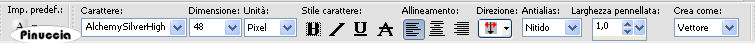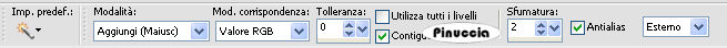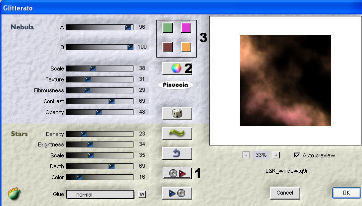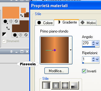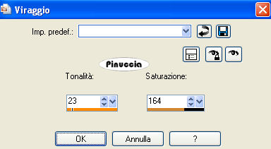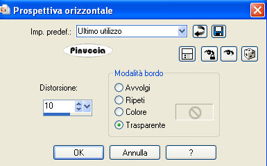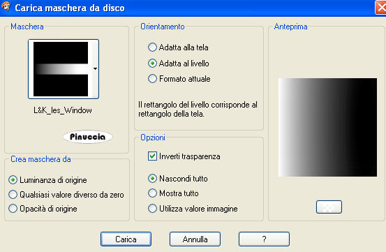 qui puoi trovare qualche risposta ai tuoi dubbi. Se l'argomento che ti interessa non è presente, ti prego di segnalarmelo. Questo tutorial è stato scritto e tradotto con PSP X. Occorrente: Materiale qui Metti la maschera nella cartella Maschere. Apri il font Alchemy Silverhigh e minimizzalo nella tua area di lavoro. Lo troverai nella lista dei font disponibili quando ti servirà. Il tube usato per questo tutorial è di Filly Impostazioni predefinite per lo strumento Deformazione. Per chi usa PSP 9 qui Per chi usa PSP X qui Filtri: Flaming Pear - Glitterato qui Preset Glitterato qui da mettere in una cartella a scelta. Visroz 4 qui Preset Vizros qui da mettere in una cartella a scelta. Alien Skin Eye Candy 5 Impact qui Preset Eye Candy Impact 5 - Extrude qui da mettere nella cartella Alien SKin Eye Candy 5 Impact>Settings>Extrude Alien Skin Eye Candy 5 Texture qui Preset Eye Candy Impact 5 - Brickwall qui da mettere nella cartella Alien SKin Eye Candy 5 Textures>Settings>Brickwall Un ringraziamento a Jetty per lo speciale script creato per questo tutorial. Lo script qui Per visualizzare lo script qui ![]() Imposta il colore di primo piano con un colore scelto dal tube. Nel mio esempio arancio chiaro #ef924c. Imposta come colore di sfondo un colore scuro scelto dal tube. Nel mio esempio #633920. Passa il colore di primo piano a Gradiente di primo piano/sfondo, con i seguenti settaggi: ![]() ![]() 1. Apri una nuova immagine trasparente 550 x 550 pixels. 2. Riempi l'immagine trasparente con il gradiente.3. Effetti>Plugins>Vizros 4 - Cylinder: clicca su Load, per cercare e selezionare, nella cartella dove lo hai scompattato, il preset L&K_les _windows.vzc che imposterà automaticamente le impostazioni corrette. Clicca ok. ![]() 4. Attiva lo strumento Bacchetta magica , sfumatura 2:![]() 5. Clicca nella parte bianca dell'immagine. ![]() 6. Selezione>Modifica>Espandi - 2 pixels. 7. Premi sulla tastiera il tasto CANC ![]() 8. Selezione>Deseleziona. Metti da parte l'immagine del cilindro che ti servirà più tardi: ![]() Vetrina 9. Apri una nuova immagine NERA 550 x 550 pixels. 10. Effetti>Plugins>Flaming Pear - Glitterato. Clicca sull'icona del disco (1) per cercare e selezionare il preset L&K Window. I colori sono quelli utilizzati nel tutorial. Se stai usando altri colori, clicca sul bottone (2) e (3) per cambiare manualmente i colori. ![]() 11. Apri il tube Misted_filly_ (570) Sisters.pspimage. (questo tube ha un'altezza di 550 pixels; tieni conto di questa dimensione se vuoi usare altri tubes). 12. Modifica>Copia. 13. Torna al tuo lavoro e vai a Modifica>Incolla come nuovo livello. 14. Se stai usando il tube fornito con il tutorial non occorre spostarlo, è già correttamente posizionato. Se stai usando un altro tube posizionalo come ti sembra meglio.15. Nella paletta dei livelli cambia la modalità di miscelatura di questo livello in Filtra, e abbassa un po' l'opacità. ![]() 16. Apri il tube L&K les_ les window 1 e vai a Modifica>Copia. 17. Torna al tuo lavoro e vai a Modifica>Incolla come nuovo livello. 18. Regola>Tonalità e Saturazione>Viraggio: ![]() 19. Sposta il tube in basso a destra.![]() 20. Apri il tube L&K les_ les window 2 e vai a Modifica>Copia. 21. Torna al tuo lavoro e vai a Modifica>Incolla come nuovo livello. 22. Regola>Tonalità e Saturazione>Viraggio, con i settaggi precedenti. 23. Nella paletta dei livelli abbassa l'opacità di questo livello al 32%. ![]() 24. Attiva l'immagine del cilindro che hai messo da parte al punto 8. ![]() 25. Modifica>Copia. 26. Torna al tuo lavoro e vai a Modifica>Incolla come nuovo livello. 27. Posiziona il cilindro come nell'esempio (o secondo il tube che stai usando).![]() 28. Apri il tube L&K les_ les window 3 e vai a Modifica>Copia. 29. Torna al tuo lavoro e vai a Modifica>Incolla come nuovo livello. 30. Sposta il tube come nell'esempio.![]() 31. Nella paletta dei livelli abbassa l'opacità di questo livello all'87%. ![]() 32. Apri l'immagine L&K les_ les window 4 e vai a Modifica>Copia. 33. Torna al tuo lavoro e vai a Modifica>Incolla come nuovo livello. 34. Nella paletta dei livelli abbassa l'opacità di questo livello al 36%. ![]() 35. Chiudi il colore di primo piano e imposta il colore di sfondo con il nero. ![]() 36. Attiva lo strumento Testo , font Alchemy Silverhigh, dimensione 48: ![]() 37. Scrivi un testo - nell'esempio "new look 2006" e posizionalo. ![]() Livelli>Converti in livello raster. 38. Nella paletta dei livelli cambia la modalità di miscelatura di questo livello in Luce diffusa. ![]() 39. Effetti>Effetti 3D>Sfalsa ombra, con i seguenti settaggi, colore bianco. ![]() 40. Ripeti l'Effetto Sfalsa ombra, cambiando il colore dell'ombra con il nero. ![]() 41. La finestra è finita: Livelli>Unisci>Unisci visibile. 42. Effetti>Effetti geometrici>Prospettiva orizzontale: ![]() 43. Modifica>Copia. ![]() Muro 44. Apri una nuova immagine trasparente 650 x 750 pixels. 45. Effetti>Plugins>Alien Skin Eye Candy 5 Textures - Brick Wall, seleziona il preset L&K_les _Window_brick e clicca ok. ![]() 46. Effetti>Effetti geometrici>Prospettiva orizzontale, con i settaggi precedenti. 47. Immagine>Dimensione tela, con i seguenti settaggi: ![]() 48. Se stai usando un altro colore: Regola>Tonalità e saturazione>Viraggio, con i settaggi precedenti. 49. Modifica>Incolla come nuovo livello (la finestra vetrina è in memoria). Mantieni selezionato. Adesso dovrai fare la parte superiore e il fondo della finestra: 50. Scegli un colore da impostare come colore di sfondo, io ho usato il grigio. ![]() 51. Attiva lo strumento Forme predefinite - rettangolo ,