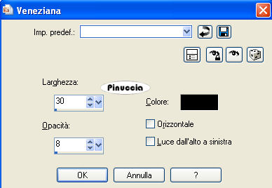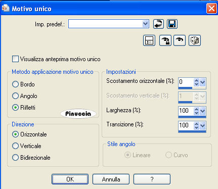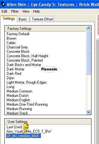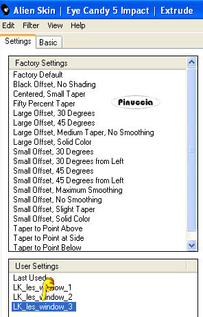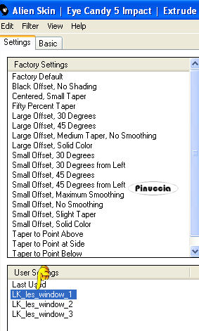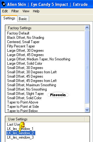 vettore e antialias selezionati:![]() 52. Traccia una striscia in alto come nell'esempio. ![]() 53. Livelli>Converti in livello raster. 54. Attiva lo strumento Deformazione (o premi sulla tastiera il tasto D). 55. Apri il menu delle impostazioni predefinite e seleziona L&K_ les_ window_1: ![]() clicca sulla manina per liberarti della griglia56. Effetti>Plugins>Alien Skin Eye Candy 5 Impact - Extrude. seleziona il preset LK_les_window_1 e clicca ok. ![]() 57. Di nuovo: Effetti>Plugins>Alien Skin Eye Candy 5 Impact - Extrude, seleziona il preset LK_les_window_2 e clicca ok. ![]() 58. Ancora: Effetti>Plugins>Alien Skin Eye Candy 5 Impact - Extrude, sempre con il preset LK_les_window_2, clicca ok, e avrai due bordi. ![]() 59. Effetti>Effetti geometrici>Prospettiva orizzontale, con i settaggi precedenti. 60. Di nuovo premi sulla tastiera il tasto D per attivare lo strumento Deformazione. Seleziona il preset L&K_ les_ window_2: ![]() 61. Effetti>Effetti 3D>Sfalsa ombra, con i seguenti settaggi. ![]() 62. Attiva nuovamente lo strumento Forme predefinite, rettangolo ![]() e traccia una striscia in basso, come nell'esempio. ![]() 63. Livelli>Converti in livello raster. 64. Attiva nuovamente lo strumento Deformazione (tasto D sulla tastiera). seleziona il preset L&K_ les_ window_3: ![]() 65. Effetti>Effetti di trama>Veneziana. ![]() 66. Di nuovo: Effetti>Plugins>Alien Skin Eye Candy 5 Impact - Extrude, seleziona il preset LK_les_window_3: ![]() 67. Effetti>Effetti geometrici>Prospettiva orizzontale, con i settaggi precedenti. 68. Di nuovo premi il tasto D sulla tastiera per attivare lo strumento Deformazione. Seleziona il preset L&K_ les_ window_4: ![]() 69. Effetti>Effetti 3D>Sfalsa ombra, con i settaggi precedenti. 70. Livelli>Unisci>Unisci tutto e salva in formato jpg. ![]() Sfondo (se vuoi realizzare lo script) 71. Apri una nuova immagine trasparente 250 x 250 pixels. 72. Effetti>Plugins>Alien Skin Eye Candy 5 Textures - Brick Wall, con i settaggi precedenti. 73. Eventualmente: Regola>Tonalità e Saturazione>Viraggio, con i settaggi precedenti. 74. Livelli>Nuovo livello raster. 75. Riempi con il colore grigio.76. Livelli>Carica/Salva maschera>Carica maschera da disco. Cerca e carica la maschera L&K window, inverti trasparenza selezionato. ![]() 77. Livelli>Unisci>Unisci tutto. 78. Effetti>Effetti di immagine>Motivo unico. ![]() Salva in formato jpg. ![]() Se hai problemi o dubbi, o trovi un link non funzionante, o anche soltanto per dirmi che ti è piaciuto, .23 Settembre 2008 |