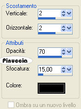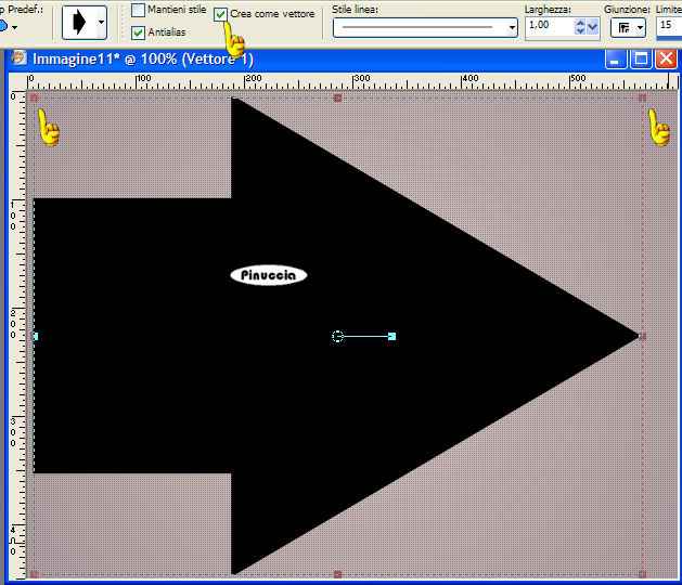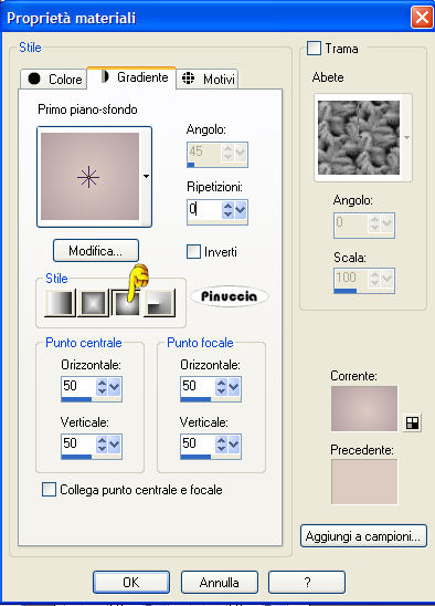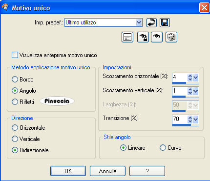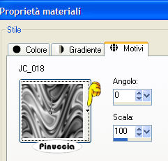 qui puoi trovare qualche risposta ai tuoi dubbi. Se l'argomento che ti interessa non è presente, ti prego di segnalarmelo. Occorrente: Materiale qui I tubes usati sono di Lamanouche, Kara e DWorisch. Metti le Forme Pijl 26 nella cartella Forme predefinite di PSP. Filtri: Dsb-Flux qui AAA filter qui FM Tile Tools qui Imposta il colore di primo piano con #DDCAC1, e il colore di sfondo con #B39FA4. Passa il colore di primo piano a Gradiente di primo piano/sfondo, con i seguenti settaggi: ![]() 1. Apri una nuova immagine trasparente 600 x 450 pixels e riempila con il gradiente.2. Effetti>Plugins>AAA-filter: ![]() 3. Attiva lo strumento Forme predefinite , e seleziona la forma Pijl 26:Chiudi il colore di primo piano e imposta il nero come colore di sfondo. Traccia la forma, come mostrato nella schermata sotto: ![]() 4. Livelli>Converti in livello raster. 5. Seleziona la forma con la Bacchetta magica ![]() e riempila con il gradiente.6. Effetti>Effetti 3D>Sfalsa ombra: ![]() 7. Selezione>Nessuna selezione. 8. Livelli>Duplica. 9. Immagine>Rifletti. 10. Abbassa l'opacità di entrambi i livelli al 50%. 11. Togli la visibilità al livello inferiore. 12. Livelli>Unisci>Unisci visibile. 13. Rendi nuovamente visibile il livello inferiore. 14. Effetti>Plugins>DSB-Flux, Linear transmission: ![]() 15. Effetti>Effetti di bordo>Aumenta di più. 16. Apri il tube You and I e vai a Modifica>Copia. Torna al tuo lavoro e vai a Modifica>Incolla>Incolla come nuovo livello. Spostalo al centro dell'immagine.17. Apri gli altri tube, copiali e posizionali correttamente, vedi il mio esempio. 18. Livelli>Unisci>Unisci visibile. 19. Attiva lo strumento Testo ![]() Chiudi il colore di primo piano, seleziona il font FiolexGirls, dimensione 48. Scrivi il tuo testo. Regola>Messa a fuoco>Metti a fuoco, 1 o 2 volte. 20. Effetti>Effetti 3D>Sfalsa ombra: ![]() Selezione>Nessuna selezione. 21. Immagine>Aggiungi bordatura, 1 pixel, simmetriche, con il colore di primo piano. Immagine>Aggiungi bordatura, 25 pixels, simmetriche, con il colore di sfondo. 22. Selezione il bordo da 25 pixels con la bacchetta magica ![]() 23. Passa il colore di primo piano su Motivi, e seleziona il motivo KC-018. ![]() Riempi la selezione con questo motivo.24. Effetti>Effetti di bordo>Aumenta. Ripeti l'Effetto di bordo. 25. Effetti>Effetti 3D>Smusso a incasso: ![]() 26. Selezione>Nessuna selezione. 27. Immagine>Aggiungi bordatura, 1 pixel, simmetriche, con il colore di primo piano. L'immagine è finita. Se vuoi realizzare lo script, ti occorrono anche due immagini di sfondo. Per creare la prima: 1. Apri una nuova immagine trasparente 200 x 200 pixels, e riempila con il colore di sfondo (#b39fa4).2. Passa di nuovo il colore di primo piano a Motivi. Livelli>Nuovo livello raster, e riempi con il Motivo.Abbassa l'opacità di questo livello al 20% e cambia la modalità di miscelatura in Filtra. 3. Effetti>Plugins>FM Tile Tools, Blend Emboss, con i settaggi standard, e ripeti 1 o 2 volte. ![]() Effetti>Effetti di bordo>Aumenta di più. 4. Effetti>Effetti di immagine>Motivo unico: ![]() 5. Salva l'immagine come sfondo-1. ********** Per creare la seconda immagine di sfondo: 1. Apri il tube fldcsdw (quello con l'immagine dei fiori). 2. Livelli>Nuovo livello raster. Riempi il nuovo livello con il colore di primo piano.Livelli>Disponi>Porta sotto. 3. Effetti>Effetti di immagine>Motivo unico, con i settaggi precedenti. 4. Salva come sfondo-2. Per eseguire lo script Apri lo script di Jeannette che trovi qui, e segui i preliminari descritti alla fine di questo tutorial, fino all'inserimento dello sfondo-suono. Dopo aver inserito lo sfondo-suono, dovrai indicare allo script dove trovare le immagini. Clicca su Origine e identifica i punti di inserimento dei vari elementi dello script. Se hai messo tutti i file in una cartella, il percorso del suono ti servirà da guida per l'inserimento degli altri files: ti basterà cambiare l'ultima parte: il nome e l'estensione. Nella schermata sotto sono indicati i punti in cui dovrai inserire il percorso delle due immagini di sfondo. ![]() Ricorda che, contemporaneamente, puoi controllare il risultato andando su Anteprima. Nella schermata sotto è indicato il punto in cui dovrai inserire il percorso dell'immagine principale. fai molta attenzione alle estensioni dei files e alle maiuscole-minuscole, che devono essere corrette, altrimenti lo script non troverà le immagini da inserire Clicca adesso sulla linguetta Modifica, per aggiungere il testo. clicca due volte all'interno del riquadro. Apparirà la cornice che ti dà il via libera per sostituire il testo esistente e aggiungere il tuo. ![]() Quando hai finito, clicca all'esterno e la cornice sparirà. Il tuo messaggio con lo script è pronto per il tasto Invia. Se non vuoi spedirlo e vuoi soltanto tenerlo per te, vai a File>Salva con nome e mettilo in una cartella a tua scelta. Ricordati, però, che quando vorrai rivedere lo script, i files devono trovarsi nello stesso posto. Se nel frattempo li avrai spostati, vedrai soltanto delle crocette rosse. Avvertimento: non devi preoccuparti se in Modifica non vedrai il messaggio come dovrebbe essere (per fare questo devi andare in Anteprima). Ricorda ancora che per inviare il messaggio ti devi posizionare su Modifica. ![]() Se hai problemi o dubbi, o trovi un link non funzionante, o anche soltanto per un saluto, scrivimi 2 Maggio 2007 |