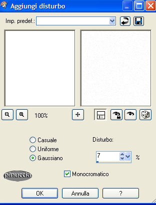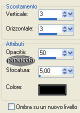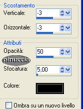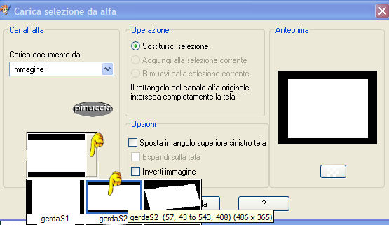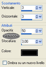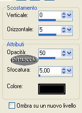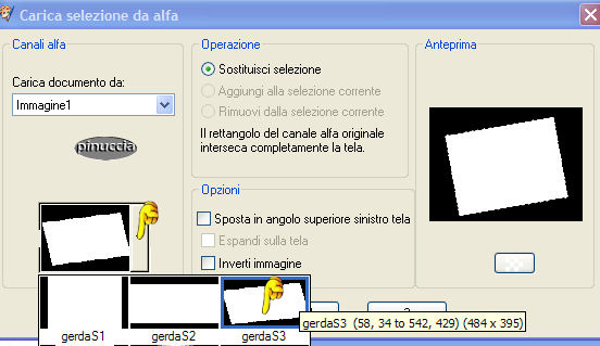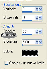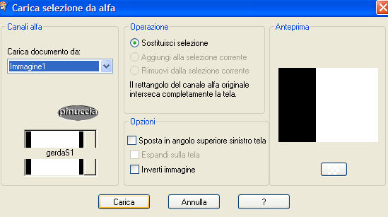 qui puoi trovare qualche risposta ai tuoi dubbi. Se l'argomento che ti interessa non è presente, ti prego di segnalarmelo. Materiale qui 1. Apri l'immagine lettertosantagerda.psp. L'immagine non è vuota, ma contiene le selezioni salvate sul canale alfa. Riempi l'immagine con il colore #0a442e.Livelli>Nuovo livello raster. Imposta come colore di primo piano #2b7d60. Attiva lo strumento Pennello ![]() cerca e seleziona il pennello Simplybrush-mascara05 e applicalo quattro volte sull'immagine. ![]() Livelli>Unisci>Unisci tutto. 2. Livelli>Nuovo livello raster. Selezione>Carica/Salva selezione>Carica selezione da canale alfa. Cerca e carica la selezione GerdaS1. ![]() Riempi la selezione con il colore bianco.Nella paletta dei livelli abbassa l'opacità di questo livello al 16%. Selezione>Nessuna selezione. Apri il file LettertosantaSEgerda. Tutti i livelli sono chiusi, aprili, posizionati sul livello "Decogerda" e vai a Modifica>Copia. Torna al tuo lavoro e vai a Modifica>Incolla>Incolla come nuovo livello. Spostalo contro la parte chiara.![]() Livelli>Unisci>Unisci tutto. 3. Imposta il colore di primo piano con il colore verde scuro (#0a442e). Livelli>Nuovo livello raster. Selezione>Carica/Salva selezione>Carica selezione da canale alfa. Cerca e carica la Selezione GerdaS2. ![]() Riempila con il colore verde scuro (#0a442e).Selezione>Modifica>Contrai, di 2 pixels. Riempi con il colore bianco.Regola>Aggiungi/rimuovi disturbo>Aggiungi disturbo: ![]() Selezione>Nessuna selezione. Immagine>Ruota>Ruota per gradi, 10 gradi a sinistra, tutti i livelli non selezionato. ![]() Effetti>Effetti 3D>Sfalsa ombra, con i seguenti settaggi, colore nero: ![]() Livelli>Nuovo livello raster. Selezione>Carica/Salva selezione>Carica selezione da canale alfa. Cerca e carica la selezione GerdaS3: ![]() Riempi la selezione con il colore verde scuro (#0a442e).Selezione>Modifica>Contrai, di 2 pixels. Riempi con il colore bianco.Selezione>Nessuna selezione. Effetti>Effetti 3D>Sfalsa ombra, con i seguenti settaggi, colore nero: ![]() Ripeti l'Effetto Sfalsa ombra, ma cambiando verticale e orizzontale a -3: ![]() 4. Attenzione. Se stai usando tue immagini, dovrai adattare questo passaggio, perchè la selezione è stata creata per le immagini fornite con il tutorial. Livelli>nuovo livello raster. Selezione>Carica/Salva selezione>Carica selezione da canale alfa. Cerca e carica la selezione GerdaS4. Apri l'immagine 26700 e vai a Modifica>Copia. Torna al tuo lavoro e vai a Modifica>Incolla>Incolla nella selezione. Sullo stesso livello: Selezione>Carica/Salva selezione>Carica selezione da canale alfa. Cerca e carica la selezione GerdaS3. Selezione>Modifica>Contrai di 2 pixels. Selezione>Inverti. Premi sulla tastiera il tasto CANC. Selezione>Nessuna selezione. Livelli>Nuovo livello raster. Selezione>Carica/Salva selezione>Carica selezione da canale alfa. Cerca e carica la selezione GerdaS6 (il triangolo). Riempi la selezione con il colore verde scuro (#0a442e).Selezione>Modifica>Contrai di 2 pixels. Riempi con il colore bianco.Regola>Aggiungi/rimuovi disturbo>Aggiungi disturbo: ![]() Selezione>Nessuna selezione. Effetti>Effetti 3D>Sfalsa ombra, con i seguenti settaggi, colore nero: ![]() Effetti>Effetti 3D>Sfalsa ombra, con i seguenti settaggi, colore nero: ![]() 5. Chiudi il livello inferiore e posizionati su uno degli altri livelli. Livelli>Unisci>Unisci visibile. Riapri il livello di sfondo e attiva il livello superiore (Uniti). Sullo stesso livello: Selezione>Carica/Salva selezione>Carica selezione da canale alfa. Cerca e carica la selezione GerdaS5. Premi sulla tastiera il tasto CANC. Livelli>Nuovo livello raster. Di nuovo: Selezione>Carica/salva selezione>Carica selezione da canale alfa: cerca e carica la selezione GerdaS5 Riempi la selezione con un Motivo oro.Selezione>Modifica>Contrai, di 2 pixels. Premi sulla tastiera il tasto CANC. Regola>Messa a fuoco>Metti a fuoco. Selezione>Nessuna selezione. 6. Attiva LettertosantagerdaSE, attiva il livello Decogerda2 e vai a Modifica>Copia. Torna al tuo lavoro e vai a Modifica>Incolla>Incolla come nuovo livello. Spostalo in alto, come mostrato nell'esempio.![]() Attiva lo strumento Selezione a mano libera ![]() e seleziona la parte mostrata nella schermata sotto: ![]() Premi sulla tastiera il tasto CANC. Attiva lo strumento Gomma e cancella la parte residua del cordoncino:![]() 7. Apri l'immagine 27602. Immagine>Aggiungi bordatura, 2 pixels, simmetriche, con il colore verde scuro (#0a442e). Immagine>Aggiungi bordatura, 2 pixels, simmetriche, con il colore bianco. Immagine>Aggiungi bordatura, 2 pixels, simmetriche, con il colore verde scuro (#0a442e). Modifica>Copia. Torna al tuo lavoro e vai a Modifica>Incolla>Incolla come nuovo livello. Effetti>Effetti 3D>Sfalsa ombra, con i seguenti settaggi, colore nero: ![]() Immagine>Ridimensiona, del 95%, tutti i livelli non selezionato. Spostalo facendo combaciare l'angolo superiore sinistro con l'angolo della busta.![]() Attiva LettertosantagerdaSE. Posizionati sul livello della clip (clipgerda) e vai a Modifica>Copia. Torna al tuo lavoro e vai a Modifica>Incolla>Incolla come nuovo livello. Spostalo a sinistra della piccola immagine bordata,vedi l'esempio della tag finale. Attiva LettertosantagerdaSE. Posizionati sul livello dello spillo (speldgerda) e vai a Modifica>Copia. Torna al tuo lavoro e vai a Modifica>Incolla>Incolla come nuovo livello. Spostalo in basso a destra, vedi l'esempio finale.Con la gomma cancella la parte centrale,in modo da dare l'idea che lo spillo sia infilzato nella busta. (per ottenere lo stesso risultato puoi anche usare selezionare la parte interessatae poi premere sulla tastiera il tasto CANC). ![]() Attiva LettertosantagerdaSE. Posizionati sul livello del nastrino (strikgerda) e vai a Modifica>Copia. Torna al tuo lavoro e vai a Modifica>Incolla>Incolla come nuovo livello. Posizionalo sulla punta della busta.Imposta il colore di primo piano con il bianco. Livelli>Nuovo livello raster. Attiva lo strumento Pe