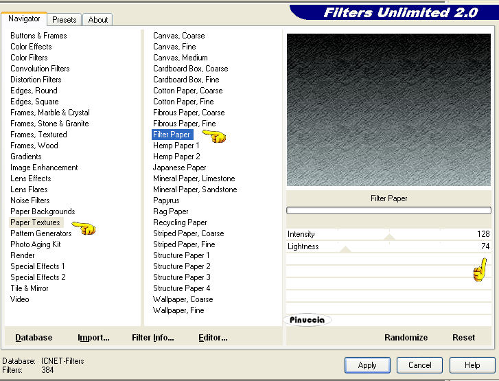 10. Effetti>Plugins>Filter unlimted / Paper textures /Filter paper, con i settaggi standard:
