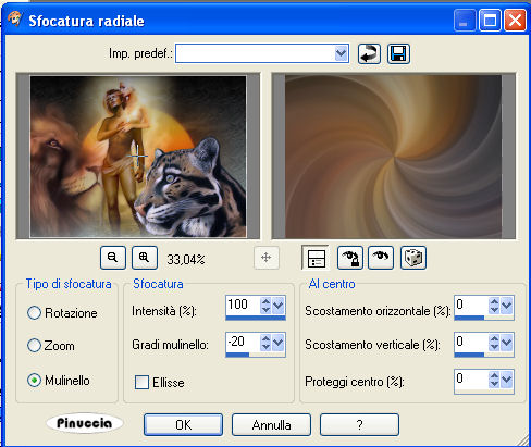 22. Regola>Sfocatura>Sfocatura radiale, con i seguenti settaggi: