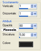 qui puoi trovare qualche risposta ai tuoi dubbi. Se l'argomento che ti interessa non è presente, ti prego di segnalarmelo. Questo tutorial è stato scritto in PSP 9, ma può essere eseguiti anche con le altre versioni del programma. Occorrente: Materiale qui Ho usato diversi scraptubes * e un tube di Monique. Per favore, rispetta il lavoro degli autori e mantieni i tubes al loro stato originale. *I tubes per lo scrap sono stati acquistati personalmente dall'autrice del tutorial. Puoi utilizzarli soltanto per questo tutorial, e per il tuo uso personale. Non puoi offrirli in vendita, o condividerli, o usarli per i tuoi tutorial, o per altri scopi commerciali. Leggi attentamente le condizioni e i termini d'uso dei disegnatori di scrap. altrimenti l'autrice smetterà di scrivere tutorial di scrap. Grazie per la tua collaborazione. Filtro FM Tile Tools qui Attenzione: prima di copiare i tubes, ricordati di posizionarti sul livello del tube. 1. Apri una nuova immagine trasparente 660 x 500 pixels. Selezione>Seleziona tutto. 2. Apri "Achtergrond_01" e vai a Modifica>Copia. Torna al tuo lavoro e vai a Modifica>Incolla>Incolla nella selezione. Selezione>Nessuna selezione. 3. Apri "Achtergrond_02" e vai a Modifica>Copia. Torna al tuo lavoro e vai a Modifica>Incolla>Incolla come nuovo livello. Spostalo a sinistra, vedi il mio esempio.4. Apri il tube "Lace" e vai a Modifica>Copia. Torna al tuo lavoro e vai a Modifica>Incolla>Incolla come nuovo livello. Nella paletta dei livelli trascina questo livello sotto il livello Achtergrond_02. ![]() Effetti>Effetti 3D>Sfalsa ombra, con i seguenti settaggi: ![]() Ripeti l'Effetto Sfalsa ombra, cambiando verticale e orizzontale a -1. Attiva il livello superiore. 5. Apri "Achtergrond_03" e vai a Modifica>Copia. Torna al tuo lavoro e vai a Modifica>Incolla>Incolla come nuovo livello. Spostalo a sinistra, vedi il mio esempio.![]() Effetti>Effetti 3D>Sfalsa ombra, con i seguenti settaggi: ![]() Ripeti l'Effetto Sfalsa ombra, cambiando verticale e orizzontale a -1. 6. Apri il tube "band" e vai a Modifica>Copia. Torna al tuo lavoro e vai a Modifica>Incolla>Incolla come nuovo livello. Spostalo sotto, vedi il mio esempio.Effetti>Effetti 3D>Sfalsa ombra, con i seguenti settaggi: ![]() Ripeti l'Effetto Sfalsa ombra, cambiando verticale e orizzontale a -1. 7. Apri "Achtergrond_04" e vai a Modifica>Copia. Torna al tuo lavoro e vai a Modifica>Incolla>Incolla come nuovo livello. 8. Apri il tube "Frame" e vai a Modifica>Copia. Torna al tuo lavoro e vai a Modifica>Incolla>Incolla come nuovo livello. La cornice si posizionerà esattamente sopra lo sfondo, vedi l'esempio sotto. ![]() Per spostare contemporaneamente i due livelli (sfondo e cornice), attiva il collegamento nella paletta dei livelli, assegnando a entrambi il numero 1. ![]() Effetti>Effetti 3D>Sfalsa ombra: ![]() Ripeti l'Effetto Sfalsa ombra cambiando verticale e orizzontale a -1. 9. Apri il tube "Tubed_by_monique 42_2513. Immagine>Ridimensiona, al 70%, bicubica. Modifica>Copia. Torna al tuo lavoro e vai a Modifica>Incolla>Incolla come nuovo livello. Spostalo nella cornice,in modo che la bambina sia appoggiata al bordo inferiore della cornice, e la valigia del bambino rimanga fuori dalla cornice. Livelli>Duplica. Effetti>Plugins>FM Tile Tools - Blend Emboss, con i settaggi standard. ![]() 10. Apri il tube "Haakje" e vai a Modifica>Copia. Torna al tuo lavoro e vai a Modifica>Incolla>Incolla come nuovo livello. Spostalo in alto a sinistra, come nell'esempio.![]() Effetti>Effetti 3D>Sfalsa ombra: ![]() Ripeti l'Effetto Sfalsa ombra cambiando verticale e orizzontale a -1. 11. Apri il tube "Label" e vai a Modifica>Copia. Torna al tuo lavoro e vai a Modifica>Incolla>Incolla come nuovo livello. Spostalo sopra l'uncino:![]() Effetti>Effetti 3D>Sfalsa ombra, con i settaggi precedenti. 12. Apri il tube "Labelknop" e vai a Modifica>Copia. Torna al tuo lavoro e vai a Modifica>Incolla>Incolla come nuovo livello. Spostalo sulla targhetta.![]() 13. Apri il tube "Strik" e vai a Modifica>Copia. Torna al tuo lavoro e vai a Modifica>Incolla>Incolla come nuovo livello. Spostalo a destra della cornice, vedi il mio esempio.Regola>Messa a fuoco>Maschera di contrasto, con i seguenti settaggi: (nel tutorial originale non è indicato se spuntare o no la luminanza. Ho provato entrambe le opzioni, e non ho notato grandi differenze) ![]() Effetti>Effetti 3D>Sfalsa ombra: ![]() Ripeti l'Effetto Sfalsa ombra, cambiando verticale e orizzontale a -1. 14. Apri il tube "Deco_Element" e vai a Modifica>Copia. Torna al tuo lavoro e vai a Modifica>Incolla>Incolla come nuovo livello. Spostalo a destra, sopra la striscia.Effetti>Effetti 3D>Sfalsa ombra: ![]() 15. Apri il tube "Schild" e vai a Modifica>Copia. Torna al tuo lavoro e vai a Modifica>Incolla>Incolla come nuovo livello. Posizionalo sotto la cornice.Effetti>Effetti 3D>Sfalsa ombra: ![]() Ripeti l'Effetto Sfalsa ombra, cambiando verticale e orizzontale a -1. 16. Apri il tube "Nagels" e vai a Modifica>Copia. Torna al tuo lavoro e vai a Modifica>Incolla>Incolla come nuovo livello. Spostalo sopra il tube precedente, in modo che coincida esattamente con i fori.![]() 17. Controlla che tutti i tube siano al loro posto. Se necessario puoi ancora spostarli un po' per sistemarli meglio. Quando sei soddisfatto: Livelli>Unisci>Unisci tutto. 18. Immagine>Aggiungi bordatura, 15 pixels, simmetriche, con il colore bianco. Seleziona il bordo con la bacchetta magica , sfumatura 0.Apri il file "Achtergrond_04". Nella paletta dei materiali passa il colore di primo piano a Motivi. Apri il menu cliccando sulla freccetta a fianco del box, e troverai il file nella lista dei motivi disponibili. Impostalo, con i seguenti settaggi: ![]() Riempi la selezione con questo Motivo.Effetti>Effetti 3D>Sfalsa ombra: ![]() Ripeti l'Effetto Sfalsa ombra, cambiando verticale e orizzontale a -1. 19. Mantieni selezionato. Effetti>Effetti 3D>Smusso a incasso, con i seguenti settaggi: ![]() 20. Scrivi il tuo testo sulla targhetta. Eventu