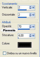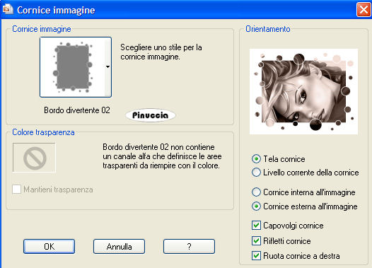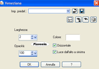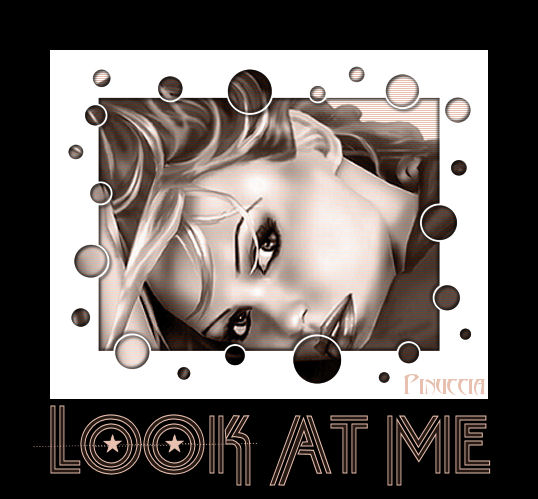 qui puoi trovare qualche risposta ai tuoi dubbi. Se l'argomento che ti interessa non è presente, ti prego di segnalarmelo. Materiale qui Metti il pennello nella cartella dei Pennelli. Apri il font Tabulation Twin e minimizzalo nella tua area di lavoro. Lo troverai nella lista dei font disponibili, quando ti servirà. Imposta il colore di primo piano con #e7c0af e il colore di sfondo con #271913. 1. Apri il tube Garv-transparent face. 2. Livelli>Nuovo livello raster. Riempi il livello con il colore di primo piano.Livelli>Disponi>Sposta giù. Effetti>Effetti di trama>Veneziana: ![]() 3. Attiva nella paletta dei livelli il livello del tube. Cambia la modalità di miscelatura di questo livello in Luminanza (esistente). Regola>Messa a fuoco>Metti a fuoco. 4. Immagine>Ridimensiona, al 110%, tutti i livelli selezionato. Ripeti Immagine>Ridimensiona, al 110%. più velocemente, puoi andare a Modifica>Ripeti Ridimensiona, oppure usando sulla tastiera la combinazione di tasti Ctrl+Y. 5. Livelli>Unisci>Unisci tutto. 6. Immagine>Cornice-immagine, cerca e seleziona la cornice Bordo diventente 02 (standard in PSP X), con i seguenti settaggi: ![]() Se stai usando PSP 9 e non trovi questa cornice, clicca qui 7. Effetti>Effetti 3D>Sfalsa ombra: ![]() Ripeti l'Effetto Sfalsa ombra, ma cambiando verticale e orizzontale a -2, 8. Immagine>Aggiungi bordatura, simmetriche non selezionato, con il colore nero: ![]() 9. Attiva lo strumento Testo ,seleziona il font Tabulation Twin, dimensione 72, pennellata 1. Scrivi Look at me, tutto in maiuscolo. 10. Livelli>Nuovo livello raster. Attiva lo strumento Pennello ![]() cerca e seleziona il pennello cross stitched star 006, e applicalo con il colore di primo piano sopra le lettere (vedi l'esempio finale). 11. Livelli>Unisci>Unisci tutto. 12. Aggiungi il tuo nome e salva in formato jpg. ![]() Se hai problemi o dubbi, o trovi un link non funzionante, o anche soltanto per un saluto, scrivimi 8 Maggio 2007 |