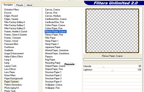 9. Effetti>Plugins>Filters Unlimited 2.0 - Paper Textures - Fibrous paper Coarse, con i settaggi standard.