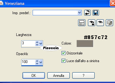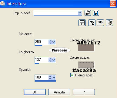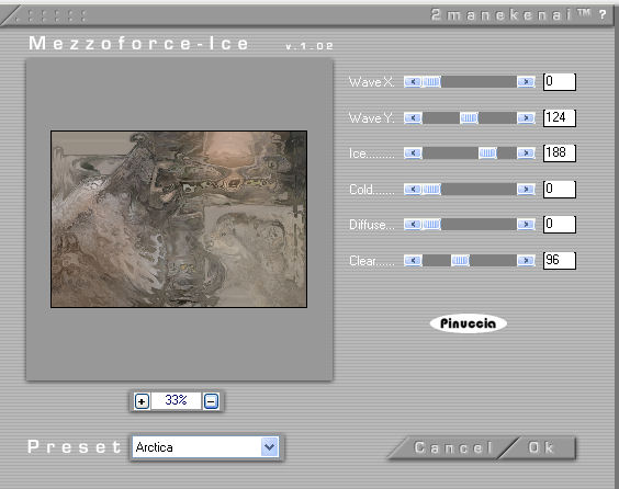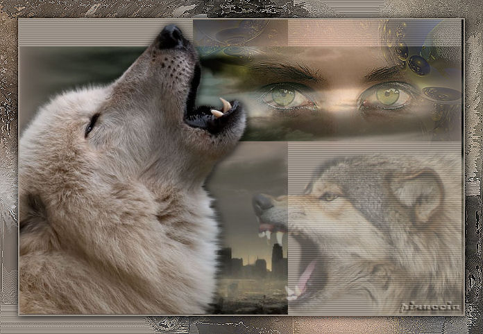 qui puoi trovare qualche risposta ai tuoi dubbi. Se l'argomento che ti interessa non è presente, ti prego di segnalarmelo. Questo tutorial è stato scritto con PSP X, ma può essere eseguito anche con le altre versioni di PSP. Un ringraziamento agli autori del materiale che ho ricevuto tramite vari gruppi. Materiale qui Filtro: Mezzoforce-Ice 1.02 qui 1. Apri l'immagine 78.jpg. Duplicala con shift+D e chiudi l'originale. La copia sarà la tua area di lavoro. 2. Effetti>Effetti di trama>Intessitura, con i seguenti settaggi, scegli dalle tue immagini un colore scuro e uno chiaro: ![]() 3. Seleziona con la bacchetta magica le parti chiari dell'intessitura.Effetti>Effetti di trama>Veneziana, con i seguenti settaggi, con un colore scuro preso dall'immagine: io ho scelto #857c72. ![]() 4. Apri l'immagine con gli occhi e vai a Modifica>Copia. Torna al tuo lavoro e vai a Modifica>Incolla come nuovo livello. Posiziona il tube in alto a destra.Abbassa l'opacità di questo livello al 60%. Apri l'immagine Saphire_Canis_Lupus e vai a Modifica>Copia. Torna al tuo lavoro e vai a Modifica>Incolla come nuovo livello. Sposta il lupo in basso a destra, come nel mio esempio.Abbassa l'opacità di questo livello al 40%. Apri l'immagine Saphire_GraphicDream e vai a Modifica>Copia. Torna al tuo lavoro e vai a Modifica>Incolla come nuovo livello. Sposta il lupo a sinistra.Effetti>Effetti 3D>Sfalsa ombra, con i seguenti settaggi: ![]() 5. Livelli>Unisci>Unisci tutto. Modifica>Copia. 6. Immagine>Aggiungi bordatura, 2 pixels, simmetriche, con un colore chiaro preso dall'immagine. Immagine>Aggiungi bordatura, 26 pixels, simmetriche, con il colore bianco. Seleziona il bordo bianco con la Bacchetta magica ![]() Modifica>Incolla nella selezione. Effetti>Plugins>Mezzoforce-Ice, con i seguenti settaggi: attenzione, nella lista dei plugins lo trovi in cima con la dicitura "2manekenai". ![]() Effetti>Effetti di bordo>Aumenta. Immagine>Capovolgi. Selezione>Inverti. Effetti>Effetti 3D>Sfalsa ombra: ![]() Selezione>Deseleziona. 7. Aggiungi il tuo watermark e salva in formato jpg. ![]() Se hai problemi o dubbi, o trovi un link non funzionante, scrivimi 30 Aprile 2007 |