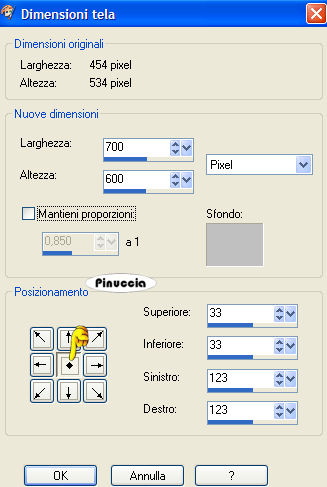 6. Immagine>Dimensione tela, e imposta 700 x 600 pixels, posizionamento centrale: