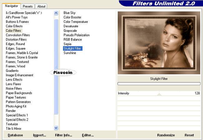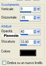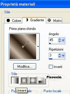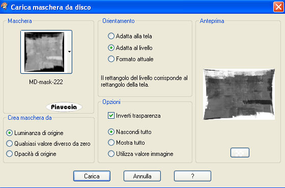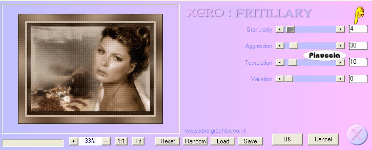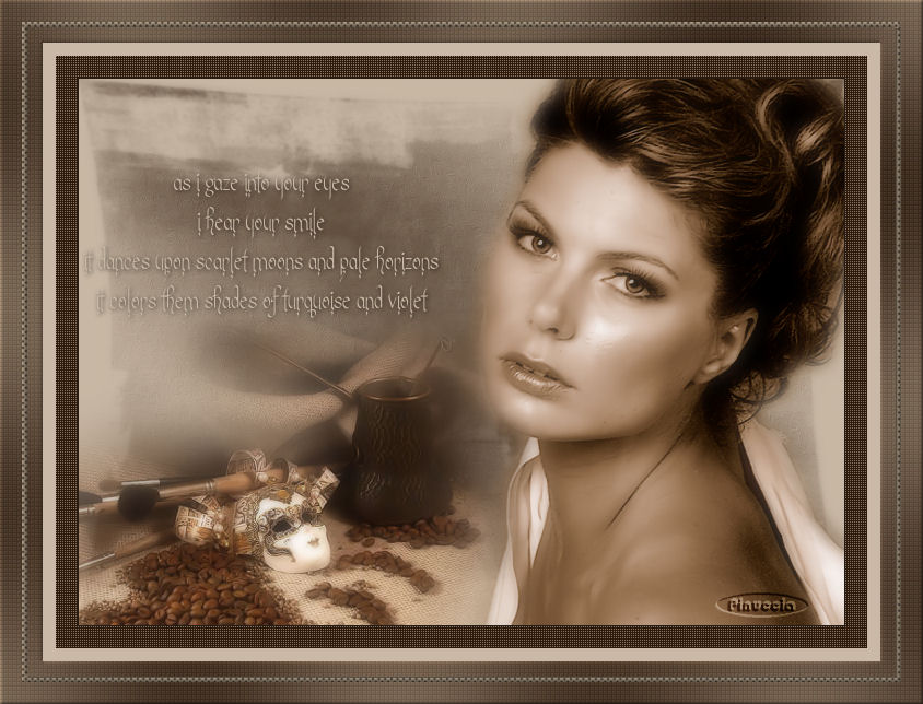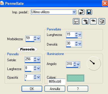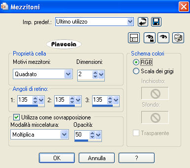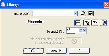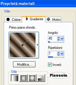 qui puoi trovare qualche risposta ai tuoi dubbi. Se l'argomento che ti interessa non è presente, ti prego di segnalarmelo. Questo tutorial è stato scritto con PSP 9, ma può essere eseguito anche con le altre versioni di PSP. Occorrente: Materiale qui Per questo tutorial ho usato tubes di Marif e Christine. Per favore, rispetta il lavoro degli autori e mantieni i tubes al loro stato originale. Metti la maschera nella cartella Maschere. Importa il pennello in PSP. Come fare vedi qui Filtri: Filters Unlimited qui Xero - Porcelain; Mistifier qui Xero - Fritillary qui Penta.com - Color Dot qui 1. Apri una nuova immagine trasparente 700 x 500 pixels. Imposta il colore di primo piano con #2c190a, e il colore di sfondo con #c9b9a6. Passa il colore di primo piano a Gradiente di primo piano/sfondo, con i seguenti settaggi: ![]() Riempi l'immagine con il gradiente.Regola>Sfocatura>Sfocatura gaussiana, raggio 30. ![]() 3. Effetti>Effetti tecniche di disegno>Pennellate: ![]() 3. Livelli>Nuovo livello raster. Riempi con il colore chiaro di sfondo.4. Livelli>Carica/Salva maschera>Carica maschera da disco. Cerca e carica la maschera "MD-mask-222": ![]() 5. Livelli>Unisci>Unisci gruppo. 6. Apri il tube "Marif_2007_03Mars_misted_decor0132", e vai a Modifica>Copia. Torna al tuo lavoro e vai a Modifica>Incolla>Incolla come nuovo livello. Sposta il tube nell'angolo in basso a sinistra.7. Apri il tube "Chrismist_Glamour_VIX", e vai a Modifica>Copia. Torna al tuo lavoro e vai a Modifica>Incolla come nuovo livello. Sposta il tube a destra.Regola>Messa a fuoco>Maschera di contrasto: ![]() Effetti>Effetti 3D>sfalsa ombra, con i seguenti settaggi: ![]() 8. Livelli>Unisci>Unisci tutto. Effetti>Plugins>Xero - Porcelain: ![]() Effetti>Plugins>Xero - Mistifier, con i settaggi standard: ![]() 9. Immagine>Aggiungi bordatura, 1 pixel, simmetriche, con il colore #241c16. Immagine>Aggiungi bordatura, 20 pixels, simmetriche, con il colore #2c190a. Seleziona questo bordo con la bacchetta magica ![]() ![]() Effetti>Plugins>Penta.com - Color Dot, con i settaggi standard: ![]() Selezione>Nessuna selezione. 10. Immagine>Aggiungi bordatura, 51 pixels, simmetriche, con il colore #241c16. Seleziona questo bordo con la bacchetta magica ![]() ![]() Effetti>Effetti di distorsione>Allarga. ![]() 11. Seleziona nuovamente il bordo scuro con la bacchetta magica ![]() Premi sulla tastiera il tasto CANC. Selezione>Seleziona tutto. Selezione>modifica>Contrai - 39 pixels. Selezione>Inverti. 12. Cambia i settaggi del gradiente: ![]() Riempi la selezione con questo gradiente.Regola>sfocatura>Sfocatura gaussiana, raggio 50. ![]() Effetti>Plugins>Filters Unlimited 2.0 - Color filters - Skylight Filter, con i settaggi standard. ![]() 13. Effetti>Plugins>Xero - Fritillary, con i seguenti settaggi. ![]() Effetti>Effetti 3D>Smusso a incasso. ![]() 14. Livelli>Nuovo livello raster. Selezione>Seleziona tutto. Selezione>Modifica>Contrai - 20 pixels. Riempi la selezione con il colore #c7b7a3.Selezione>Modifica>Contrai - 5 pixels. Premi sulla tastiera il tasto CANC. 15. Selezione>Nessuna selezione. Effetti>Effetti artistici>Mezzitoni: ![]() Effetti>Effetti 3D>Smusso a incasso, con i settaggi usati al punto 13. 16. Livelli>Nuovo livello raster. Imposta il colore di primo piano con #c7b7a3. Attiva lo strumento Pennello ,cerca e seleziona il pennello "textkris 14", e applicalo a sinistra, al centro dell'immagine. Effetti>Effetti 3D>Sfalsa ombra: ![]() 17. Aggiungi il tuo nome e/o il tuo watermark. Livelli>Unisci>Unisci tutto e salva in formato jpg. ![]() Se hai problemi o dubbi, o trovi un link non funzionante, o anche soltanto per un saluto, scrivimi. 23 Maggio 2008 |