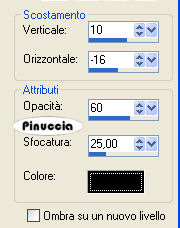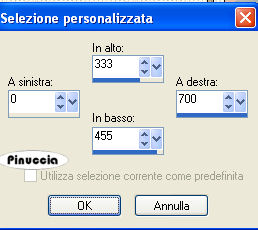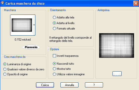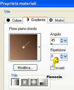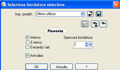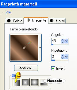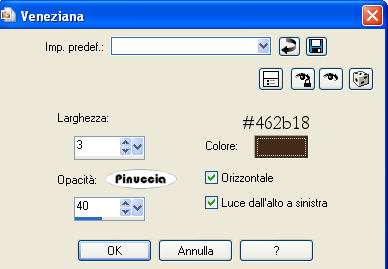 qui puoi trovare qualche risposta ai tuoi dubbi. Se l'argomento che ti interessa non è presente, ti prego di segnalarmelo. Questo tutorial è stato scritto con PSP 9, ma può essere eseguito anche con le altre versioni di PSP. Occorrente: Materiale qui Per questo tutorial ho usato tubes di Marif, MarieL e Sincorrigible. Per favore, rispetta il lavoro degli autori e mantieni i tubes al loro stato originale. Filtri: FM Tile Tools qui Jeux de Ligne qui Graphics Plus qui Metti la Maschera nella cartella Maschere. Apri il Motivo Gold Foil e minimizzalo nella tua area di lavoro. Lo troverai nella lista dei motivi disponibili quando ti servirà. Apri il font Mandalay e minimizzalo nella tua area di lavoro. Lo troverai nella lista dei motivi disponibili quando ti servirà. 1. Apri una nuova immagine trasparente 700 x 500 pixels. Imposta il colore di primo piano con #b78a6b, e il colore di sfondo con #311c0d. Passa il colore di sfondo a Gradiente di primo piano/sfondo, con i seguenti settaggi: ![]() Riempi l'immagine trasparente con il gradiente.ricorda che il gradiente è impostato come colore di sfondo; quindi, per riempire, devi cliccare con il tasto destro del mouse Regola>Sfocatura>Sfocatura gaussiana, raggio 30. ![]() Livelli>nuovo livello raster. Riempi questo livello con il colore chiaro di primo piano.2. Livelli>Carica/Salva maschera>Carica maschera da disco. Cerca e carica la maschera 0.152-wicked. ![]() Livelli>Unisci>Unisci gruppo. 3. Apri il tube "Marif_2007_05mai", e vai a Modifica>Copia. Torna al tuo lavoro e vai a Modifica>Incolla>Incolla come nuovo livello. Sposta il tube a sinistra.Cambia la modalità di miscelatura di questo livello in Luminanza (esistente), e abbassa l'opacità al 48%. Effetti>Plugins>FM Tile Tools - Blend Emboss, con i settaggi standard: ![]() 4. Apri il tube "Mariel_2006_05Mai_PiGe03t", e vai a Modifica>Copia. Torna al tuo lavoro e vai a Modifica>Incolla>Incolla come nuovo livello. Immagine>Ridimensiona, al 55%, bicubica, tutti i livelli non selezionato. ![]() Sposta questo tube a sinistra.Regola>Saturazione e tonalità>Viraggio: ![]() ![]() 5. Attiva lo strumento Selezione , rettangolo,clicca su Selezione personalizzata ,impostando i seguenti settaggi. ![]() 6. Livelli>Nuovo livello raster. Cambia il colore di primo piano con #f3d2b7. Riempi la selezione con questo colore.Abbassa l'opacità di questo livello al 46%. Effetti>Plugins>Jeux de Lignes - Entrelacement. ![]() 7. Selezione>Modifica>Seleziona bordature selezione: ![]() 8. Livelli>Nuovo livello raster. Passa il colore di primo piano a Motivi e seleziona il Motivo Gold Fill: ![]() Riempi la selezione con questo motivo.Effetti>Effetti 3D>Smusso a incasso: ![]() Selezione>Nessuna selezione. 9. Apri "SinTubes", e vai a Modifica>Copia. Torna al tuo lavoro e vai a Modifica>Incolla>Incolla come nuovo livello. Sposta questo tube a destra.Effetti>Effetti 3D>Sfalsa ombra: ![]() 10. Imposta il colore di sfondo con #edcaaa, mantieni il colore di primo piano impostato con il motivo oro. Attiva lo strumento Testo ,scegli un bel font. Io ho usato il font "Mandalay SSi" (nello zip), dimensione 72, pennellata 1. Scrivi il tuo testo. Livelli>Converti in livello raster. Effetti>Effetti 3D>Sfalsa ombra: ![]() Livelli>Unisci>Unisci tutto. 11. Imposta il colore di primo piano con #b78a6b, e il colore di sfondo con #311c0d. Immagine>Aggiungi bordatura, 1 pixel, simmetriche, con il colore di sfondo: #311c0d. Immagine>Aggiungi bordatura, 5 pixels, simmetriche, con il colore bianco. Seleziona il bordo bianco con la bacchetta magica ![]() ![]() Passa il colore di primo piano a Gradiente, con i settaggi del passo 1, inverti non selezionato. ![]() Riempi la selezione con questo gradiente.Effetti>Plugins>Graphics Plus - Cross Shadow, con i settaggi standard. ![]() Selezione>Nessuna selezione. Immagine>Aggiungi bordatura, 1 pixel, simmetriche, con il colore #311c0d. 12. Immagine>Aggiungi bordatura, 20 pixels, simmetriche, con il colore #b78a6b. Effetti>Effetti di trama>Veneziana: ![]() 13. Selezione>Seleziona tutto. Selezione>Modifica>Contrai, di 2 pixels. Selezione>Inverti. 14. Livelli>Nuovo livello raster. Riempi con il motivo oro.Effetti>Effetti 3D>Smusso a incasso, con i settaggi usati al punto 8. Selezione>Nessuna selezione. 15. Livelli>Unisci>Unisci tutto. Aggiungi il tuo nome e/o il tuo watermark e salva in formato jpg. ![]() Se hai problemi o dubbi, o trovi un link non funzionante, o anche soltanto per un saluto, scrivimi. 28 Gennaio 2008 |