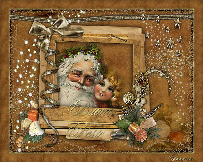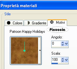 qui puoi trovare qualche risposta ai tuoi dubbi. Se l'argomento che ti interessa non è presente, ti prego di segnalarmelo. Questo tutorial è stato scritto con PSP 9, ma può essere eseguito anche con le altre versioni di PSP. Occorrente: Materiale qui Per questo tutorial ho usato un tube di Suzi Sgai e Mou, e diversi scraptubes.* Per favore, rispetta il lavoro degli autori e mantieni i tubes al loro stato originale. Metti i motivi "Gold" e "Patroon Happy Holidays" nella cartella Motivi. Se li apri e minimizzi in PSP, li troverai nella lista dei motivi disponibili, quando ti serviranno. Apri il font e minimizzalo nella tua area di lavoro. Lo troverai nella lista dei font disponibili, quando ti servirà. *I tubes per lo scrap sono stati acquistati personalmente dall'autrice del tutorial. Puoi utilizzarli soltanto per questo tutorial, e per il tuo uso personale. Non puoi offrirli in vendita, o condividerli, o usarli per i tuoi tutorial, o per altri scopi commerciali. Leggi attentamente le condizioni e i termini d'uso dei disegnatori di scrap. altrimenti l'autrice smetterà di scrivere tutorial di scrap. Grazie per la tua collaborazione. Filtro: FM Tile Tools qui 1. Apri una nuova immagine trasparente 640 x 500 pixels. Selezione>Seleziona tutto. 2. Apri "Achtergrond" e vai a Modifica>copia. Torna all'immagine trasparente e vai a Modifica>Incolla>incolla nella selezione. Selezione>Nessuna selezione. 3. Apri il tube "Christmas-ornament", e vai a Modifica>copia. Torna al tuo lavoro e vai a Modifica>Incolla>Incolla come nuovo livello. Sposta questo tube in basso a sinistra.Effetti>Effetti 3D>Sfalsa ombra: ![]() Ripeti l'Effetto Sfalsa ombra, ma cambiando verticale e orizzontale a -1. Regola>Messa a fuoco>Maschera di contrasto. ![]() 4. Apri il tube "Frame", e vai a Modifica>copia. Torna al tuo lavoro e vai a Modifica>Incolla>Incolla come nuovo livello. E' già correttamente posizionato. 5. Apri "Achtergrond_Frame". Apri il tube PH_Santa_03" e vai a Modifica>copia. Torna ad "Achtergrond Frame" e vai a Modifica>Incolla>Incolla come nuovo livello. Immagine>Ridimensiona, al 70%, tutti i livelli non selezionato. Effetti>Plugins>FM Tile Tools - Blend Emboss, con i settaggi standard. ![]() 6. Livelli>Unisci>Unisci tutto. Modifica>Copia. Torna al tuo lavoro (l'immagine 640x500 pixels) e vai a Modifica>Incolla>Incolla come nuovo livello. Nella paletta dei livelli sposta questo livello sotto il livello della cornice. naturalmente, se vuoi, puoi anche usare altre immagini.