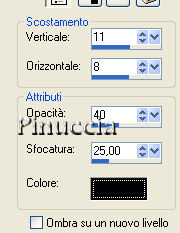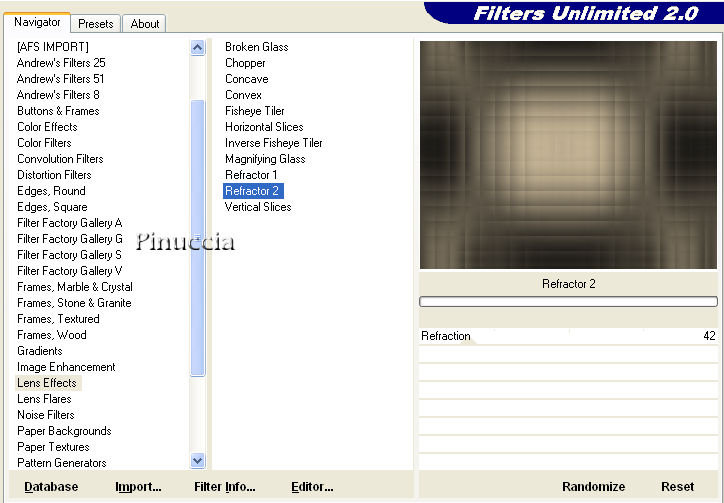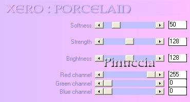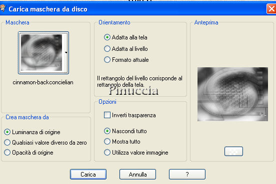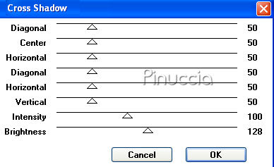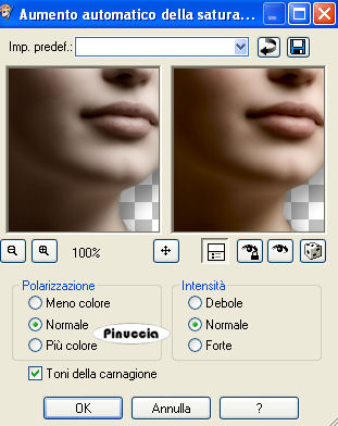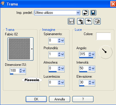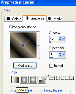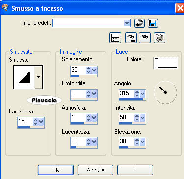 qui puoi trovare qualche risposta ai tuoi dubbi. Se l'argomento che ti interessa non è presente, ti prego di segnalarmelo. Questo tutorial è stato scritto con PSP 9, ma può essere eseguito anche con le altre versioni di PSP. Occorrente: Materiale qui Per questo tutorial ho usato tubes di Gini, Mou e MA. Per favore, rispetta il lavoro degli autori e mantieni i tubes al loro stato originale. Metti il pennello nella cartella dei Pennelli. Metti la maschera nella cartella delle Maschere. Metti la trama nella cartella delle Trame. Filtro: Graphics Plus qui Filters Unlimited 2.0 qui FM Tile Tools qui Penta.com - Color Dot qui Xero qui 1. Apri una nuova immagine trasparente 700 x 540 pixels. Imposta il colore di primo piano con #9e9178, e il colore di sfondo con #080808. Passa il colore di primo piano a Gradiente lineare: ![]() Riempi l'immagine trasparente con il gradiente.Regola>Sfocatura>Sfocatura gaussiana, raggio 40. ![]() Effetti>Plugins>Graphics Plus - Cross Shadow: ![]() 2. Effetti>Plugins>Simple - 4 Way Average. Effetti>Plugins>Filters Unlimited 2.0 - Lens Effects - Refractor 2: ![]() 3. Regola>Sfocatura>Sfocatura gaussiana, raggio 10. ![]() Livelli>Duplica. Immagine>Ridimensiona, al 95%, tutti i livelli non selezionato. 4. Cambia la modalità di miscelatura di questo livello in Luce diffusa, e abbassa l'opacità al 74%. 5. Livelli>Nuovo livello raster. Imposta il colore di sfondo con #eedcb8, e riempi il nuovo livello con questo colore.per riempire con il colore di sfondo, devi cliccare con il tasto destro del mouse 6. Livelli>Carica/Salva maschera>Carica maschera da disco: Cerca e carica la maschera "cinnamon-backconcelian", con i seguenti settaggi: ![]() 7. Livelli>Unisci>unisci gruppo. Cambia la modalità di miscelatura di questo livello in Filtra, e abbassa l'opacità al 26%. 8. Livelli>Nuovo livello raster. Selezione>Seleziona tutto. 9. Apri il tube "ScenicLakeMistedByGini_28-17-06", e vai a Modifica>copia. Torna al tuo lavoro e vai a Modifica>Incolla>Incolla nella selezione. Cambia la modalità di miscelatura di questo livello in Luminanza (esistente), e abbassa l'opacità al 46%. Effetti>Plugins>FM Tile Tools - Blend Emboss, con i settaggi standard. ![]() 10. Selezione>Nessuna selezione. 11. Apri il tube "MA_fall155". Immagine>Rifletti. Modifica>Copia. Torna al tuo lavoro e vai a Modifica>Incolla come nuovo livello. Cambia la modalità di miscelatura di questo livello in Luminanza (esistente). Sposta il tube in basso a destra.12. Livelli>Unisci>Unisci tutto. Effetti>Plugins>Xero - Porcelain: ![]() 13. Livelli>Nuovo livello raster. Selezione>Seleziona tutto. Selezione>modifica>Contrai, di 20 pixels. Selezione>Inverti. Riempi con il colore di primo piano #9e9178.Effetti>Plugins>Penta.com - Color Dot, con i settaggi standard. ![]() Abbassa l'opacità di questo livello al 34%. Selezione>Nessuna selezione. 14. Apri il tube "mou_beauty2", e vai a Modifica>Copia. Torna al tuo lavoro e vai a Modifica>Incolla>Incolla come nuovo livello. Livelli>Disponi>Sposta giù. Sposta il tube a sinistra, la testa contro il bordo chiaro.15. Effetti>Effetti 3D>Sfalsa ombra: ![]() Effetti>Plugins>Xero - Porcelain: ![]() Regola>Aumento automatico della saturazione. ![]() Se stai usando PSP X, questa funzione si ottiene con Regola>Correzione fotografica intelligente, (utilizzando il dispositivo di scorrimento manuale) 16. Livelli>Nuovo livello raster. Imposta il colore di primo piano con #eedcb8. Attiva lo strumento Pennello ![]() cerca e seleziona il pennello "lexaliciousbrushes_qoutes_likeporcelainfragile", e applicalo, cliccando con il tasto sinistro del mouse per usare il colore di primo piano, sul lato destro dell'immagine. Effetti>Effetti 3D>Sfalsa ombra: ![]() 17. Livelli>Unisci>Unisci tutto. Immagine>Aggiungi bordatura, 45 pixels, simmetriche, con il colore #241c16. Selezione>Seleziona tutto. Selezione>Modifica>Contrai, di 30 pixels. Selezione>Inverti. Livelli>nuovo livello raster. Riempi con il colore #9e9178.Effetti>Plugins>Penta.com - Color Dot, con i settaggi precedenti. Abbassa l'opacità di questo livello al 52%. 18. Selezione>Nessuna selezione. Immagine>Aggiungi bordatura, 1 pixel, simmetriche, con il colore #241c16. Seleziona il bordo scuro con la bacchetta magica ![]() ![]() Effetti>Effetti di trama>Trama, seleziona la trama Fabric 02, con i seguenti settaggi: ![]() 19. Effetti>Effetti 3D>Smusso a incasso: ![]() Aggiungi il tuo nome e/o il tuo watermark, e salva in formato jpg. ![]() Se hai problemi o dubbi, o trovi un link non funzionante, o anche soltanto per un saluto, scrivimi. 29 Ottobre 2007 |