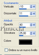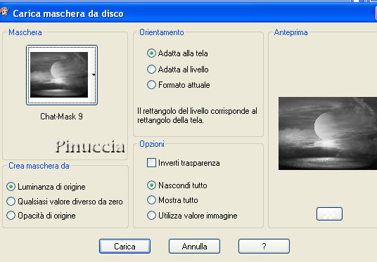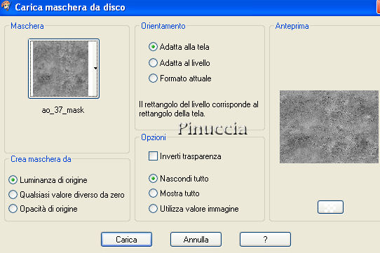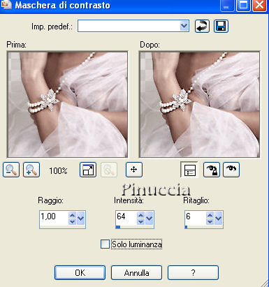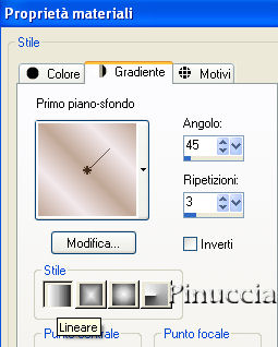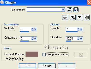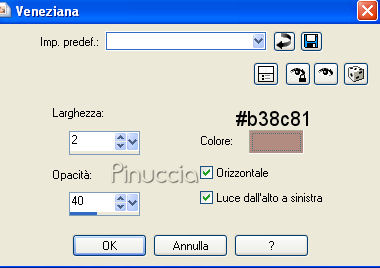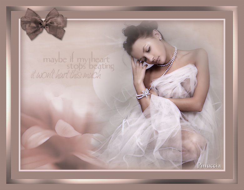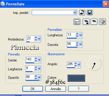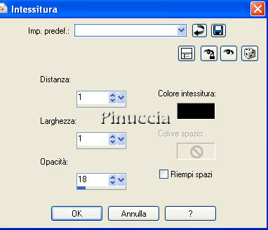Occorrente:Se l'argomento che ti interessa non è presente, ti prego di segnalarmelo. Questo tutorial è stato scritto con PSP 9, ma può essere eseguito anche con le altre versioni di PSP. Materiale qui Per questo tutorial ho usato tubes di Christine e Marif. Per favore, rispetta il lavoro degli autori e mantieni i tubes al loro stato originale. Metti il pennello nella cartella Pennelli. Se hai problemi con i pennelli vedi qui Metti le maschere nella cartella Maschere. Filtro: Xero qui Graphics Plus qui Penta.com - VTR2 qui 1. Apri una nuova immagine trasparente 650 x 480 pixels. Imposta il colore di primo piano con #c1a796, e il colore di sfondo con #f2e9ec. Passa il colore di primo piano a Gradiente di primo piano/sfondo, con i seguenti settaggi: ![]() Riempi l'immagine trasparente con il gradiente.Regola>Sfocatura>sfocatura gaussiana, raggio 30. ![]() 2. Effetti>effetti tecniche di disegno>Pennellate: ![]() 3. Livelli>Nuovo livello raster. Riempi con il colore scuro di primo piano.Livelli>Carica/Salva maschera>Carica maschera da disco. Cerca e carica la maschera "ao_37_mask": ![]() Livelli>Unisci>Unisci gruppo. 4. Livelli>Nuovo livello raster. Riempi con il colore chiaro di sfondo.ricorda che per riempire con il colore di sfondo, devi cliccare con il tasto destro del mouse. Livelli>Carica/Salva maschera>Carica maschera da disco. Cerca e carica la maschera "Chat-Mask 9": ![]() Livelli>Unisci>Unisci gruppo. 5. Apri il tube "chrismist_141FLOWER_5", e vai a Modifica>Copia. Torna al tuo lavoro e vai a Modifica>Incolla>Incolla come nuovo livello. Sposta il tube nell'angolo in basso a sinistra.Regola>Saturazione e tonalità>Tonalità/Saturazione/Luminosità: ![]() Abbassa l'opacità di questo livello al 66%. 6. Apri il tube "Marif_2007_11Novembre_misted_lady0142", e vai a Modifica>Copia. Torna al tuo lavoro e vai a Modifica>Incolla come nuovo livello. Sposta il tube a destra.Regola>Messa a fuoco>Maschera di contrasto: ![]() Effetti>Effetti 3D>Sfalsa ombra: ![]() Livelli>Unisci>Unisci tutto. 7. Effetti>Plugins>Xero - Porcelain: ![]() 8. Selezione>Seleziona tutto. Effetti>Effetti 3D>Ritaglio, con i seguenti settaggi, con il colore #876865: ![]() Ripeti l'Effetto Ritaglio, ma cambiando verticale e orizzontale a -5. 9. Livelli>Nuovo livello raster. Imposta il colore di primo piano con #b1978f. Attiva lo strumento Pennello ![]() Cerca e seleziona il pennello "RTBrush_Paramore_LetThisGo1", e applicalo cliccando con il tasto sinistro del mouse per usare il colore di primo piano. 10. Immagine>Aggiungi bordatura, 5 pixels, simmetriche, con il colore bianco. Seleziona il bordo con la bacchetta magica ![]() ![]() Riempi la selezione con il colore #f2e9ec.ricorda che questo colore è impostato come colore di sfondo; quindi, per riempire, devi cliccare con il tasto destro del mouse Effetti>Effetti di trama>Veneziana, con i seguenti settaggi, colore #b38c81: ![]() Selezione>Nessuna selezione. 11. Immagine>Aggiungi bordatura, 60 pixels, simmetriche, con il colore #aa8f88. Seleziona il bordo con la bacchetta magica ![]() ![]() Effetti>Effetti di trama>Intessitura: ![]() 12. Selezione>Seleziona tutto. Selezione>modifica>Contrai di 20 pixels. Livelli>Nuovo livello raster. Riempi con il colore #aa8f88.Selezione>modifica>Contrai, di 15 pixels. Premi sulla tastiera il tasto canc ![]() Selezione>Nessuna selezione. Effetti>Plugins>Graphics Plus - Cross Shadow, con i settaggi standard. ![]() Effetti>Plugins>Penta.com - VTR2, con i settaggi standard. ![]() 13. Effetti>Effetti 3D>Smusso a incasso: ![]() 14. Apri il tube "fabbows__27_", e vai a Modifica>copia. Torna al tuo lavoro e vai a Modifica>Incolla>Incolla come nuovo livello. Immagine>Ridimensiona, al 50%, tutti i livelli non selezionato. Regola>Saturazione e tonalità>Tonalità/Saturazione/Luminosità: ![]() 15. Effetti>Effetti 3D>Sfalsa ombra: ![]() 16. Aggiungi il tuo nome e/o il tuo watermark e salva in formato jpg. ![]() Se hai problemi o dubbi, o trovi un link non funzionante, o anche soltanto per un saluto, scrivimi. 18 Novembre 2007 |