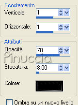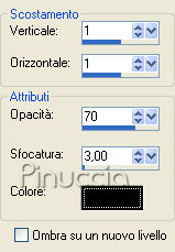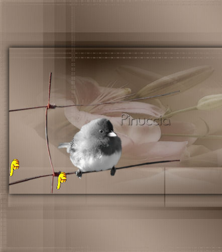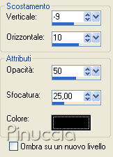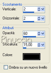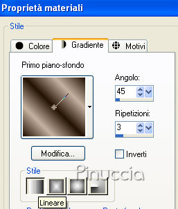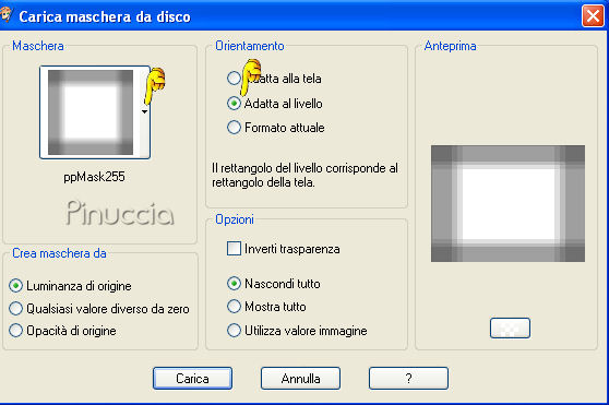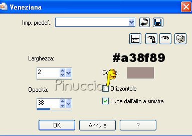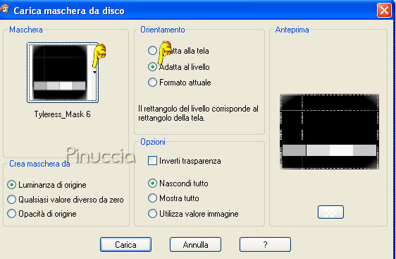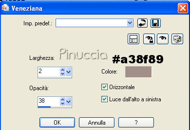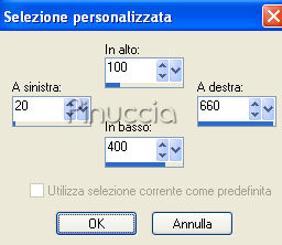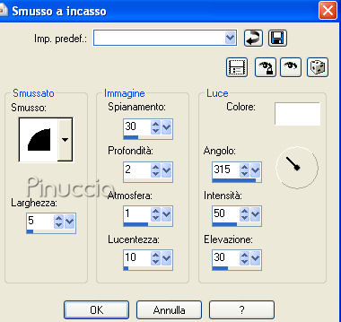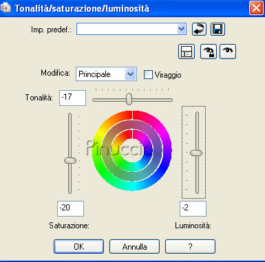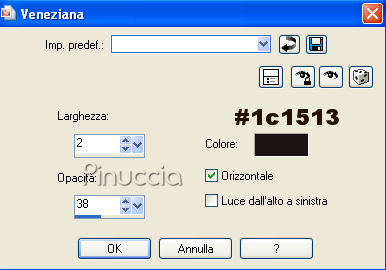qui puoi trovare qualche risposta ai tuoi dubbi. Se l'argomento che ti interessa non è presente, ti prego di segnalarmelo. Questo tutorial è stato scritto con PSP 9, ma può essere eseguito anche con le altre versioni di PSP. Occorrente: Materiale qui Per questo tutorial ho usato tubes di Christine e Marif. Per favore, rispetta il lavoro degli autori e mantieni i tubes al loro stato originale. Metti la maschera nella cartella maschere. Apri il font e minimizzalo nella tua area di lavoro. Lo troverai nella lista dei font disponibili, quando ti servirà. Filtri: Simple qui Penta.com - VTR2 qui 1. Apri una nuova immagine trasparente 680 x 520 pixels. Imposta il colore di primo piano con #231203, e il colore di sfondo con #c6b1a0. 2. Passa il colore di primo piano a gradiente di primo piano/sfondo, con i seguenti settaggi. ![]() 3. Riempi l'immagine con il colore chiaro di sfondo.ricorda che per riempire con il colore di sfondo devi cliccare con il tasto destro del mouse Livelli>Nuovo livello raster. Riempi con il gradiente.Regola>Sfocatura>Sfocatura gaussiana, raggio 30. ![]() 4. Livelli>Carica/Salva maschera>Carica maschera da disco: cerca e carica la maschera "ppMask255": ![]() 5. Livelli>Unisci>Unisci gruppo. 6. Effetti>Effetti di trama>Veneziana: ![]() 7. Livelli>Nuovo livello raster. Riempi con il colore chiaro di sfondo.Livelli>Carica/Salva maschera>Carica maschera da disco: cerca e carica la maschera "Tyleress_Mask 6": ![]() 8. Livelli>Unisci>Unisci gruppo. 9. Effetti>Effetti 3D>Smusso a incasso: ![]() 10. Effetti>Effetti di trama>Veneziana, con i settaggi usati al passo 6. Abbassa l'opacità di questo livello al 60%. 11. Livelli>Nuovo livello raster. Attiva lo strumento Selezione , rettangolo,poi clicca su Selezione personalizzata ![]() e imposta i seguenti settaggi: ![]() 12. Apri il tube "Chrismist_flws_100", e vai a Modifica>Copia. non chiuderlo, perchè ti servirà ancora. Torna al tuo lavoro e vai a Modifica>Incolla>Incolla nella selezione. 13. Attiva nuovamente il tube. Immagine>Rifletti. Modifica>Copia. Torna al tuo lavoro e vai a Modifica>Incolla>Incolla nella selezione. Abbassa l'opacità di questo livello al 68%. Mantieni selezionato. Livelli>nuovo livello raster. Effetti>Effetti 3D>Sfalsa ombra, con i seguenti settaggi, colore nero. ![]() Ripeti l'Effetto Sfalsa ombra, ma cambiando verticale e orizzontale a -2. ![]() 14. Selezione>Nessuna selezione. 15. Apri il tube "Marif_2007_09Septembre_animal0256", e vai a Modifica>Copia. Torna al tuo lavoro e vai a Modifica>Incolla>Incolla come nuovo livello. Immagine>Ridimensiona, al 60%, tutti i livelli non selezionato. Regola>Tonalità e Saturazione>Tonalità/Saturazione/Luminosità: ![]() Sposta il tube a sinistra,in modo che il bordo del filo si appoggi contro il bordo del quadrato: ![]() Effetti>Effetti 3D>Sfalsa ombra, con i seguenti settaggi, colore nero: ![]() 16. Apri il tube "Brad", e vai a Modifica>Copia. Torna al tuo lavoro e vai a Modifica>Incolla>Incolla come nuovo livello. Sposta questo tube in alto a sinistra, nel riquadro.Effetti>Effetti 3D>Sfalsa ombra, con i seguenti settaggi. ![]() Ripeti l'Effetto Sfalsa ombra, ma cambiando verticale e orizzontale a -1. 17. Effetti>Plugins>Simple>Top Left Mirror. 18. Imposta il colore di sfondo con #d5c2b2. Attiva lo strumento Testo , e scegli un bel font.Per il mio testo ho usato "CecilyNV" (nello zip), dimensione 60, pennellata 0, crea come vettore. se stai usando PSP X dovrai regolare il settaggio della dimensione, a causa delle differenze tra le due versioni. Su questo argomento, vedi alcuni appunti qui Scrivi il testo e posizionalo. Livelli>Converti in livello raster. Effetti>Effetti 3D>Sfalsa ombra: ![]() 19. Livelli>Unisci>Unisci tutto. Immagine>Aggiungi bordatura, 3 pixels, simmetriche, con il colore #231203. Seleziona il bordo con la bacchetta magica ![]() ![]() Effetti>Plugins>Penta.com - VTR2, con i settaggi standard: ![]() 20. Immagine>Aggiungi bordatura, 40 pixels, simmetriche, con il colore #241c16. Seleziona il bordo con la bacchetta magica ![]() Effetti>Effetti di trama>Veneziana: ![]() Ripeti l'Effetto Veneziana, ma togliendo la spunta a Orizzontale: ![]() 21. Apri il tube "chulinda_d(-_-)b_mr_lemon_tree", e vai a Modifica>Copia. Torna al tuo lavoro e vai a Modifica>Incolla>Incolla come nuovo livello. Sposta il tube a destra.Regola>Messa a fuoco>Maschera di contrasto: ![]() Effetti>Effetti 3D>sfalsa ombra: ![]() 22. Livelli>Unisci>Unisci tutto. Immagine>Aggiungi bordatura, 1 pixel, simmetriche, con il colore nero. Salva in formato jpg. ![]() Se hai problemi o dubbi, o trovi un link non funzionante, o anche soltanto per un saluto, scrivimi. 16 Ottobre 2007 |