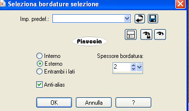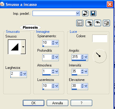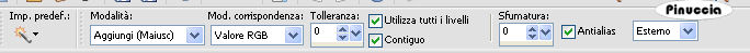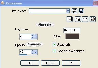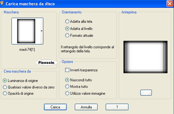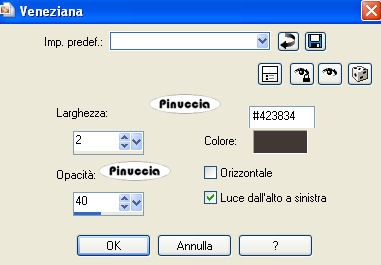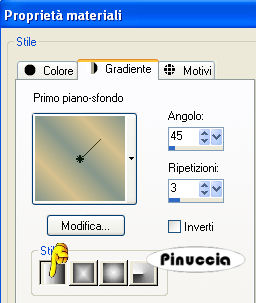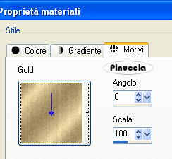 qui puoi trovare qualche risposta ai tuoi dubbi. Se l'argomento che ti interessa non è presente, ti prego di segnalarmelo. Questo tutorial è stato scritto con PSP 9, ma può essere eseguito anche con le altre versioni di PSP. Occorrente: Materiale qui Per questo tutorial ho usato tubes di Sandi, Marif, Jeanette Bollinger e Jet. Per favore, rispetta il lavoro degli autori e mantieni i tubes al loro stato originale. Metti la maschera 74(1) nella cartella Maschere. Apri il motivo "Gold" in PSP. Lo troverai nella lista dei motivi disponibili, quando ti servirà. Importa il pennello "Spring" in PSP (come fare vedi qui) Filtri: Alien Skin Eye Candy 5 - Impact qui 1. Apri una nuova immagine trasparente 700 x 520 pixels. Imposta il colore di primo piano con #85978b, e il colore di sfondo con #d7c18e. Passa il colore di primo piano a Gradiente di primo piano/sfondo, con i seguenti settaggi: ![]() Riempi l'immagine trasparente con il gradiente.2. Livelli>Nuovo livello raster. Riempi questo livello con il colore di sfondo.3. Livelli>Carica/Salva maschera>Carica maschera da disco. Cerca e carica la maschera 74(1): ![]() 4. Livelli>Unisci>Unisci gruppo. Effetti>Effetti di bordo>Aumenta. Clicca al centro dell'immagine con la Bacchetta magica così impostata:![]() 5. Apri il tube "SandiK037", e vai a Modifica>Copia. Torna al tuo lavoro e vai a Modifica>Incolla>Incolla nella selezione. Cambia la modalità di miscelatura di questo livello in Luminanza (Esistente), e abbassa l'opacità al 44%. 6. Mantieni selezionato. Livelli>Nuovo livello raster. Selezione>Modifica>Seleziona bordature selezione: ![]() Passa il colore di primo piano a Motivi, e seleziona il motivo "Gold". ![]() Riempi la selezione con questo motivo.7. Effetti>Effetti 3D>Smusso a incasso. ![]() Selezione>Nessuna selezione. 8. Apri il tube "marif_2006_septembre_misted_paysage14". Immagine>Rifletti. Modifica>Copia. Torna al tuo lavoro e vai a Modifica>Incolla come nuovo livello. Nella paletta dei livelli trascina questo livello sotto il livello Raster 2. Sposta l'immagine nell'angolo in basso a destra.Cambia la modalità di miscelatura di questo livello in Luminanza (esistente), e abbassa l'opacità al 52%. ![]() 9. Imposta il colore di primo piano con #29241f. Attiva il livello superiore. Livelli>Nuovo livello raster. Attiva lo strumento Pennello ![]() cerca e seleziona il pennello "Spring", e applicalo sull'immagine in basso a destra. 10. Apri il tube "Jeanette Bollinger_PeachBlossom", e vai a Modifica>Copia. Torna al tuo lavoro e vai a Modifica>Incolla come nuovo livello. Sposta nell'angolo in alto a destra,in modo che rimanga soltanto l'ultima parte del fiore. ![]() Effetti>Effetti 3D>Sfalsa ombra, con i seguenti settaggi: ![]() 11. Livelli>Unisci>Unisci tutto. 12. Immagine>Aggiungi bordatura, 3 pixels, simmetriche, con il colore bianco. Seleziona questo bordo con la bacchetta magica , sfumatura e tolleranza 0,![]() Riempi il bordo con il motivo oro.Effetti>Effetti 3D>Smusso a incasso, con i settaggi precedenti. ![]() 13. Immagine>Aggiungi bordatura, 60 pixels, simmetriche, con il colore #85978b. Seleziona il bordo con la bacchetta magica , tolleranza e sfumatura 0.Effetti>Effetti di trama>Veneziana: ![]() Ripeti l'effetto Veneziana, ma togliendo la spunta a Orizzontale. ![]() 14. Effetti>Plugins>Alien Skin Eye Candy 5>Impact - Glass: con i seguenti settaggi: ![]() 15. Selezione>Nessuna selezione. 16. Apri il tube "jet-woman13april-2008", e vai a Modifica>Copia. Torna al tuo lavoro e vai a Modifica>Incolla come nuovo livello. Sposta il tube a sinistra.Regola>Metti a fuoco>Maschera di contrasto: ![]() Effetti>effetti 3D>Sfalsa ombra: ![]() 17. Aggiungi il tuo nome e/o il tuo watermark. 18. Livelli>Unisci>Unisci tutto e salva in formato jpg. ![]() Se hai problemi o dubbi, o trovi un link non funzionante, o anche soltanto per un saluto, scrivimi. 5 Giugno 2008 |