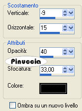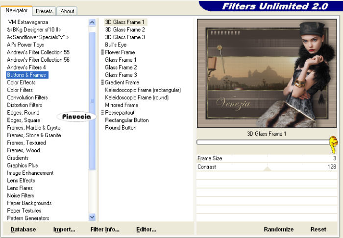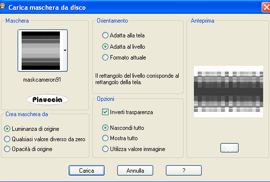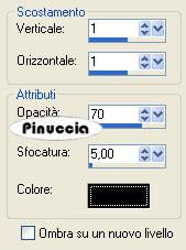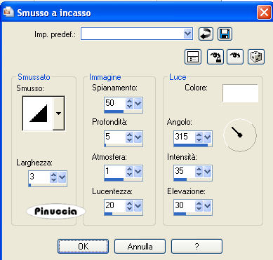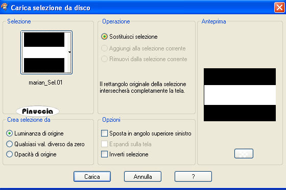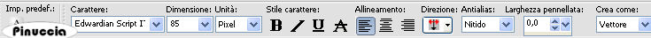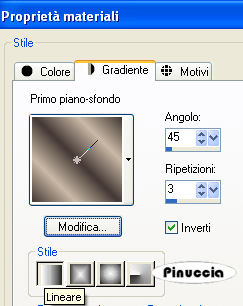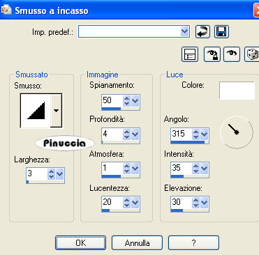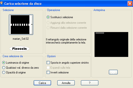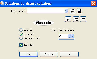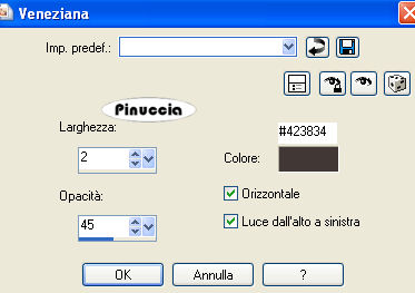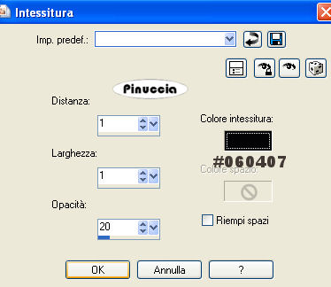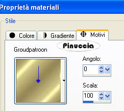 qui puoi trovare qualche risposta ai tuoi dubbi. Se l'argomento che ti interessa non è presente, ti prego di segnalarmelo. Questo tutorial è stato scritto con PSP 9, ma può essere eseguito anche con le altre versioni di PSP. Occorrente: Materiale qui Per questo tutorial ho usato tubes di Marastina e Jet. Per favore, rispetta il lavoro degli autori e mantieni i tubes al loro stato originale. Filtri: Filters Unlimited qui Graphics Plus qui Penta.com - Color Dot qui Metti la maschera nella cartella Maschere. Metti le selezioni nella cartella Selezioni. Metti il motivo nella cartella Motivi. Se lo apri e minimizzi nella tua area di lavoro lo troverai nella lista dei motivi disponibili quando ti servirà. Apri il font e minimizzalo. Lo troverai nella lista dei font disponibili, quando ti servirà. 1. Apri una nuova immagine trasparente 700 x 520 pixels. Imposta il colore di primo piano con #c9b9a6, e il colore di sfondo con #423834. Passa il colore di primo piano a Gradiente di primo piano/sfondo, con i seguenti settaggi. ![]() Riempi l'immagine trasparente con il gradiente.Regola>Sfocatura>Sfocatura gaussiana, raggio 30. ![]() 2. Livelli>Nuovo livello raster. Riempi con il colore di sfondo.3. Livelli>Carica/Salva maschera>Carica maschera da disco. Cerca e carica la maschera "maskcameron91": ![]() 4. Livelli>Unisci>Unisci gruppo. 5. Selezione>Carica/Salva selezione>Carica selezione da disco. Cerca e carica la selezione "selectie marian_Sel.01". ![]() Livelli>Nuovo livello raster. 6. Apri il tube "DSCN40543", e vai a Modifica>Copia. Torna al tuo lavoro e vai a Modifica>Incolla nella selezione. Abbassa l'opacità di questo livello al 72%. 7. Effetti>Effetti di trama>Intessitura, colore 060407: ![]() 8. Selezione>Modifica>Seleziona bordature selezione: ![]() 9. Livelli>Nuovo livello raster. Passa il colore di primo piano a Motivi, cerca e seleziona il motivo Goudpatroon: ![]() Riempi con il motivo oro.10. Selezione>Nessuna selezione. 11. Effetti>Effetti 3D>Sfalsa ombra: ![]() Ripeti l'Effetto Sfalsa ombra, ma cambiando verticale e orizzontale con -1. 12. Apri il tube "CanDesigns_Jeanette stickpin", e vai a Modifica>Copia. Torna al tuo lavoro e vai a Modifica>Incolla come nuovo livello. Sposta il tube a sinistra, come nel mio esempio.Regola>Messa a fuoco>Maschera di contrasto. ![]() Effetti>Effetti 3D>Sfalsa ombra: ![]() 13. Livelli>Nuovo livello raster. Selezione>Carica/Salva selezione>Carica selezione da disco. Cerca e carica la selezione marian_Sel.02: ![]() Riempi la selezione con il colore di primo piano #c9b9a6.Effetti>Effetti 3D>Smusso a incasso. ![]() Selezione>Nessuna selezione. 14. Imposta il colore di sfondo con #ccbd99. Attiva lo strumento Testo , font Edwardian Script,dimensione 72, pennellata 0, e scrivi il testo. ![]() la dimensione nella schermata si riferisce pressappoco ai corrispondenti pixels di PSP X, che ho usato per eseguire la traduzione. Livelli>Converti in livello raster. Effetti>Effetti 3D>Sfalsa ombra: ![]() 15. Livelli>Unisci>Unisci tutto. Immagine>Aggiungi bordatura, 3 pixels, simmetriche, con il colore bianco. Seleziona questo bordo con la bacchetta magica ![]() ![]() Riempi la selezione con il motivo oro.Selezione>Nessuna selezione. 16. Immagine>Aggiungi bordatura, 10 pixels, simmetriche, con il colore #423834, Seleziona il bordo con la bacchetta magica ![]() ![]() Effetti>Plugins>Graphics Plus - Cross Shadow, con i settaggi standard. ![]() Effetti>Plugins>Penta.com - Color Dot, con i settaggi standard. ![]() Effetti>Effetti 3D>sfalsa ombra: ![]() Ripeti l'Effetto Sfalsa ombra, ma cambiando verticale e orizzontale con -1. Selezione>Nessuna selezione. 17. Immagine>Aggiungi bordatura, 50 pixels, simmetriche, con il colore #c9b9a6. Seleziona questo bordo con la bacchetta magica ![]() ![]() Effetti>Effetti di trama>Veneziana: ![]() Selezione>Nessuna selezione. 18. Selezione>Seleziona tutto. Selezione>Modifica>Contrai - 5 pixels. Selezione>Inverti. Effetti>Effetti 3D>Smusso a incasso: ![]() Selezione>Nessuna selezione. 19. Apri il tube "jet-woman1-december-2007", e vai a Modifica>Copia. Torna al tuo lavoro e vai a Modifica>Incolla>Incolla come nuovo livello. Sposta il tube a destra.Regola>Messa a fuoco>Maschera di contrasto: ![]() Effetti>Effetti 3D>Sfalsa ombra: ![]() 20. Livelli>Unisci>Unisci tutto. 21. Effetti>Plugins>Filters Unlimited 2.0 - Buttons & Frames - 3D Glass Frame 1: ![]() 22. Firma il tuo lavoro e salva in formato jpg. ![]() Se hai problemi o dubbi, o trovi un link non funzionante, o anche soltanto per un saluto, scrivimi. 28 Aprile 2008 |