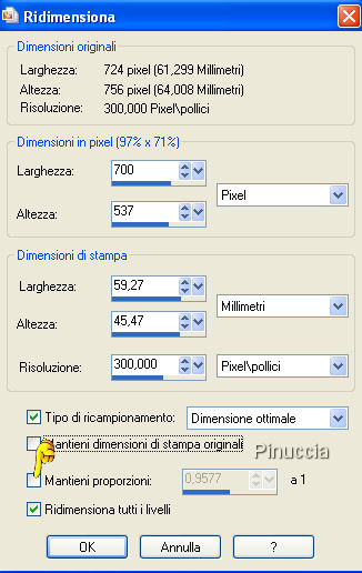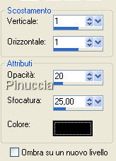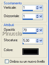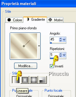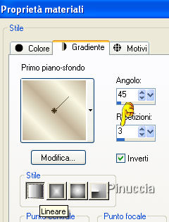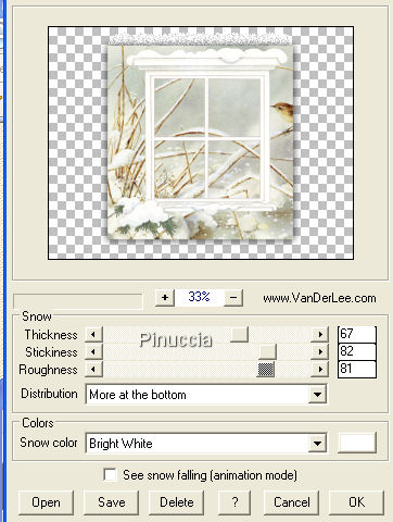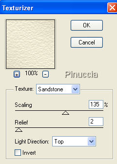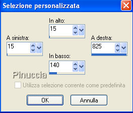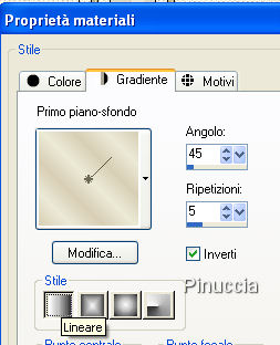 qui puoi trovare qualche risposta ai tuoi dubbi. Se l'argomento che ti interessa non è presente, ti prego di segnalarmelo. Questo tutorial è stato scritto con PSP 9, ma può essere eseguito anche con le altre versioni di PSP. Occorrente: Materiale qui Per questo tutorial ho usato tubes di MarjoleinBastin, Suzi Sgai e Dyveke, e due scraptubes. Per favore, rispetta il lavoro degli autori e mantieni i tubes al loro stato originale. Importa il pennello in PSP. Come fare vedi qui Filtri: VanderLee - Snowscape (nello zip) vedi gli appunti su questo filtro qui Penta.com - VTR2 qui 1. Attiva il tube "tw_xmasWframePlain_RM[1]". Immagine>Ridimensiona, a 700 x 537 pixels, tutti i livelli selezionato, mantieni proporzioni non selezionato. ![]() 2. Attiva l'immagine "12-ImpressionsOfNature-Dec2005-MarjoleinBastin_m^e", e vai a Modifica>Copia. Torna all'immagine ridimensionata e vai a Modifica>Incolla>Incolla come nuovo livello. Livelli>Disponi>Sposta giù. Livelli>Unisci>Unisci tutto. Metti da parte questa immagine per il momento. 3. Apri una nuova immagine trasparente 840 x 640 pixels. Imposta il colore di primo piano con #f8f7e3, e il colore di sfondo con #c1b297. Passa il colore di primo piano a Gradiente di primo piano/sfondo: ![]() Riempi l'immagine trasparente con il gradiente.Regola>Sfocatura>Sfocatura gaussiana, raggio 50. ![]() 4. Effetti>Plugins>Texture - Texturizer, con i seguenti settaggi: ![]() 5. Attiva l'immagine che hai messo da parte prima e vai a Modifica>Copia. Torna al tuo lavoro e vai a Modifica>Incolla>Incolla come nuovo livello. Effetti>Effetti 3D>sfalsa ombra: ![]() Ripeti l'Effetto Sfalsa ombra, ma cambiando verticale e orizzontale a -1. 6. Effetti>Plugins>VDL - Adrenaline - Snowscape, con i seguenti settaggi. ![]() Attiva il livello inferiore. Selezione>Seleziona tutto. Selezione>modifica>Contrai di 10 pixels. Selezione>Inverti. Effetti>Effetti 3D>Smusso a incasso: ![]() 7. Attiva lo strumento Selezione , rettangolo,clicca sull'icona Selezione personalizzata ![]() e imposta i seguenti settaggi: ![]() Livelli>Nuovo livello raster. 8. Cambia i settaggi del gradiente, portando le ripetizioni a 3. ![]() Riempi la selezione con il gradiente.Effetti>Plugins>Penta.com - VTR2, con i settaggi standard. ![]() Selezione>Nessuna selezione. Effetti>Effetti 3D>Sfalsa ombra: ![]() 9. Livelli>Duplica. Immagine>Capovolgi. 10. Attiva il livello superiore. Attiva il tube "Wrap" e vai a Modifica>Copia. Torna al tuo lavoro e vai a Modifica>Incolla>Incolla come nuovo livello. Sposta questo tube sul bordo inferiore del riquadro centrale.Effetti>Effetti 3D>Sfalsa ombra: ![]() Ripeti l'Effetto Sfalsa ombra, ma cambiando verticale e orizzontale a -1. 11. Attiva il tube "SS_1517_tube". Immagine>Rifletti. Modifica>Copia. Torna al tuo lavoro e vai a Modifica>Incolla>Incolla come nuovo livello. Immagine>Ridimensiona, all'85%, tutti i livelli non selezionato. Sposta questo tube a sinistra.Effetti>Effetti 3D>Sfalsa ombra: ![]() 12. Imposta il colore di primo piano con #ebead6, e il colore di sfondo con #d8ceb5. Passa il colore di primo piano a Gradiente di primo piano/sfondo: ![]() 13. Livelli>Nuovo livello raster. Attiva lo strumento Pennello ![]() cerca e seleziona il pennello "Winter_Wonderland". Applicalo in basso cliccando con il tasto sinistro del mouse per usare il gradiente impostato come colore di primo piano. Effetti>Effetti 3D>sfalsa ombra: ![]() 14. Aggiungi il tuo nome e/o il tuo watermark. Livelli>Unisci>Unisci tutto, e salva in formato jpg. ![]() ![]() Se hai problemi o dubbi, o trovi un link non funzionante, o anche soltanto per un saluto, scrivimi. 8 Dicembre 2007 |
