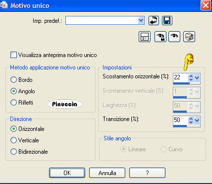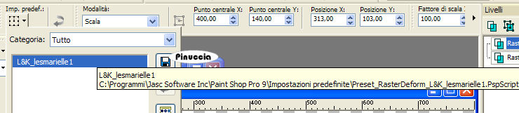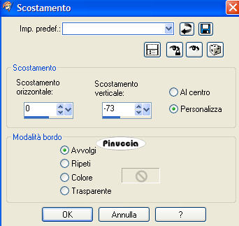 qui puoi trovare qualche risposta ai tuoi dubbi. Se l'argomento che ti interessa non è presente, ti prego di segnalarmelo. Questo tutorial è stato scritto con i settaggi standard di PSP 8. Per tradurlo, l'ho eseguito con PSP 9. alcune schermate di esempio sono realizzate con PSP X, per avere una migliore visualizzazione dei livelli Occorrente: Immagine qui. Tube perle: scegline una con un colore che si adatti alla tua immagine: qui Per comodità, ho scelto queste perle per il tutorial": qui Preset per lo strumento Deformazione: deform _L&K_les marielle qui Mettilo nella cartella Impostazioni predefinite di PSP. Script per il top border scorrevole (con un ringraziamento all'autore): qui Filtro Eye Candy 3.1 qui Preparazione: Questo tutorial è stato creato per realizzare un bordo superiore scorrevole. Per vedere il risultato, clicca sull'esempio finale Apri l'immagine fornita con il tutorial e duplicala con shift+D tre volte. Metti da parte due copie e comincia a lavorare con la terza. Se vuoi una tua immagine, scegline una orizzontale. Immagine 1 (la cornice): 1. Ridimensiona la tua immagine orizzontale. Immagine>Ridimensiona, a 180 pixels di altezza, tutti i livelli selezionato. ![]() 2. Modifica>Copia. 3. Immagine>Aggiungi bordatura, 1 pixel, simmetriche, con un colore scuro preso dall'immagine. ![]() passando il mouse sull'immagine, appare l'icona del contagocce, quando trovi il colore che ti piace, è sufficiente cliccare in quel punto per averlo impostato come colore del bordo. 4. Immagine>Aggiungi bordatura, 10 pixels, simmetriche, con il colore bianco. ![]() cliccando con il tasto destro del mouse sulla paletta del colore, puoi selezionare più velocemente il colore bianco. 5. Seleziona il bordo bianco con la bacchetta magica ![]() 6. Livelli>Nuovo livello raster. 7. Modifica>Incolla>Incolla nella selezione. 8. Regola>Sfocatura>Sfocatura gaussiana, raggio 40. ![]() ![]() 9. Nella paletta dei livelli abbassa l'opacità di questo livello al 40%. (Se stai usando un altro tube, regolati - a seconda dei colori del tube - tra 40 e 70). ![]() 10. prendi nota di questo valore, che dovrai ripetere per la seconda immagine 11. Immagine>Aggiungi bordatura, 1 pixel, simmetriche, con il colore scuro. 12. Selezione>Nessuna selezione. Metti da parte l'immagine per il momento. Immagine 2 (la scatola). 13. Attiva una delle due copie che hai messo da parte all'inizio del tutorial. 14. Attiva lo strumento Ritaglio ![]() e ritaglia un pezzo orizzontale dall'immagine, come mostrato nell'esempio: ![]() Clicca sul segno di spunta per applicare il ritaglio selezionato.15. Immagine>Ridimensiona, a 150 x 50, mantieni proporzioni non selezionato. ![]() **adesso dovrai ripetere le operazioni fatte con la prima immagine** 16. Modifica>Copia. 17. Immagine>Aggiungi bordatura, 1 pixel, simmetriche, con il colore scuro scelto dall'immagine. 18. Immagine>Aggiungi bordatura, 10 pixels, simmetriche, con il colore bianco. 19. Seleziona il bordo con la bacchetta magica ![]() 20. Livelli>Nuovo livello raster. 21. Modifica>Incolla>Incolla nella selezione. 22. Effetti>Sfocatura>Sfocatura gaussiana, raggio 40. 23. Abbassa l'opacità del livello al 40% (oppure al valore impostato per la prima immagine, se hai usato un altro tube). 24. Immagine>Aggiungi bordatura, 1 pixel, simmetriche, con il colore scuro. 25. Selezione>Nessuna selezione. Controlla che le misure siano corrette. Dovrebbero essere queste: ![]() 26. Modifica>Copia. 27. Apri una nuova immagine trasparente 800 x 280 pixels. 28. Fai attenzione. Da questo momento non devi assolutamente spostare le immagini. Usa i tasti di PSP. Saranno loro a lavorare. 29. Modifica>Incolla>Incolla come nuovo livello. 30. Nella paletta dei livelli abbassa l'opacità al 36%. ![]() 31. Livelli>Duplica. 32. Abbassa l'opacità di questo livello all'80%. ![]() 33. Attiva lo strumento Deformazione ![]() Se hai seguito le istruzioni iniziali e hai messo il preset fornito con il tutorial nella cartella delle impostazioni predefinite, troverai nella lista delle impostazioni il preset L&K_lesmarielle1: ![]() 34. Seleziona il preset e clicca ok. 35. Livelli>Duplica. 36. Nella paletta dei livelli abbassa l'opacità di questo livello al 28%. ![]() 37. Effetti>Effetti di immagine>Scostamento, con i seguenti settaggi: ![]() 38. Modifica>Incolla>Incolla come nuovo livello (hai ancora l'immagine in memoria). 39. Effetti>Effetti di immagine>Scostamento, con i seguenti settaggi: ![]() 40. Livelli>Unisci>Unisci visibile. 41. Effetti>Plugins>Eye Candy 3.1 - Perspective Shadow, con i seguenti settaggi: ![]() 42. Livelli>Duplica. 43. Adesso hai due scatole. Posizionale come mostrato nella schermata:![]() 44. Attiva l'immagine 1, che hai messo da parte al punto 12. 45. Modifica>Copia. 46. Ritorna all'immagine più grande (800x280) 47. Vai a Modifica>Incolla>Incolla come nuovo livello. 48. Posiziona l'immagine adeguatamente.![]() 49. Effetti>Plugins>Eye Candy 3.1 - Perspective Shadow, con i seguenti settaggi: ![]() 50. Controlla che tutto si trovi al posto giusto. Quando sei soddisfatto vai a Livelli>Unisci>Unisci visibile. 51. Livelli>Nuovo livello raster. 52. Riempi con il colore bianco.53. Livelli>Nuovo livello raster. 54. Selezione>Seleziona tutto. 55. Attiva la terza copia dell'immagine che hai duplicato all'inizio del tutorial. 56. Modifica>Copia. 57. Torna al lavoro 800x280 pixels. 58. Modifica>Incolla>Incolla nella selezione. 59. Selezione>Nessuna selezione. 60. Effetti>Effetti di immagine>Motivo unico, con i seguenti settaggi: ![]() se stai usando immagini diversi, dovrai scegliere da solo quale valore di scostamento orizzontale si adatta meglio alla tua. 61. Nella paletta dei livelli abbassa l'opacità al 30%. per immagini diverse, dovrai regolarti a seconda di quella che hai scelto. ![]() 62. Livelli>Unisci>Unisci giù. 63. Livelli>Disponi>Sposta giù. 64. Modifica>Copia. 65. Rimani su questo livello. ![]() 66. Attiva lo strumento Ornamento, e cerca le perle (parel, parel 1 e parel 2). Scegli le