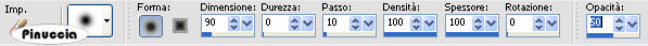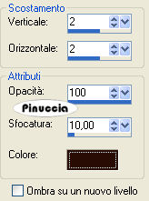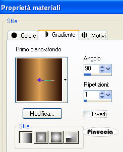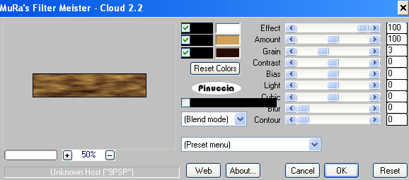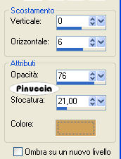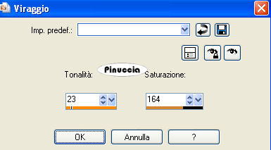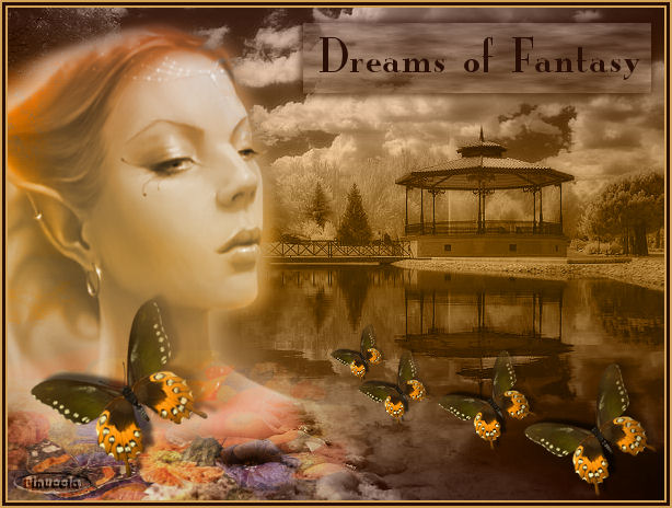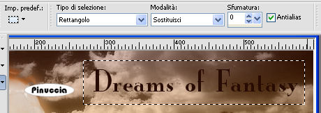 qui puoi trovare qualche risposta ai tuoi dubbi. Se l'argomento che ti interessa non è presente, ti prego di segnalarmelo. Questo tutorial è stato scritto con PSP 8.1, ma può essere eseguito anche con le altre versioni di PSP. Per tradurlo, ho usato PSP X. Occorrente: Materiale qui Attenzione, i livelli dei tubes sono chiusi. 1. Apri una nuova immagine trasparente 600 x 450 pixels. 2. Imposta il colore di primo piano con #290E05 e il colore di sfondo con #D0A156. Passa il colore di primo piano a Gradiente di primo piano/sfondo, con i seguenti settaggi: ![]() Regola>Sfocatura>Sfocatura gaussiana, raggio 20. ![]() 3. Livelli>Nuovo livello raster. Selezione>Seleziona tutto. Apri l'immagine Dreams_Of_Fantasy e vai a Modifica>Copia. Torna al tuo lavoro e vai a Modifica>Incolla nella selezione. Cambia la modalità di miscelatura di questo livello in Luminanza (Esistente), e abbassa l'opacità all'80%. 4. Apri il tube flowers-blend18, e vai a Modifica>Copia. Torna al tuo lavoro e vai a Modifica>Incolla come nuovo livello. Sposta il tube in basso a sinistra.Cambia la modalità di miscelatura di questo livello in Sovrapponi, e abbassa l'opacità al 70%. 5. Apri il tube Yoka-SemiMistedfairy180806-small, e vai a Modifica>Copia. Torna al tuo lavoro e vai a Modifica>Incolla come nuovo livello. Sposta il tube a sinistra.Attiva lo strumento Deformazione ![]() puntatore se stai usando PSP X,e "tira" il tube in basso, vedi l'esempio finale. Regola>Tonalità e saturazione>Viraggio, con i seguenti settaggi: ![]() Effetti>Effetti 3D>Sfalsa ombra, con i seguenti settaggi, colore #D0A156. ![]() Cambia la modalità di miscelatura di questo livello in Luminanza, e abbassa l'opacità al 90%. 6. Apri il tube butterfly-blend18, e vai a Modifica>copia. Torna al tuo lavoro e vai a Modifica>Incolla come nuovo livello. Spostalo sul collo della donna, vedi l'esempio finale.7. Livelli>Duplica. Immagine>Ridimensiona, al 75%, tutti i livelli non selezionato. Posiziona la farfalla come preferisci.Di nuovo Immagine>Ridimensiona, al 75%, e posiziona ![]() Ancora una volta Livelli>Duplica, Immagine>Ridimensiona, al 75%, e posiziona. L'ultima volta. Livelli>Duplica, Immagine>Ridimensiona, al 75%, e posiziona. 8. Attiva il livello Raster 2 (il livello dell'immagine di sfondo). Attiva lo strumento Gomma , dimensione 90, durezza 0, opacità 50.![]() e cancella i segni del paesaggio dal tube della donna. Livelli>Unisci>Unisci visibile. 9. Livelli>Nuovo livello raster. Chiudi il colore di primo piano, e imposta il colore di sfondo con #290E05. Attiva lo strumento Testo , font New Yorker,dimensione 30, crea come vettore, e scrivi Dreams Of Fantasy. Posiziona il testo in alto, come nel mio esempio. Livelli>Converti in livello raster. 10. Attiva lo strumento Selezione , rettangolo,Sostituisci, sfumatura 0, e traccia una selezione intorno al testo. ![]() 11. Livelli>nuovo livello raster. Livelli>Disponi>Sposta giù. Riempi la selezione con il colore #D0A156.Mantieni selezionato. 12. Imposta il colore di sfondo con #D0A156, e il colore di primo piano con #290E05. Effetti>Plugins>Mura's Meister - Cloud, con i settaggi standard. ![]() Selezione>Deseleziona. Cambia la modalità di miscelatura di questeo livello in Luminanza (esistente), e abbassa l'opacità al 70. 13. Effetti>Effetti 3D>Sfalsa ombra, con i seguenti settaggi, colore #290E05. ![]() Ripeti l'Effetto Sfalsa ombra, cambiando orizzontale e verticale a -2. Livelli>Unisci>Unisci tutto. 14. Immagine>Aggiungi bordatura, 2 pixels, simmetriche, con il colore #D0A156. Immagine>Aggiungi bordatura, 3 pixels, simmetriche, con il colore #290E05. Immagine>Aggiungi bordatura, 2 pixels, simmetriche, con il colore #D0A156. Aggiungi il tuo nome e/o il tuo watermark, e salva in formato jpg. ![]() ![]() Se hai problemi o dubbi, o trovi un link non funzionante, o anche soltanto per dirmi che ti è piaciuto, scrivimi