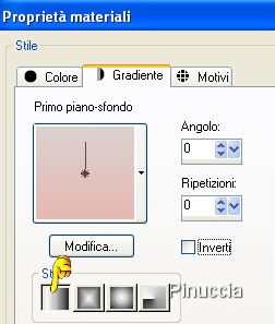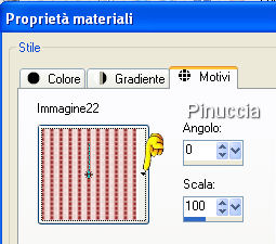 qui puoi trovare qualche risposta ai tuoi dubbi. Se l'argomento che ti interessa non è presente, ti prego di segnalarmelo. Questo tutorial è stato scritto in PSP 8.1, ma può essere eseguito anche con le altre versioni di PSP. Per tradurlo, l'ho eseguito con PSP X. Occorrente: Per questo tutorial ho usato uno Scrap kit di Scrappy Expressions http://tech.groups.yahoo.com/group/ScrappyExpressions/ Il tube è di Tutstogo Materiale qui Attenzione: i livelli dei tubes sono chiusi. Apri lo Scrap kit e i tubes in PSP. Rendi visibili tutti i livelli dei tubes. 1. Apri una nuova immagine trasparente 650 x 500 pixels. 2. Imposta il colore di primo piano con #e7b8b2, e il colore di sfondo con #dad1cf. Passa il colore di primo piano a Gradiente di primo piano/sfondo, stile lineare: ![]() 3. Attiva lo scrap kit SE_BeMine. Posizionati sul livello paper 3 e vai a Modifica>Copia. Modifica>Incolla>Incolla come nuova IMMAGINE. Imposta il colore di primo piano su Motivi e nella lista seleziona la Paper 3, con i seguenti settaggi: non la troverai sotto il nome Paper 3, ma sotto "Immagine..." con il numero che il programma assegna progressivamente a ogni immagine aperta. ![]() Riempi l'immagine trasparente con questo motivo.4. Selezione>Seleziona tutto. Selezione>Modifica>Contrai di 45 pixels. Selezione>Inverti. Livelli>Unisci>Unisci tutto. Effetti>Effetti 3D>Ritaglio, con i seguenti settaggi, colore nero: ![]() Livelli>Nuovo livello raster. Ripeti l'Effetto Ritaglio, ma cambiando verticale e orizzontale con -2. Selezione>inverti. Attiva lo scrap kit SE_BeMine. Posizionati sul livello paper 2 e vai a Modifica>Copia e Modifica>Incolla>Incolla come nuova immagine. Imposta il colore di primo piano su Motivi, cerca e seleziona la paper 2 (che, come spiegato prima, avrà preso il nome "Immaginex"), con i seguenti settaggi: ![]() Riempi la selezione con questo motivo.Selezione>Modifica>Contrai di 15 pixels. Mantieni selezionato. 6. Attiva lo scrap kit SE_BeMine. Posizionati sul livello paper 1 e vai a Modifica>Copia e Modifica>Incolla>Incolla come nuova immagine. Imposta il colore di primo piano su Motivi e seleziona la Paper 1, con i seguenti settaggi. ![]() Riempi la selezione con questo motivo.Selezione>Nessuna selezione. ![]() 7. Attiva lo scrap kit SE_BeMine. Posizionati sul livello Ribbon, e vai a Modifica>Copia. Torna al tuo lavoro e vai a Modifica>Incolla>Incolla come nuovo livello. Spostalo in alto accostato alla cornice interna, vedi il mio esempio.8. Attiva lo strumento Selezione , rettangolo,e seleziona la prima "be mine" e premi il tasto canc ![]() seleziona l'ultima "be mine" e premi il tasto canc. Attiva lo strumento Deformazione ,puntatore se stai usando PSP X,e "tira" un po' il nastro per adattarlo alla lunghezza della cornice interna (vedi il mio esempio). ![]() 9. Attiva lo scrap kit SE_BeMine. Posizionati sul livello ChipboardFrame, e vai a Modifica>Copia. Torna al tuo lavoro e vai a Modifica>Incolla>Incolla come nuovo livello. Immagine>Ridimensiona, tutti i livelli non selezionato, una volta al 75%, e una volta al 95%. Regola>Messa a fuoco>Metti a fuoco. Sposta la cornice a sinistra.10. Attiva lo strumento Selezione , rettangolo,e traccia una selezione all'interno della cornice. Selezione>Modifica>Espandi, di 2 pixels. Livelli>Nuovo livello raster. Livelli>Disponi>Sposta giù. Passa il colore di primo piano al Gradiente che hai impostato all'inizio del tutorial, e riempi la selezione con il gradiente.Selezione>Nessuna selezione. 11. Apri il tube man-woman, e vai a Modifica>Copia. Torna al tuo lavoro e vai a Modifica>Incolla>Incolla come nuovo livello. Immagine>Ridimensiona, al 35%, tutti i livelli non selezionato. Sistema il tube all'interno della cornice.Attiva lo strumento Selezione , rettangolo,e traccia una selezione all'interno della cornice. Selezione>Inverti. Assicurati di essere posizionato sul livello del tube man-woman e premi sulla tastiera il tasto CANC ![]() In questo modo avrai eliminato ogni traccia del tube all'esterno della cornice. 12. Attiva il livello della cornice e vai a Livelli>Unisci>Unisci giù. Ripeti Livelli>Unisci>Unisci giù. 13. Effetti>Effetti 3D>Sfalsa ombra, con i seguenti settaggi, colore nero. ![]() Ripeti l'Effetto Sfalsa ombra, cambiando verticale e orizzontale con -2. 14. Attiva lo scrap kit SE_BeMine. Posizionati sul livello bow1 e vai a Modifica>copia. Torna al tuo lavoro e vai a Modifica>Incolla>Incolla come nuovo livello. Immagine>Ridimensiona, al 45%, tutti i livelli non selezionato. Livelli>Duplica. Immagine>Ruota>Ruota per gradi, 30 gradi a sinistra, tutti i livelli non selezionato. ![]() Sposta questo nastro a sinistra della cornice (vedi il mio esempio).Lascia l'altro nastro dove sta, lo sposterai dopo. 15. Attiva lo scrap kit SE_BeMine. Posizionati sul livello gem e vai a Modifica>Copia. Torna al tuo lavoro e vai a Modifica>Incolla>Incolla come nuovo livello. Sposta la gemma sulla cornice, in basso a destra, o dove preferisci.16. Attiva lo scrap kit SE_BeMine. Posizionati sul livello tag2, e vai a Modifica>Copia. Torna al tuo lavoro e vai a Modifica>Incolla>Incolla come nuovo livello. Immagine>Ridimensiona, al 90%, tutti i livelli non selezionato. Regola>Messa a fuoco>Metti a fuoco. Sposta la targhetta a destra, al centro dell'immagine.Effetti>Effetti 3D>Sfalsa ombra, con i settaggi usati al passo 13. 17. Adesso attiva il livello del nastro che hai lasciato in sospeso al punto 14, e vai a Livelli>Disponi>Porta in alto. Posiziona il nastro sopra la targhetta.18. Attiva lo strumento Testo .Apri il font fornito con il materiale, e minimizzalo nella tua area di lavoro, per ritrovarlo nella lista dei font disponibili. Seleziona il font CandyTime, crea come vettore, dimensione 36, ![]() Chiudi il colore di primo piano e scrivi sulla targhetta FOREVER, andando a capo a ogni lettera, oppure impostando lo strumento Testo con la direzione verticale .Livelli>Converti in livello raster. Effetti>Effetti 3D>Sfalsa ombra, con i seguenti settaggi, colore nero:
