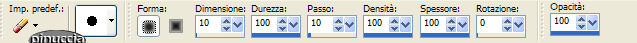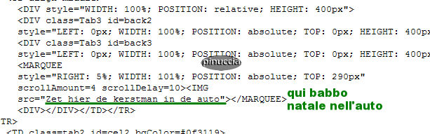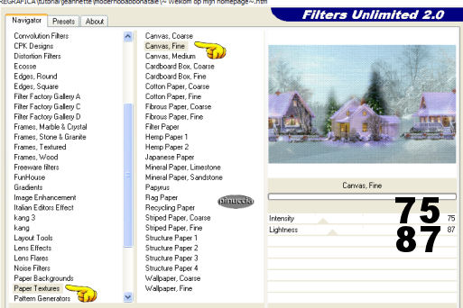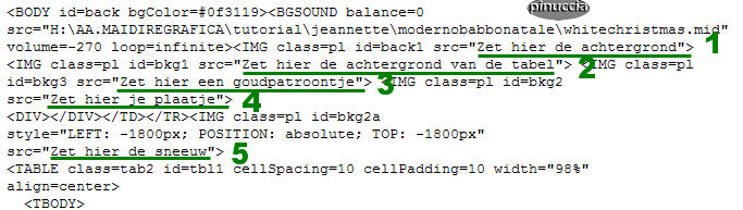 qui puoi trovare qualche risposta ai tuoi dubbi. Se l'argomento che ti interessa non č presente, ti prego di segnalarmelo. Clicca sull'immagine per visualizzare lo script. Occorrente: Materiale qui I tubes dell'auto e di Babbo Natale sono di Filly. Filtro Unlimited 2 qui 1. Apri il file "Foto Voortuin". Sarā l'immagine sulla quale lavorerai. 2. Apri il tube Wintersnow-sandi e vai a Modifica>copia. Torna al tuo lavoro e vai a Modifica>Incolla>Incolla come nuovo livello. Posizionalo al centroApri il tube Huisje1 e vai a Modifica>Copia. Torna al tuo lavoro e vai a Modifica>Incolla>Incolla come nuovo livello. Posizionalo sulla sinistra.Livelli>Duplica e sposta a destra.3. Livelli>Unisci>Unisci tutto. ![]() 4. Effetti>Plugins>Filters Unlimited - Paper Textures - Canvas Fine: ![]() La prima immagine per lo script č pronta. Salva l'immagine in formato jpg. Adesso farai il Babbo Natale. 5. Apri il tube dell'automobile. 6. Apri il tube di babbo natale e vai a Modifica>Copia. Torna all'immagine dell'auto e vai a Modifica>Incolla>Incolla come nuovo livello. Posiziona il Babbo Natale nell'automobile.7. Nella paletta dei livelli cambia l'opacitā di questo livello al 50%. 8. Con lo strumento Gomma , cancella delicatamente la parte di babbo natale che copre la vettura.![]() 9. Riporta l'opacitā del livello al 100%. 10. Livelli>Unisci>Unisci visibile. 11. Immagine>Ridimensiona, a 220 pixels di altezza. Regola>Messa a fuoco>Metti a fuoco. Salva in formato gif. Adesso dovrai fare la neve. 12. Apri una nuova immagine nera 200 x 200 pixels. 13. Livelli>Nuovo livello raster. Riempi il nuovo livello con il bianco.14. Nella paletta dei livelli cambia la modalitā di miscelatura di questo livello in Dissolvi e abbassa l'opacitā al 4%. ![]() 15. Immagine>Ridimensiona, 600 x 600 pixels. 16. Attiva lo strumento Gomma , con i seguenti settaggi:![]() 17. Usa la gomma sull'immagine in modo da ottenere qualcosa di simile a questo: ![]() 18. Elimina il livello dello sfondo nero. 19. Immagine>Ridimensiona, a 200x200. Salva in formato gif. ![]() Per lo script avrai bisogno oltre alle immagini appena salvate, di due sfondi e un pattern oro. ![]() Apri lo script di Jeannette che trovi (ho tolto il link perchč il sito č chiuso, ma lascia le istruzioni che possono servire per casi simili) e segui i preliminari descritti alla fine di questo tutorial, fino all'inserimento dello sfondo-suono. Dopo aver inserito lo sfondo-suono, dovrai indicare allo script dove trovare le immagini. Clicca sulla linguetta Origine e identifica i punti di inserimento. (se hai messo i files nella stessa cartella, sarai facilitato dal fatto che, dopo aver inserito la musica, da questa potrai ricavare il percorso degli altri files, cambiando soltanto la parte finale, nomefile.estensione) Nelle schermate sotto, sono indicati i punti di inserimento dei files dello script. Devi cancellare la scritta tra le virgolette e inserire il tuo percorso: 1=qui inserisci lo sfondo.