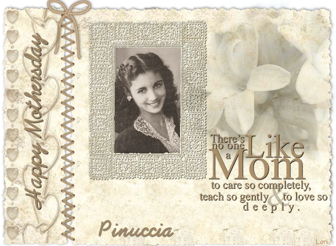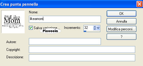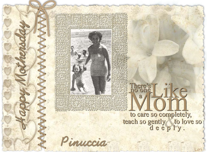 qui puoi trovare qualche risposta ai tuoi dubbi. Se l'argomento che ti interessa non è presente, ti prego di segnalarmelo. Occorrente: Materiale: qui Apri i tubes in PSP. Apri il template. Questa sarà la tua area di lavoro. Apri LaceCorners. Attiva il livello "Layer 5" e vai a Modifica>Copia. Torna al template e vai a Modifica>Incolla>Incolla come nuovo livello. Livelli>Duplica. Immagine>Rifletti. Immagine>Capovolgi. Sposta i livelli in modo che combacino, ma non si sovrappongano.Chiudi il livello di sfondo. Livelli>Unisci>Unisci visibile. Rendi nuovamente visibile il livello di sfondo. Eventualmente, se vuoi, puoi spostare la cornice dove preferisci.Effetti>Effetti 3D>sfalsa ombra, con i seguenti settaggi, colore nero. ![]() Abbassa l'opacità di questo livello al 65%. Attiva il livello di sfondo. Attiva il tube MaryAlice-OceanGirl, (oppure, se vuoi, una tua immagine a scelta) e vai a Modifica>Copia. Torna al tuo lavoro e vai a Modifica>Incolla>Incolla come nuovo livello. Sposta l'immagine nella cornice.Eventualmente, ridimensiona l'immagine. Attiva lo strumento Selezione e seleziona tutto ciò che è all'esterno della cornice.![]() Premi sulla tastiera il tasto CANC ![]() Ottieni lo stesso risultato se prima di incollare l'immagine selezioni l'interno della cornice con la bacchetta magica ![]() Dopo aver incollato il tube come nuovo livello, sistemalo nella cornice e poi vai a Selezione>Inverti e premi sulla tastiera il tasto canc. Apri il tube dei cuori (w318) e vai a Modifica>Copia. Torna al tuo lavoro e vai a Modifica>Incolla>Incolla come nuovo livello. Spostalo a sinistra.Abbassa l'opacità di questo livello al 65%. Apri il tube di Ametista con il fiore e vai a Modifica>Copia. Torna al tuo lavoro e vai a Modifica>Incolla>Incolla come nuovo livello. Spostalo a destra.Cambia la modalità di miscelatura di questo livello in Luminanza (esistente) e abbassa l'opacità al 50%. Eventualmente seleziona la parte del tube che rimane fuori dalla cornice, ed eliminala.Apri il file di testo NoOneLikeMom e vai a Modifica>Copia. Torna al tuo lavoro e vai a Modifica>Incolla>Incolla come nuovo livello. Spostalo dove preferisci.Se vuoi usare il testo con un altro colore, crea dal testo un pennello personalizzato. Clicca su Esporta>Come pennello personalizzato: ![]() assegna un nome al pennello e clicca ok. ![]() Apri il file di testo Happy mothersday e vai a Modifica>Copia. Torna al tuo lavoro e vai a Modifica>Incolla>Incolla come nuovo livello. Spostalo a sinistra.Naturalmente, se preferisci, puoi usare altri testi. Io ho scelto il font AbrazoScriptSSK, dimensione 48. Aggiungi il tuo nome o il tuo watermark. Livelli>Unisci>Unisci tutto. Esempi con foto di famiglia. Qui sono io, da piccola, con la mia mamma. ![]() Qui è la mia mamma quando aveva 14 anni. ![]() ![]() Se hai problemi o dubbi, o trovi un link non funzionante, o anche soltanto per un saluto, scrivimi 3 Maggio 2007 |