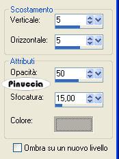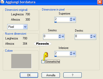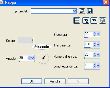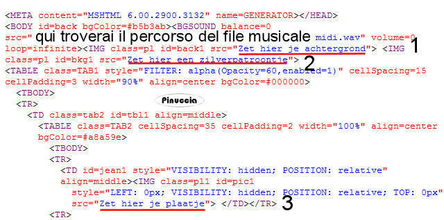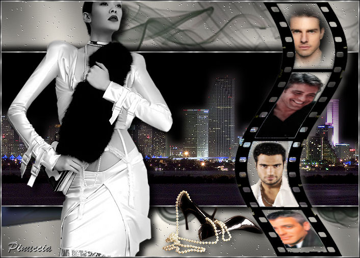 qui puoi trovare qualche risposta ai tuoi dubbi. Se l'argomento che ti interessa non è presente, ti prego di segnalarmelo. Occorrente: Materiale qui I tubes usati per questo tutorial sono di Filly, Brigitte, Lisa e altri. Filtro: Greg's Factory Output II qui Imposta il colore di primo piano con #B2AFA8, e il colore di sfondo con #000000. 1. Apri una nuova immagine trasparente 700 x 300 pixels, e riempila con il nero.il nero è impostato come colore di sfondo, quindi per riempire devi cliccare con il tasto destro del mouse. 2. Apri il tube della città "LisaG_Tubes_SeriesMisted_CityScape". Posizionati sul livello del tube e vai a Modifica>Copia. Torna al tuo lavoro e vai a Modifica>Incolla>Incolla come nuovo livello. Sposta l'immagine a destra.Regola>Messa a fuoco>Metti a fuoco. 3. Livelli>Duplica. 4. Immagine>Rifletti. Sposta l'immagine riflessa completamente a sinistra,in modo che i due tubes siano appoggiati uno contro l'altro. 5. Livelli>Unisci>Unisci tutto. 6. Immagine>Aggiungi bordatura, simmetriche non selezionato, con il colore di primo piano e i seguenti settaggi: ![]() 7. Seleziona i due bordi con la bacchetta magica , tenendo premuto il tasto della maiuscola.Imposta il colore di primo piano su Motivi, e seleziona un motivo argento. Riempi i due bordi con questo motivo.Selezione>Nessuna selezione. Metti da parte l'immagine, per il momento. 8. Apri una nuova immagine con il colore di primo piano 700 x 500 pixels. 9. Effetti>Plugins>Greg's Factory Output - Poolshadow, con i seguenti settaggi: ![]() 10. Effetti>Effetti di trama>Nappa, con il colore standard (#dcdcdc), e con i seguenti settaggi: ![]() 11. Apri il tube di Brigitte con il velo (MTMtransparante tube) e vai a Modifica>Copia. Torna al tuo lavoro e vai a Modifica>Incolla>Incolla come nuovo livello. Immagine>Ridimensiona, una volta al 150%, e una volta al 120%, tutti i livelli non selezionato. Spostalo contro il bordo in alto a destra.12. Abbassa l'opacità di questo livello al 70%. 13. Apri l'immagine che hai messo da parte al punto 7 e vai a Modifica>Copia. Torna al tuo lavoro e vai a Modifica>Incolla>Incolla come nuovo livello. 14. Effetti>Effetti 3D>Sfalsa ombra, con i seguenti settaggi. ![]() Ripeti l'Effetto Sfalsa ombra, ma cambiando verticale e orizzontale a -10. 15. Apri il tube di Filly "Tube Filly(1028)" e vai a Modifica>Copia. Torna al tuo lavoro e vai a Modifica>Incolla>Incolla come nuovo livello. Spostalo a sinistra.Regola>Messa a fuoco>Metti a fuoco. 16. Effetti>Effetti 3D>Sfalsa ombra: ![]() 17. Apri il tube delle scarpe e vai a Modifica>Copia. Torna al tuo lavoro e vai a Modifica>Incolla>Incolla come nuovo livello. Sposta il tube in basso.18. Effetti>Effetti 3D>Sfalsa ombra: ![]() Regola>Messa a fuoco>Metti a fuoco, 1 o 2 volte. 19. Apri il tube della pellicola "filmstrip". Elimina il livello del watermark. 20. Tenendo premuto il tasto maiuscola, clicca con la bacchetta magica ,sui fotogrammi del film per selezionarli. se imposti la bacchetta in modalità Aggiungi, non è necessario tenere premuto il tasto shift. ![]() 21. Livelli>Nuovo livello raster. Riempi questo livello con il colore di primo piano.Riempi tutti i fotogrammi. 22. Ripeti i punti 9 e 10. 23. Nella paletta dei livelli chiudi il livello superiore, e attiva il livello inferiore. ![]() Selezione>Nessuna selezione. 24. Clicca con la bacchetta magica sul primo fotogramma per selezionarlo.25. Apri il tube "Man1" e vai a Modifica>Copia. Torna al film e vai a Modifica>Incolla>Incolla nella selezione. Selezione>Nessuna selezione. 26. Clicca con la bacchetta magica sul secondo fotogramma.27. Apri il tube man2 e vai a Modifica>Copia. Torna al film e vai a Modifica>Incolla>Incolla nella selezione. Selezione>Nessuna selezione. 28. Ripeti la stessa operazione con i tubes "Man3" e "Man4". 29. Selezione>Nessuna selezione. 30. Riapri il livello superiore e vai a Livelli>Disponi>Sposta sotto. ![]() 31. Livelli>Unisci>Unisci visibile. 32. Modifica>Copia. Torna al tuo lavoro e vai a Modifica>Incolla>Incolla come nuovo livello. Sposta il film sul lato destro del tuo lavoro.34. Effetti>Effetti 3D>Sfalsa ombra, con i seguenti settaggi, con il colore di primo piano. ![]() 34. Livelli>Unisci>Unisci tutto. 35. Immagine>Aggiungi bordatura, 2 pixels, simmetriche, con il colore rosso. Seleziona il bordo con la bacchetta magica ,e riempilo con il motivo argento.Selezione>Nessuna selezione. 36. Immagine>Aggiungi bordatura, 1 pixel, simmetriche, con il colore nero. L'immagine è finita. Se vuoi realizzare lo script di Jeannette, ti servono anche un'immagine di sfondo e un motivo argento. Per eseguire lo script Apri lo script di Jeannette che trovi qui, e segui i preliminari descritti alla fine di questo tutorial, fino all'inserimento dello sfondo-suono. Dopo aver inserito lo sfondo-suono, dovrai indicare allo script dove trovare le immagini. Clicca su Origine e identifica i punti di inserimento dei vari elementi dello script. Se hai messo tutti i file in una cartella, il percorso del suono ti servirà da guida per l'inserimento degli altri files: ti basterà cambiare l'ultima parte: il nome e l'estensione. Nella schermata sotto sono indicati i punti in cui dovrai inserire, tra le virgolette, il percorso delle due immagini di sfondo, e dell'immagine principale. 1. Qui inserisci il percorso dell'immagine di sfondo. 2. Qui inserisci il percorso del motivo argento, che servirà per le tabelle. 3. Qui inserisci il percorso dell'immagine principale. ![]() Ricorda che, contemporaneamente, puoi controllare il risultato andando su Anteprima. fai molta attenzione alle estensioni dei files e alle maiuscole-minuscole, che devono essere corrette, altrimenti lo script non troverà le immagini da inserire Clicca adesso sulla linguetta Modifica, per aggiungere il testo. clicca due volte all'interno del riquadro. Apparirà la cornice che ti dà il via libera per sostituire il testo esistente e aggiungere il tuo. Quando hai finito, clicca all'esterno e la cornice sparirà. Il tuo messagg