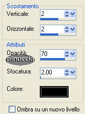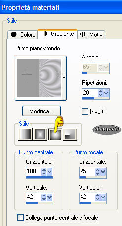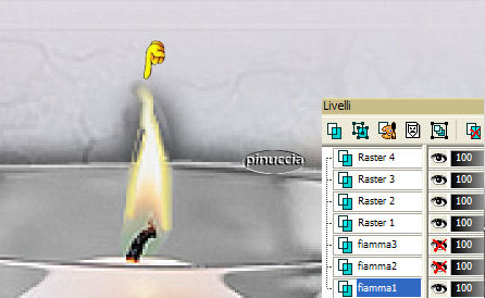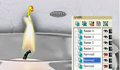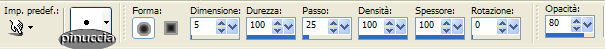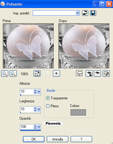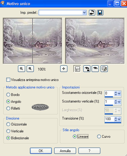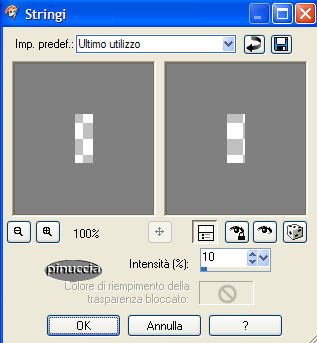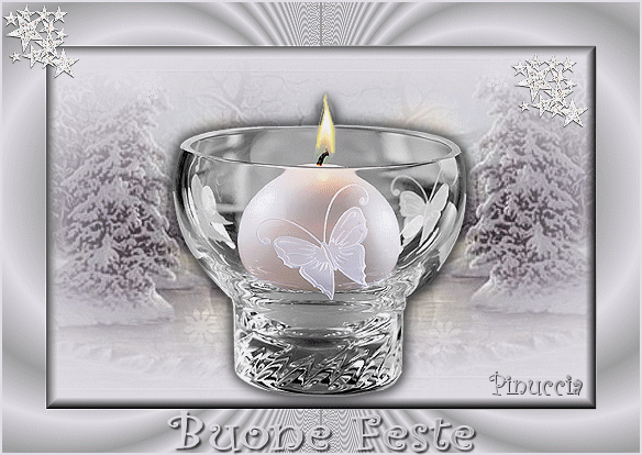 qui puoi trovare qualche risposta ai tuoi dubbi. Se l'argomento che ti interessa non è presente, ti prego di segnalarmelo. Materiale qui Il bel tube usato è di Hanne. Non aprire la gif "Sneeuw" in PSP, serve - se vorrai farlo - per lo script. Imposta il colore di primo piano con #9E9E9E, e il colore di sfondo con #E0DDE4. Passa il colore di primo piano a gradiente di primo piano/sfondo, stile sprazzo di luce, con i seguenti settaggi: ![]() 1. Apri il tube "Winter", duplicalo (shift+D) e metti da parte la copia. 2. Continua a lavorare sull'originale: Livelli>Nuovo livello raster. Riempi con il colore di sfondo.3. Livelli>Disponi>Sposta giù. Posizionati sul livello del tube e vai a Regola>Messa a fuoco>Metti a fuoco. 4. Livelli>Duplica. 5. Immagine>Rifletti. Sposta le due immagini come mostrato in schermata:![]() 6. Apri il tube con la candela "H@nne_glas2". Immagine>Ridimensiona, a 330 pixels di altezza. Regola>Messa a fuoco>Metti a fuoco. 7. Modifica>Copia. Torna al tuo lavoro e vai a Modifica>Incolla>Incolla come nuovo livello. Sposta l'immagine in basso.8. Effetti>Effetti 3D>Sfalsa ombra, con i seguenti settaggi: ![]() Ripeti l'Effetto Sfalsa ombra, ma cambiando verticale e orizzontale a -2. 9. Livelli>Unisci>Unisci visibile. 10. Effetti>Effetti 3D>Pulsante, con i seguenti settaggi: ![]() 11. Immagine>Aggiungi bordatura, 40 pixels, simmetriche, con il colore di primo piano. 12. Seleziona il bordo con la bacchetta magica .Livelli>Nuovo livello raster. Riempi con il gradiente.Regola>Messa a fuoco>Metti a fuoco. 13. Selezione>Nessuna selezione. 14. Clicca con la bacchetta magica sulla parte grigia.![]() Premi sulla tastiera il tasto CANC. 15. Ti sembrerà che non sia successo niente, ma non è così. Va tutto bene. 16. Livelli>Duplica. 17. Immagine>Rifletti. Avrai questo: ![]() 18. Livelli>Unisci>Unisci tutto. 19. Immagine>Aggiungi bordatura, 2 pixels, simmetriche, con il colore di sfondo. 20. Apri il tube "Sterretjes1" e vai a Modifica>Copia. Torna al tuo lavoro e vai a Modifica>Incolla>Incolla come nuovo livello. Modifica>Ripeti Incolla nuovo livello. Posiziona i due tubes,vedi come esempio il lavoro finale. 21. Chiudi il colore di primo piano e attiva lo strumento Testo ![]() Scegli un bel font e scrivi un testo. 22. Effetti>Effetti 3D>Sfalsa ombra, con i seguenti settaggi: ![]() 23. Adesso dovrai animare la fiammella della candela. Attiva lo strumento Selezione a mano libera , punto a punto.24. Traccia una linea intorno alla fiammella: ![]() 25. Livelli>Duplica, 2 volte. Avrai così 3 livelli. Posizionati sul livello superiore per attivarlo. 26. Effetti>Effetti di distorsione>Stringi: ![]() Imposta l'intensità a 10: ![]() 27. Posizionati sul secondo livello. Effetti>Effetti di distorsione>Stringi, e imposta l'intensità a 50. 28. Posizionati sul terzo livello. Effetti>effetti di distorsione>Stringi e imposta l'intensità a 100. 29. Selezione>Nessuna selezione. 30. Sempre posizionato sul primo livello della fiammella: 31. Attiva lo strumento Sbavatura: ![]() con i seguenti settaggi: ![]() 32. Posizionati sul primo livello della fiammella e tira la punta un po' verso l'alto. ![]() 33. Posizionati sul secondo livello. Tira un po' la fiamma verso sinistra, per dare l'impressione del fuoco che brucia. ![]() 34. Visualizza tutti i livelli tranne il secondo e il terzo livello della fiamma. ![]() Modifica>Copia Unione. Apri Animation Shop e vai a Modifica>Incolla come nuova animazione. Ritorna in PSP. Chiudi il primo livello fiamma e attiva il secondo. ![]() Modifica>Copia Unione. In Animation Shop: Modifica>Incolla>Incolla dopo il fotogramma corrente. Torna in PSP. Chiudi il secondo livello fiamma e attiva il terzo. ![]() Modifica>Copia unione. Ancora in Animation Shop: Modifica>Incolla>Incolla dopo il fotogramma corrente. La tua animazione è fatta. Salva in formato gif. ![]() Per realizzare lo script, ti serve un'immagine di sfondo. 36. Apri nuovamente il tube "Winter". Livelli>Nuovo livello raster. Riempi con il colore di sfondo.37. Livelli>Disponi>Sposta giù. Livelli>Unisci>Unisci tutto. 38. Effetti>Effetti di immagine>Motivo Unico, con i seguenti settaggi: ![]() 39. Questo è lo sfondo che ti servirà per lo script. Per lo script, oltre all'animazione e allo sfondo che hai creato con questo tutorial, avrai bisogno di una trama. (Se vuoi usare la mia, la trovi qui), e della gif "sneeuw1", che trovi nello zip) ![]() Apri lo script di Jeannette che trovi qui (ho tolto il link perchè il sito è chiuso, ma mantengo le istruzioni che possono servire per casi simili) e segui i preliminari descritti alla fine di questo tutorial, fino all'inserimento dello sfondo-suono. Dopo aver inserito lo sfondo-suono, dovrai indicare allo script dove trovare le immagini. Clicca sulla linguetta Origine e identifica i punti di inserimento. (se hai messo i files nella stessa cartella, sarai facilitato dal fatto che, dopo aver inserito la musica, da questa potrai ricavare il percorso degli altri files, cambiando soltanto la parte finale, nomefile.estensione) Nelle schermate sotto, sono indicati i punti di inserimento dei files dello script. Devi cancellare la scritta tra le virgolette e inserire il tuo percorso: 1=qui inserisci l'immagine di sfondo che hai creato con il tutorial.