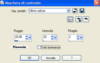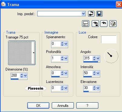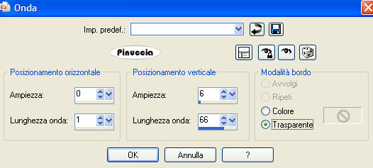qui puoi trovare qualche risposta ai tuoi dubbi. Se l'argomento che ti interessa non è presente, ti prego di segnalarmelo. Questo tutorial è stato scritto con PSP X, ma può essere eseguito anche con le altre versioni di PSP. Materiale qui Grazie a Dragonblu per i suoi straordinari mist. 1. Metti la trama nella cartella Trame di PSP. 2. Apri il file di sfondo sax_hg. Duplicalo con shift+D e chiudi l'originale. La copia sarà la tua area di lavoro. 3. Effetti>Effetti di trama>Trama, cerca e seleziona la trama Tramage 75pct, con i seguenti settaggi: ![]() 4. Apri il tube della donna e vai a Modifica>Copia. Torna al tuo lavoro e vai a Modifica>Incolla come nuovo livello. Sposta il tube a destra.Abbassa l'opacità di questo livello al 70%. Apri il tube "Natur01" e vai a Modifica>Copia. Torna al tuo lavoro e vai a Modifica>Incolla come nuovo livello. Spostalo a sinistra.5. Attiva lo strumento Testo , scegli un bel font e scrivi il tuo testo.Io ho usato due font standard di Windows: Bauhaus93 e Vivaldi, colore di primo piano nero, colore di sfondo #b4c2a2. Livelli>Unisci>Unisci tutto. 6. Immagine>Aggiungi bordatura, 30 pixels, simmetriche, con un colore qualsiasi, purchè non presente nell'immagine. Seleziona il bordo con la bacchetta magica ![]() Attiva nuovamente l'immagine di sfondo Sax_hg e vai a Modifica>Copia. Torna al tuo lavoro e vai a Modifica>Incolla nella selezione. Mantieni selezionato. 7. Effetti>Effetti di distorsione>Onda, con i seguenti settaggi: ![]() Se stai usando PSP 9, imposta Trasparenza. 8. Effetti>Effetti 3D>Sfalsa ombra, con i seguenti settaggi, con un colore chiaro scelto dalla tua immagine. ![]() 9. Selezione>Deseleziona. Immagine>Ridimensiona, come preferisci (io ho ridimensionato a 650 pixels di larghezza). Eventualmente: Regola>Messa a fuoco>Maschera di contrasto: ![]() Aggiungi la tua firma o il tuo watermark e salva in formato jpg. ![]() Se hai problemi o dubbi, o trovi un link non funzionante, scrivimi 30 Aprile 2007 |