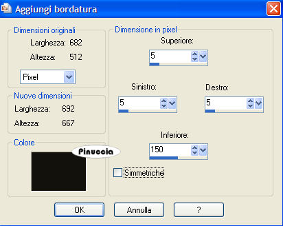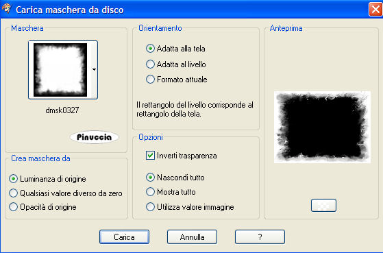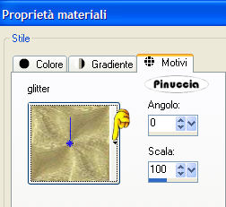 qui puoi trovare qualche risposta ai tuoi dubbi. Se l'argomento che ti interessa non è presente, ti prego di segnalarmelo. Materiale qui Metti la maschera nella cartella Maschere di PSP. Apri il motivo "glitter" e minimizzalo nella tua area di lavoro. Lo troverai nella lista dei motivi disponibili, quando ti servirà. Imposta il colore di primo piano con #948157. Imposta il colore di sfondo con #15120d. 1. Apri l'immagine di sfondo ph37931. Questa sarà la tua area di lavoro. 2. Regola>Saturazione e tonalità>Viraggio: ![]() 3. Livelil>Nuovo livello raster. Riempi il nuovo livello con il colore di sfondo.per riempire con il colore di sfondo, devi cliccare con il tasto destro del mouse. 4. Livelli>Carica/Salva maschera>Carica maschera da disco. Cerca e carica la maschera dsmk 0327. ![]() 5. Apri il tube jet-woman e vai a Modifica>Copia. Torna al tuo lavoro e vai a Modifica>Incolla>Incolla come nuovo livello. Sposta il tube a destra.6. Livelli>Unisci>Unisci tutto. 7. Immagine>Ridimensiona, all'85%, tutti i livelli selezionato. Regola>Messa a fuoco>Metti a fuoco. 8. Immagine>Aggiungi bordatura, 1 pixel, simmetriche, con il colore di primo piano. per aggiungere i bordi con i colori impostati nella paletta dei materiali, vedi qui Immagine>Aggiungi bordatura, simmetriche non selezionato, con il colore di sfondo e con i seguenti settaggi: ![]() 9. Apri HDDAlphabet 03. Nella paletta dei livelli attiva il livello con la lettera N e vai a Modifica>Copia. Torna al tuo lavoro e vai a Modifica>Incolla>Incolla come nuovo livello. Immagine>Ridimensiona, al 70%, tutti i livelli non selezionato. Posiziona la lettera sul bordo inferiore.Ripeti il passo 9 per tutte le altre lettere che compongono la parola NATURE. (Natura, se vuoi scriverlo in italiano). 10. Quando hai finito, chiudi il livello di sfondo nella paletta dei livelli. Posizionati su uno degli altri livelli e vai a Livelli>Unisci>Unisci visibile. 11. Regola>Messa a fuoco>Metti a fuoco. 12. Riapri il livello di sfondo. Livelli>Unisci>Unisci tutto. 13. Immagine>Aggiungi bordatura, 15 pixels, simmetriche, con il colore di primo piano. Seleziona il bordo con la bacchetta magica ![]() Passa il colore di primo piano a Motivi. Apri il menu cliccando sulla freccia a fianco del box e seleziona il motivo "Glitter": ![]() Riempi la selezione con questo motivo.14. Selezione>Nessuna selezione. 15. Immagine>Aggiungi bordatura, 5 pixels, simmetriche, con il colore di sfondo. Immagine>Aggiungi bordatura, 1 pixel, simmetriche, con il colore di primo piano. Immagine>Aggiungi bordatura, 30 pixels, simmetriche, con il colore di sfondo. 16. Aggiunti il tuo nome e salva in formato jpg. ![]() Se hai problemi o dubbi, o trovi un link non funzionante, o anche soltanto per un saluto, scrivimi 2 Giugno 2007 |