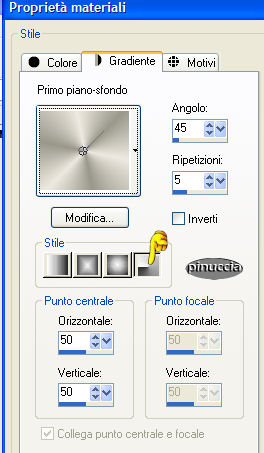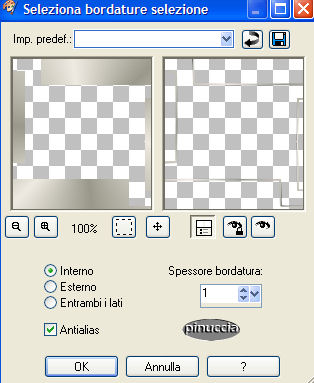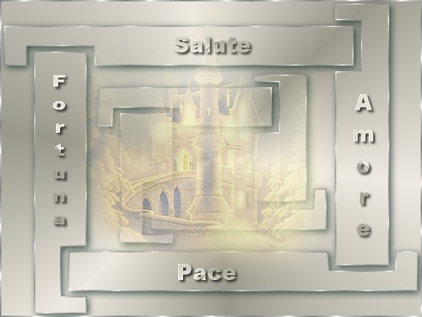 qui puoi trovare qualche risposta ai tuoi dubbi. Se l'argomento che ti interessa non è presente, ti prego di segnalarmelo. Materiale qui Il fiore è di Brigitte. Metti le forme nella cartella Forme di PSP. Imposta il colore di primo piano con #9A988B, e il colore di sfondo con #EEEAE1. Passa il colore di primo piano a gradiente di primo piano/sfondo con i seguenti settaggi: ![]() 1. Apri una nuova immagine trasparente 600 x 450 pixels, e riempila con il gradiente.2. Attiva lo strumento Forme predefinite ![]() e seleziona la forma DIV 13. ![]() Traccia la forma dall'angolo in alto a sinistra fino all'angolo in basso a destra: 3. Con la bacchetta magica clicca sui blocchi neri, tenendo premuto il tasto shift (tasto della maiuscola).![]() 4. Livelli>Nuovo livello raster. Riempi con il gradiente.5. Effetti>Effetti 3D>Sfalsa ombra: ![]() 6. Selezione>Modifica>Seleziona bordature selezione: ![]() 7. Livelli>Nuovo livello raster. Imposta il colore di sfondo con un Motivo argento. se non hai il motivo argento prendilo qui Riempi con il Motivo Argento.(avendo impostato il motivo argento come colore di sfondo, per riempire devi cliccare con il tasto destro del mouse) Fai attenzione, che tutti i bordi siano riempiti. Selezione>Nessuna selezione. 8. Il colore di sfondo è sempre impostato sul motivo Argento. 9. Immagine>Aggiungi bordatura, 2 pixels, simmetriche, con il colore nero: Seleziona il bordo con la bacchetta magica ,e riempilo con il Motivo argento (clicca con il tasto destro del mouse).10. Duplica questa immagine (shift+D) e minimizza la copia, che ti servirà per lo script. 11. Continua sull'originale. Apri il tube dell'orologio e vai a Modifica>Copia. Torna al tuo lavoro e vai a Modifica>Incolla>Incolla come nuovo livello. Effetti>Effetti 3D>Sfalsa ombra: ![]() 12. Apri il tube del fiore e vai a Modifica>Copia. Torna al tuo lavoro e vai a Modifica>Incolla>Incolla come nuovo livello. Effetti>Effetti 3D>Sfalsa ombra, con i settaggi precedenti. 13. Duplica il livello del fiore: Livelli>Duplica. Immagine>Rifletti e sposta la copia del fiore in alto: Livelli>Unisci>Unisci tutto. 14. Attiva lo strumento Testo , scegli un bel font, crea come mobile.Chiudi il colore di primo piano e scrivi il tuo testo. Effetti>Effetti 3D>Sfalsa ombra: ![]() 15. Regola>Messa a fuoco>Metti a fuoco. Selezione>Nessuna selezione. Livelli>Unisci>Unisci tutto. La tua immagine è finita. Immagine n. 2. ![]() 16. Attiva l'immagine che hai duplicato prima. Apri il tube con il castello e vai a Modifica>Copia. Torna all'immagine e vai a Modifica>Incolla>Incolla come nuovo livello. Abbassa l'opacità di questo livello al 75%. 17. Livelli>Unisci>Unisci visibile. 18. Scrivi i testi, come mostrato nell'esempio, impostando per le scritte laterali la direzione verticale. ![]() Effetti>Effetti 3D>sfalsa ombra, con i settaggi usati al passo 14. Regola>Messa a fuoco>Metti a fuoco. Unisci>Unisci tutto. E anche la seconda immagine è pronta. ![]() Per utilizzare lo script, oltre alle immagini che hai appena creato, ti servono due sfondi: uno normale e una trama. (per la trama, ho aperto una nuova immagine trasparente 100x100, l'ho riempita con il colore di sfondo,(puoi usare comunque il colore che preferisci, purchè si adatti alla tua immagine), e ho applicato il filtro Unlimited - Paper Texture - Canvas fine (puoi selezionare la trama che preferisci, con il settaggio che ti piace di più). Se vuoi usare lo script di Jeannette, clicca qui (ho tolto il link, perchè il sito è chiuso, ma mantengo le istruzioni che possono servire per casi simili) e segui i preliminari descritti alla fine di questo tutorial, fino all'inserimento dello sfondo-suono. Dopo aver inserito lo sfondo-suono, dovrai indicare allo script dove trovare le immagini. Clicca sulla linguetta Origine e identifica i punti di inserimento. (se hai messo i files nella stessa cartella, sarai facilitato dal fatto che, dopo aver inserito la musica, da questa potrai ricavare il percorso degli altri files, cambiando soltanto la parte finale, nomefile.estensione) I files necessari per lo script sono: l'immagine principale con l'orologio l'immagine con il castello, uno sfondo a tinta unita, uno sfondo trama. Nella schermata sotto, sono indicati i punti di inserimento dei files dello script. Devi cancellare la scritta tra le virgolette e inserire il tuo percorso: 1=qui inserisci lo sfondo tinta unica.