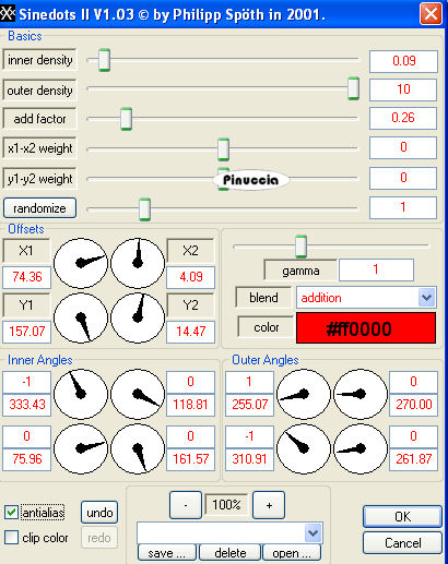 qui puoi trovare qualche risposta ai tuoi dubbi. Se l'argomento che ti interessa non è presente, ti prego di segnalarmelo. Occorrente: Materiale qui I tubes usati in questo tutorial sono di Suzi Sgai e Sin. Filtri: Greg's Factory Output II qui Dragonfly - Sinedots II qui Screenworks qui Imposta il colore di primo piano con #ff0000, e il colore di sfondo con #000000. 1. Apri una nuova immagine NERA 650 x 500 pixels. 2. Effetti>Plugins>Sinedot II: ![]() 3. Immagine>Capovolgi. 4. Livelli>Nuovo livello raster. 5. Effetti>Plugins>Sinedot II, con i settaggi precedenti (questo sarà applicato sul livello trasparente). 6. Immagine>Rifletti. 7. Apri il tube con gli occhi SS_1311 misted, e vai a Modifica>Copia. Torna al tuo lavoro e vai a Modifica>Incolla>Incolla come nuovo livello. E' già correttamente posizionato. Non occorre spostarlo. 8. Livelli>Unisci>Unisci tutto. 9. Immagine>Aggiungi bordatura, 20 pixels, simmetriche, con il colore di primo piano. 10. Seleziona il bordo con la bacchetta magica .11. Effetti>Effetti geometrici>Sfera: ![]() 12. Selezione>Nessuna selezione. 13. Attiva lo strumento Gomma